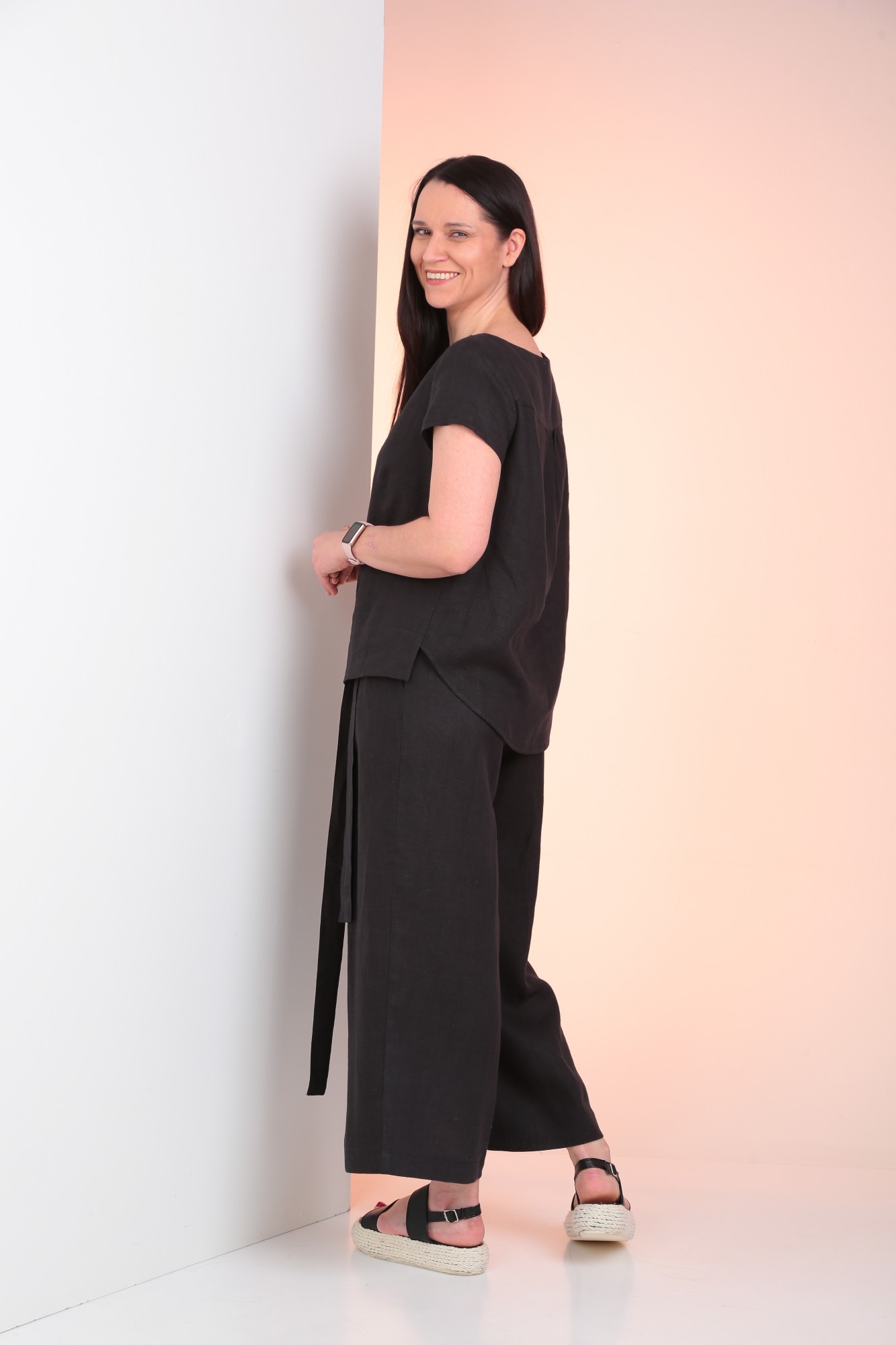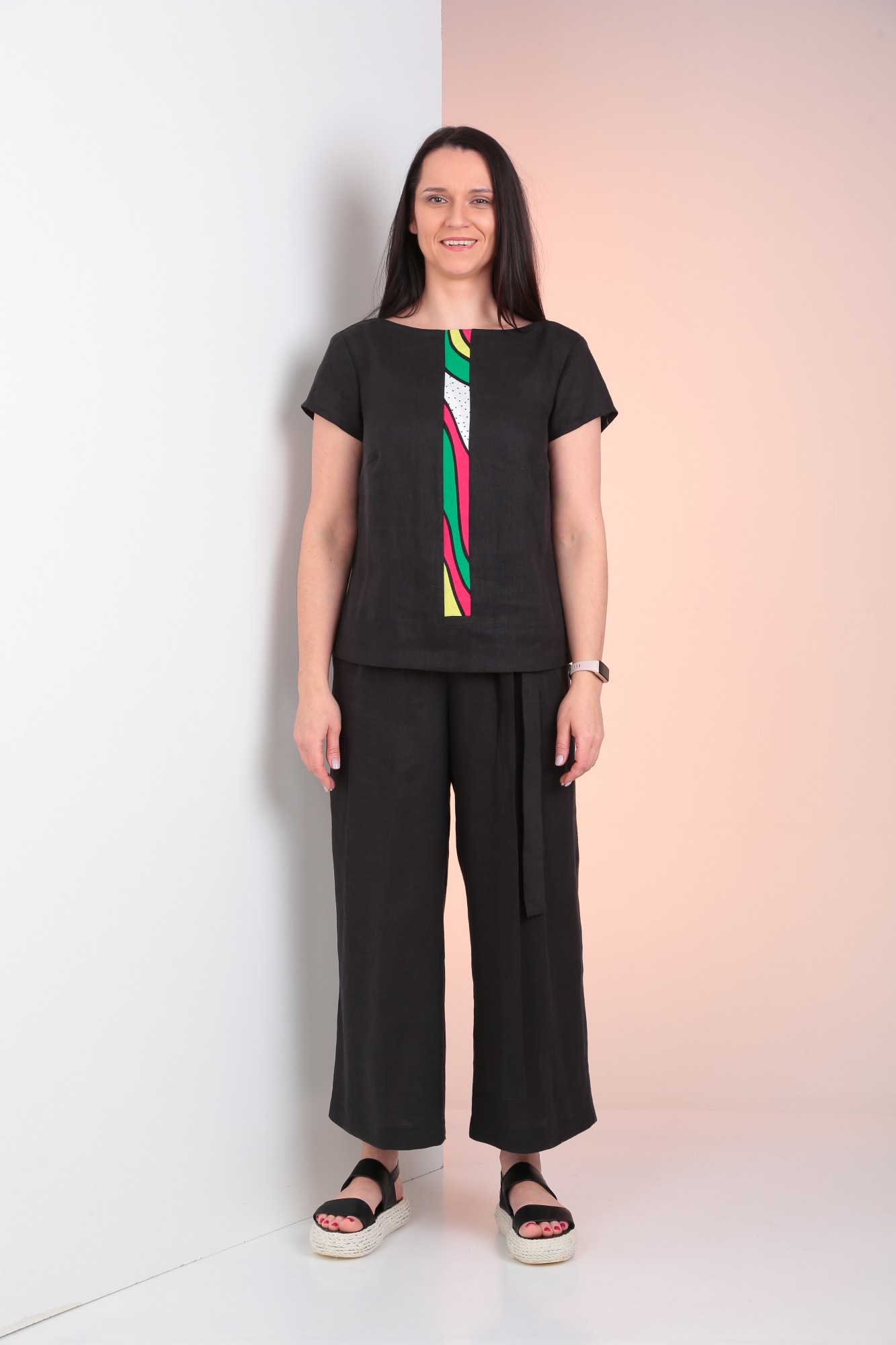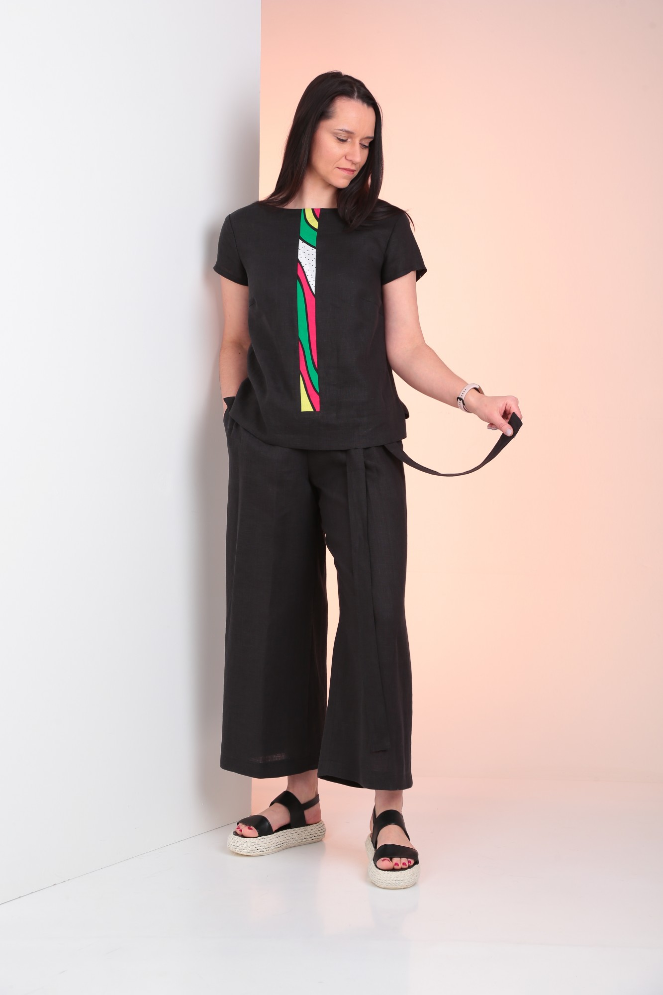 Комплект двухпредметный, состоит из блузы и кюлотов. Блуза свободного кроя, с коротким рукавом. По переду декоративная вставка. Кюлоты без застежки, верхний срез обработан поясом, который регулируется по ширине поясом. В боковых швах карманы.
