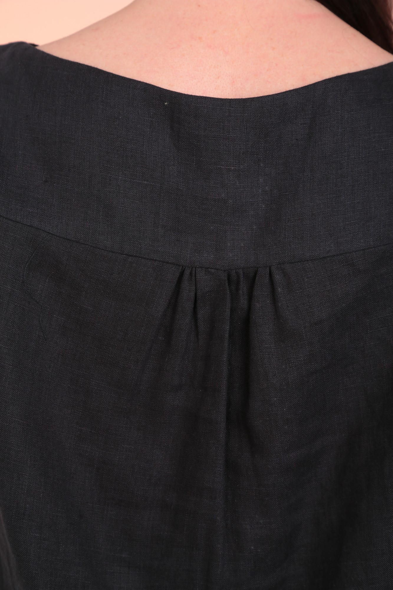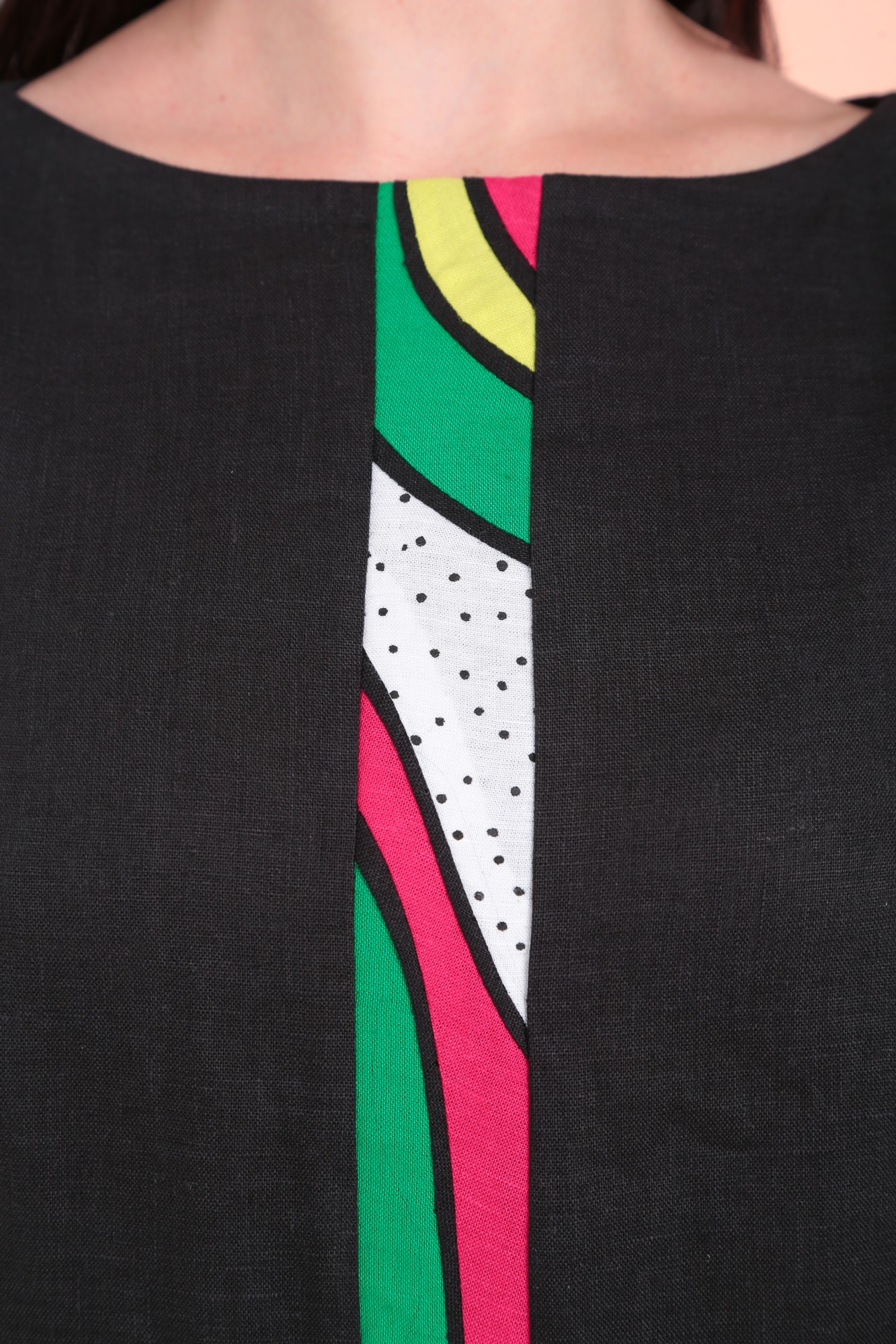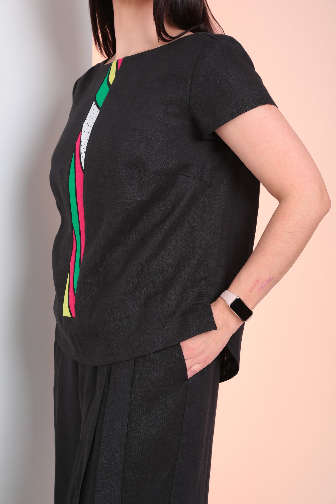Комплект двухпредметный, состоит из блузы и кюлотов. Блуза свободного кроя, с коротким рукавом. По переду декоративная вставка. Кюлоты без застежки, верхний срез обработан поясом, который регулируется по ширине поясом. В боковых швах карманы.