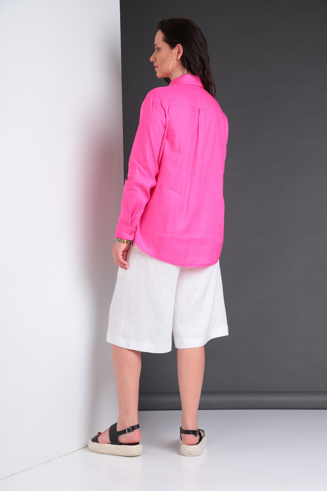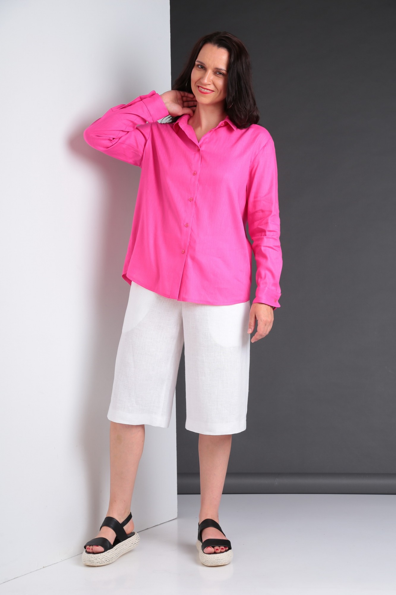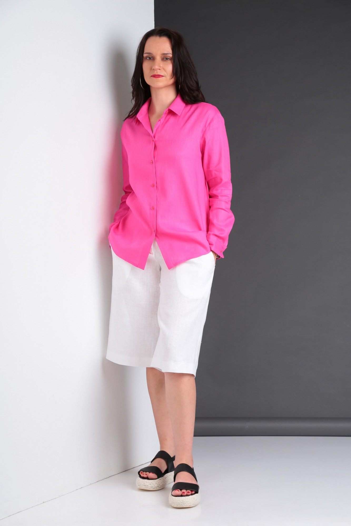 Комплект двухпредметнй состоит из рубашки и брюк. Рубашка свободного силуэта с длинным рукавом. По переду застежка на петли-пуговицы. В верхней части спинки кокетка. Воротник со стойкой, по низу рукава отрезная манжета. Бермуды прямого силуэта с боковыми карманами, застежкой -гульфиком и отрезной кокеткой по линии талии шириной 9 см.