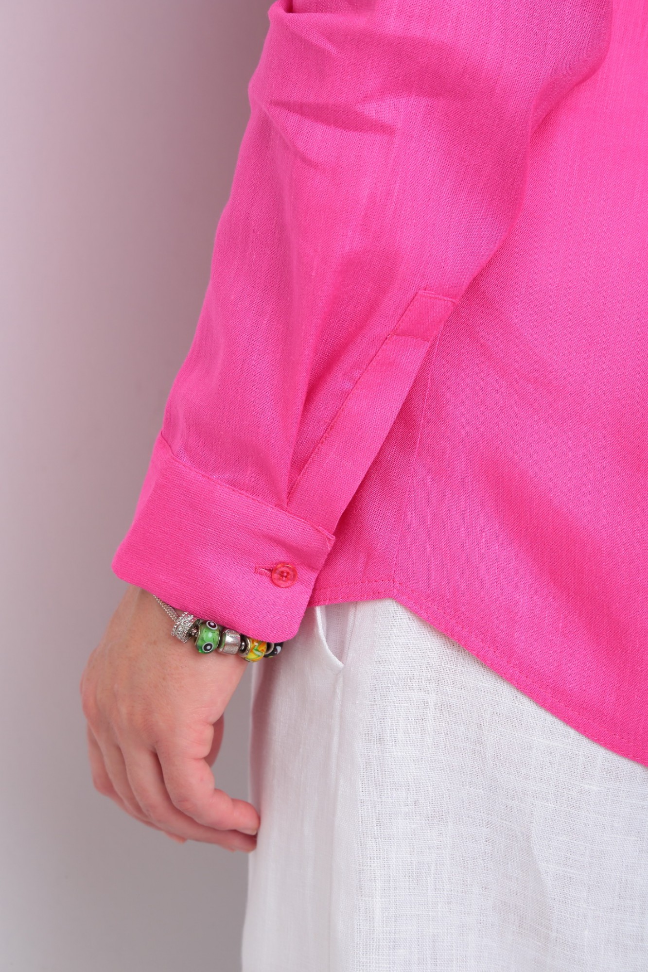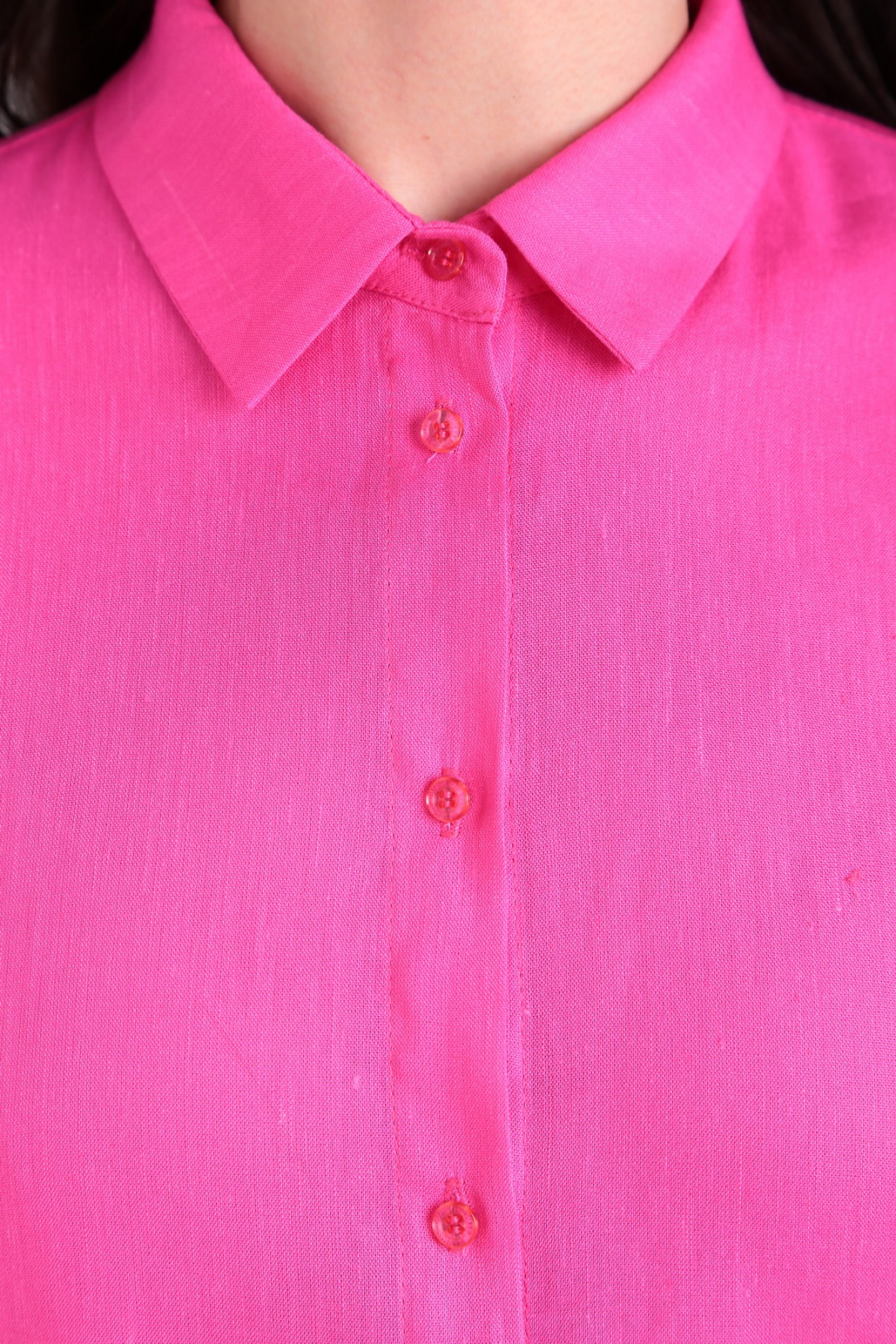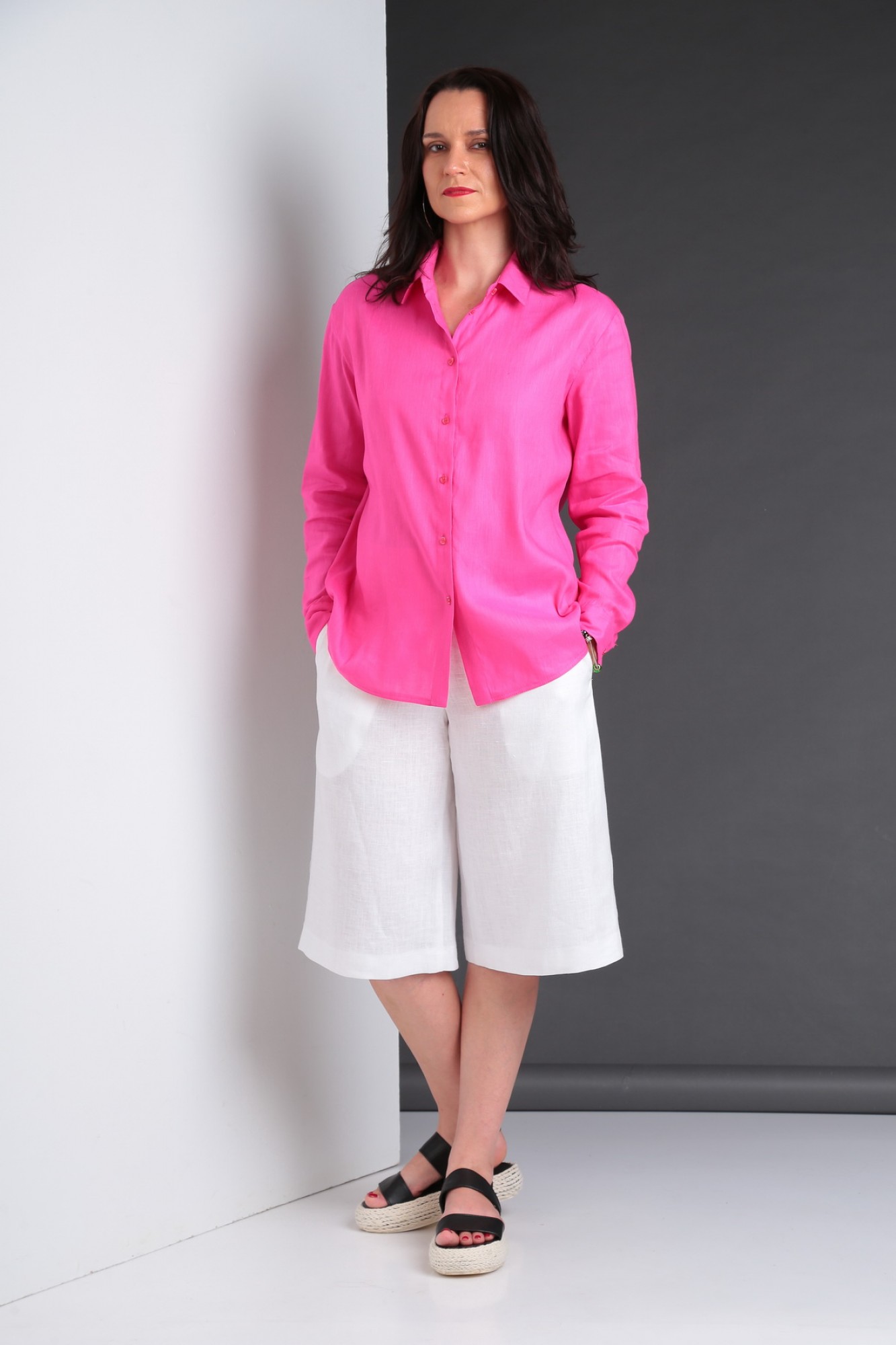 Комплект двухпредметнй состоит из рубашки и брюк. Рубашка свободного силуэта с длинным рукавом. По переду застежка на петли-пуговицы. В верхней части спинки кокетка. Воротник со стойкой, по низу рукава отрезная манжета. Бермуды прямого силуэта с боковыми карманами, застежкой -гульфиком и отрезной кокеткой по линии талии шириной 9 см.