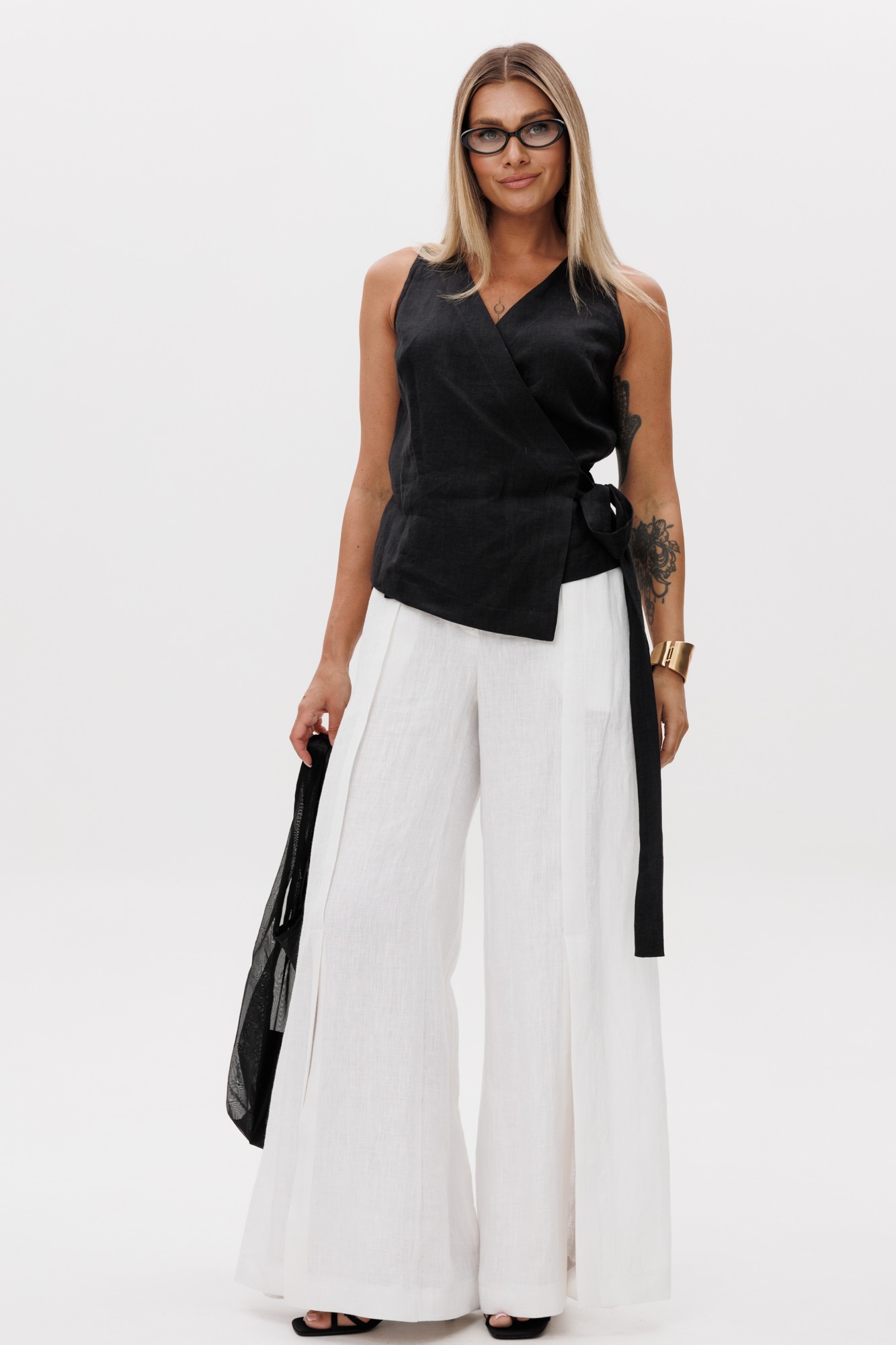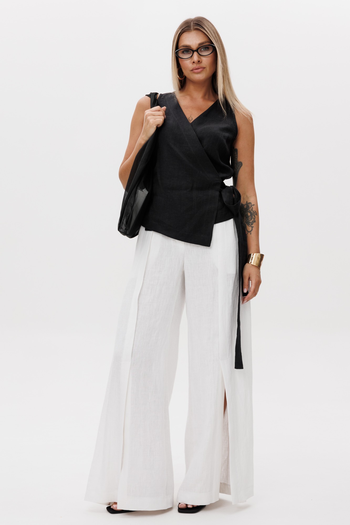 Комплект двухпредметный состоит из жилета и брюк. Жилет приталенного силуэта с запахом по переду. Брюки прямого силуэта с боковыми карманами и шлицами по переду. По боковым швам ниже уровня кармана глубокая складка. По линии талии ширина регулируется по спинке с помощью резинки.