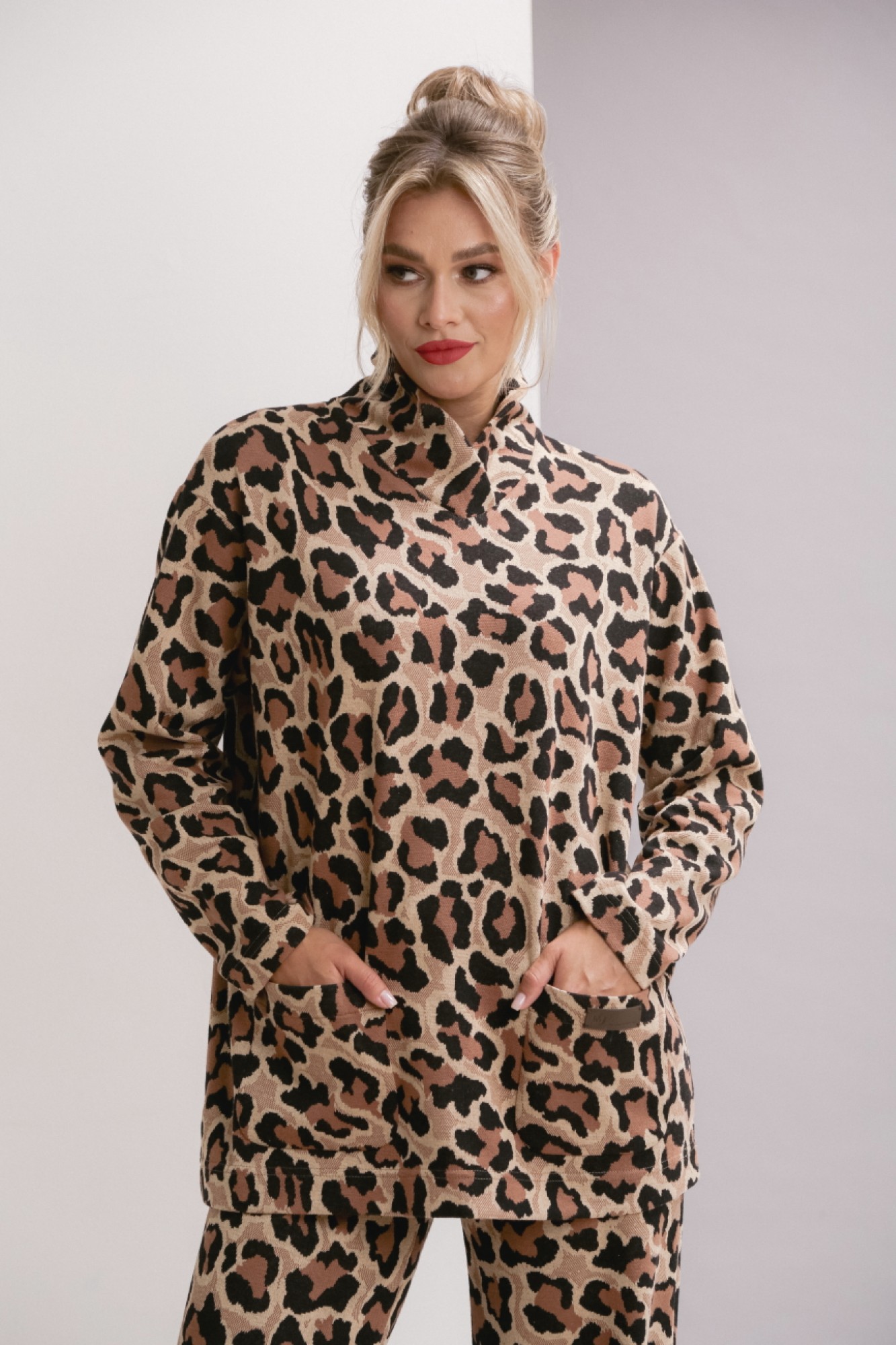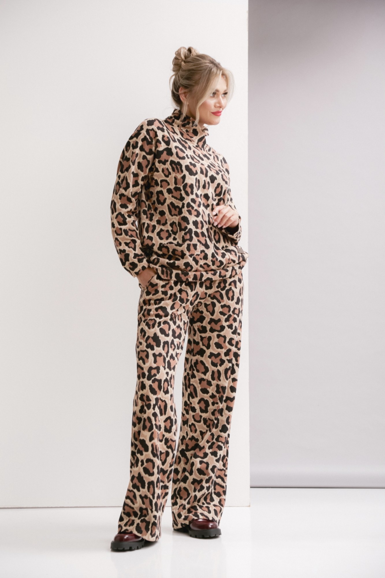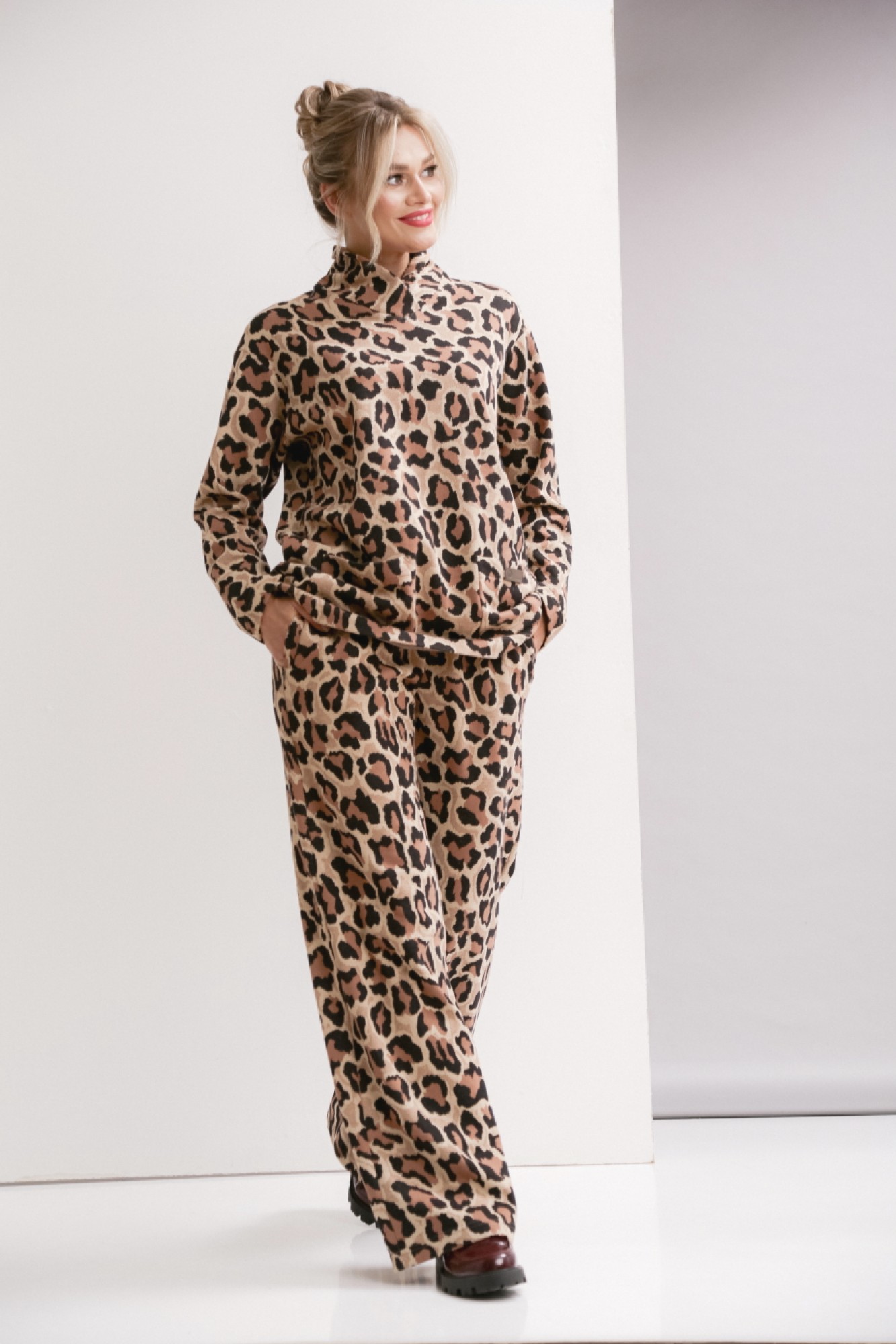 Костюм двухпредметный, состоит из джемпера и брюк. Джемпер трикотажный свободного силуэта, со спущенным плечо и накладными карманами, и уютным воротником с запахом. Брюки прямого силуэта с карманами в боковых швах. Ширина линии талии в брюках регулируется резинкой и шнуром.
