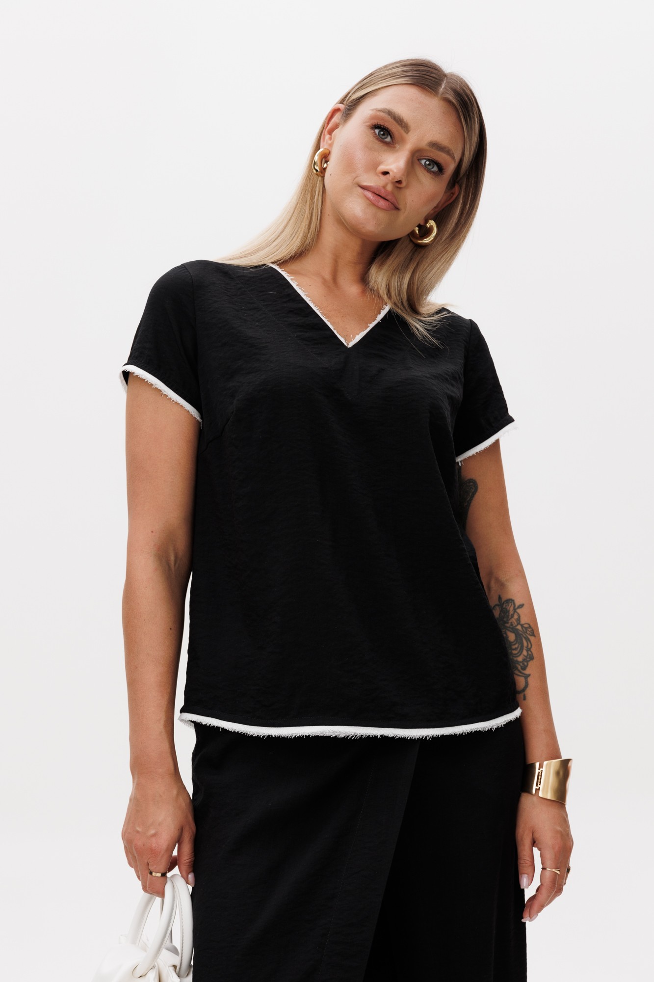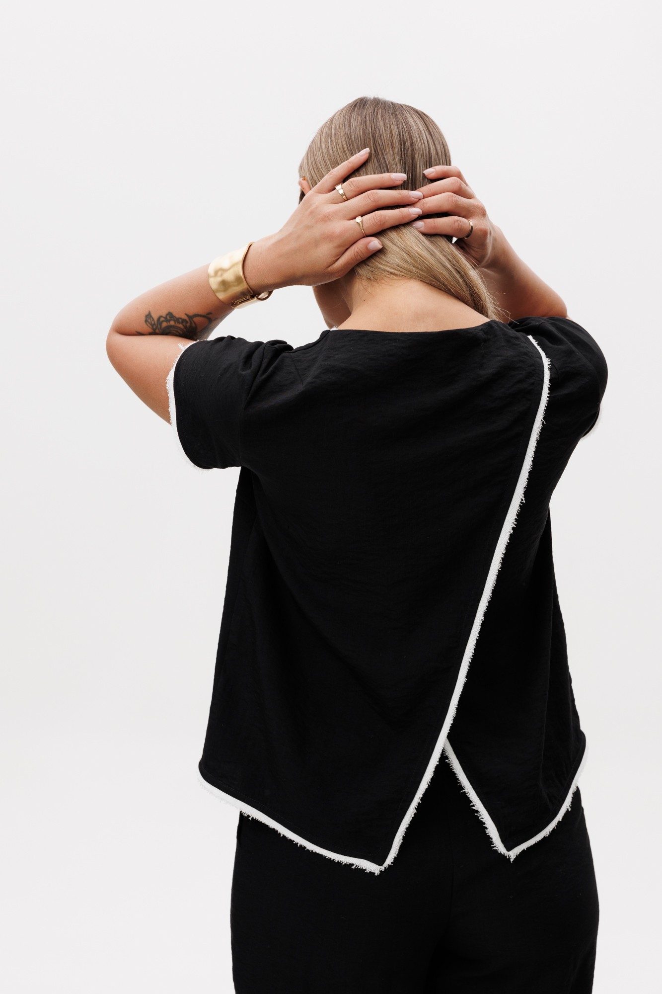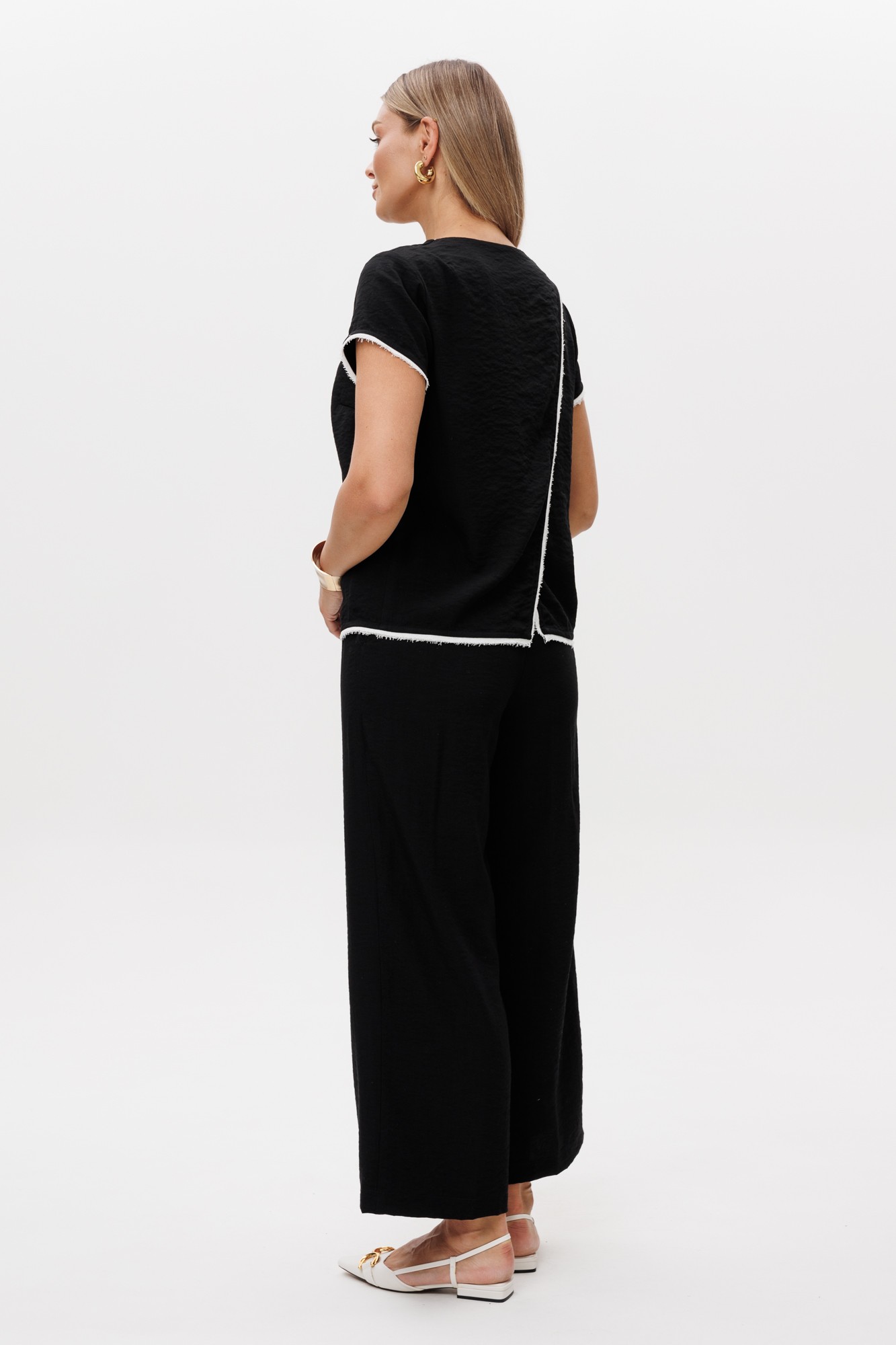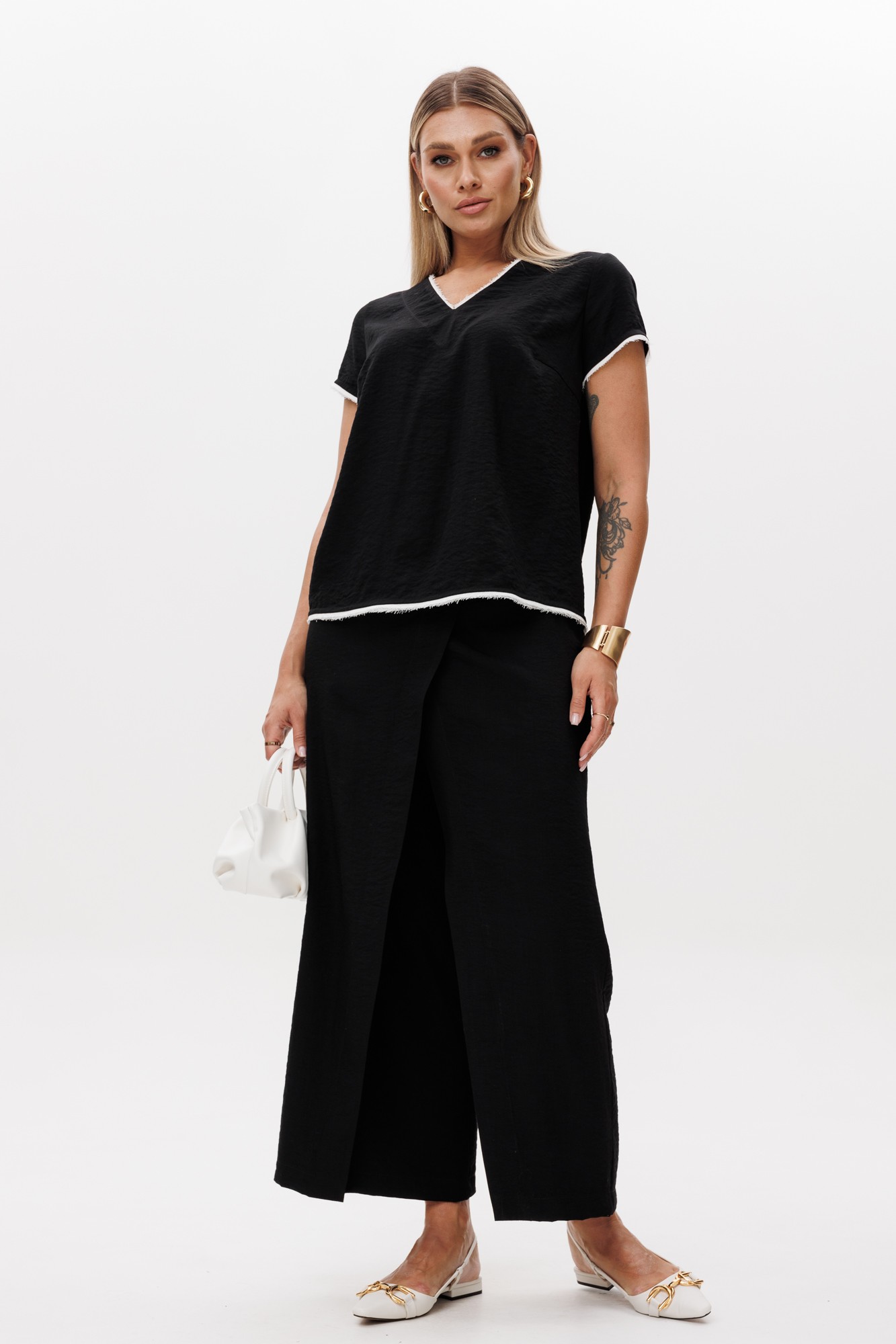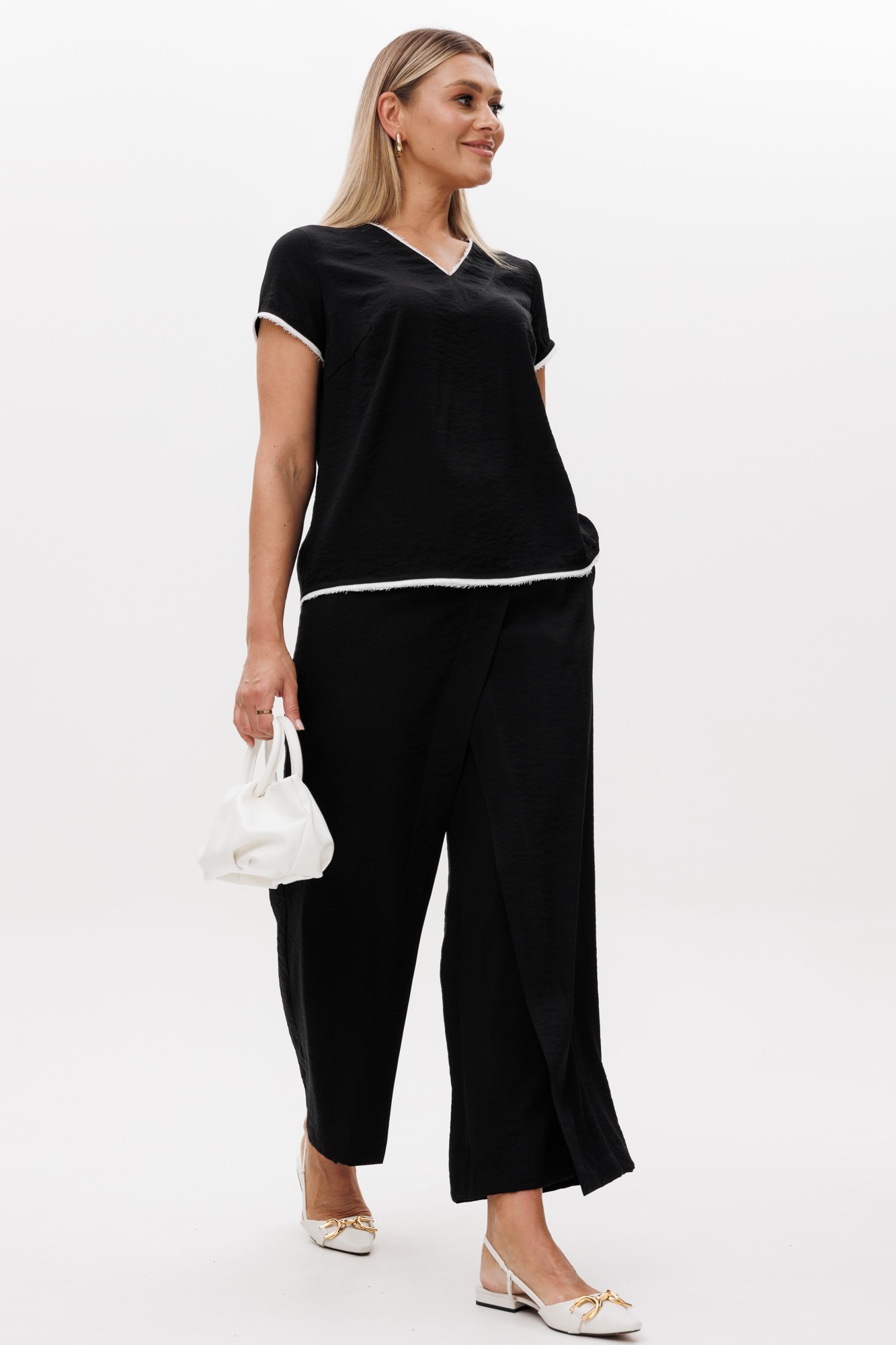Комплект двухпредметный, состоит из блузы и кюлотов. Блуза прямого силуэта с коротким рукавом и запахом на спине. По горловине, низу блузы и рукава отделочный кант контрастного цвета. Кюлоты прямого силуэта с запахом по переду. По переду боковые карманы. Застежка в боковом шве на потайную молнию. Пояс по спинке регулируется резинкой.