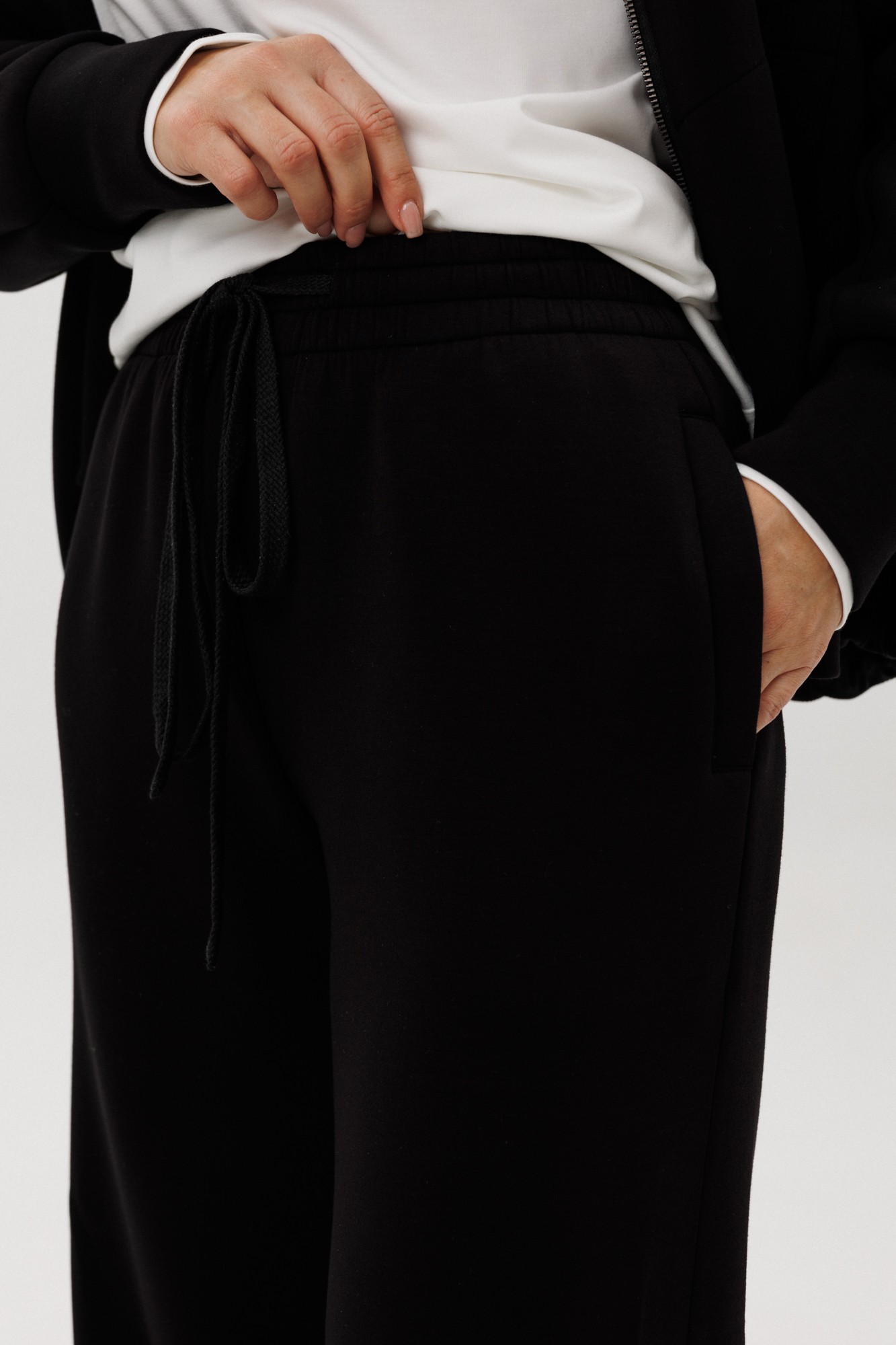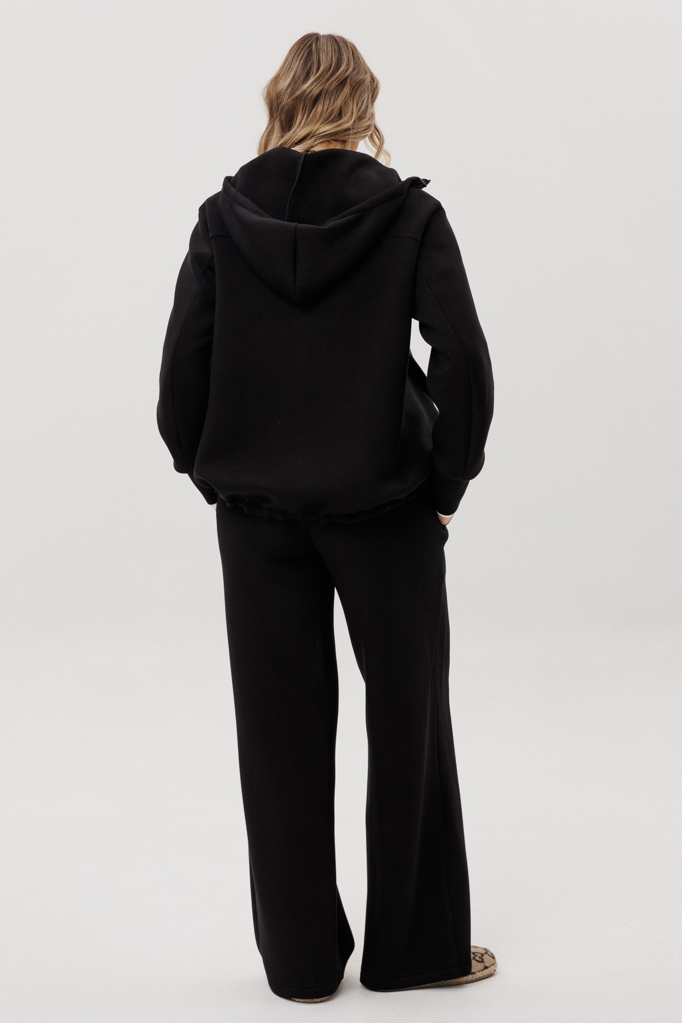 Комплект двухпредметный, состоит из джемпера и брюк. Джемпер с капюшоном. По переду карманы с листочкой. По спинке по низу эластичный шнур с фиксаторами. Застежка по переду на тесьму-молнию. Брюки прямого силуэта с боковыми карманами. Ширина по линии талии регулируется резинкой и шнуром.