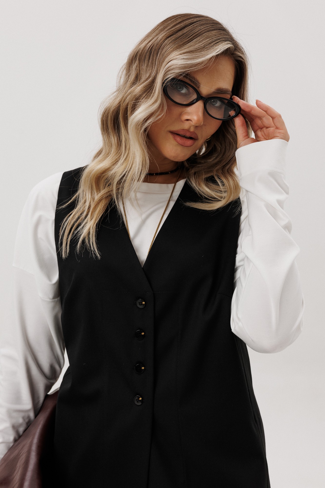 Костюм двухпредметный, состоит из Тренча и брюк. Тренч прямого силуэта без воротника. Застежка на петли-пуговицы. По переду в рельефах обработаны карманы. По центру спинки расположена широкая шлица. Брюки зауженные к низу со стрелками. По боковым швам расположены карманы. Ширина линии талии по спинке регулируется резинкой.