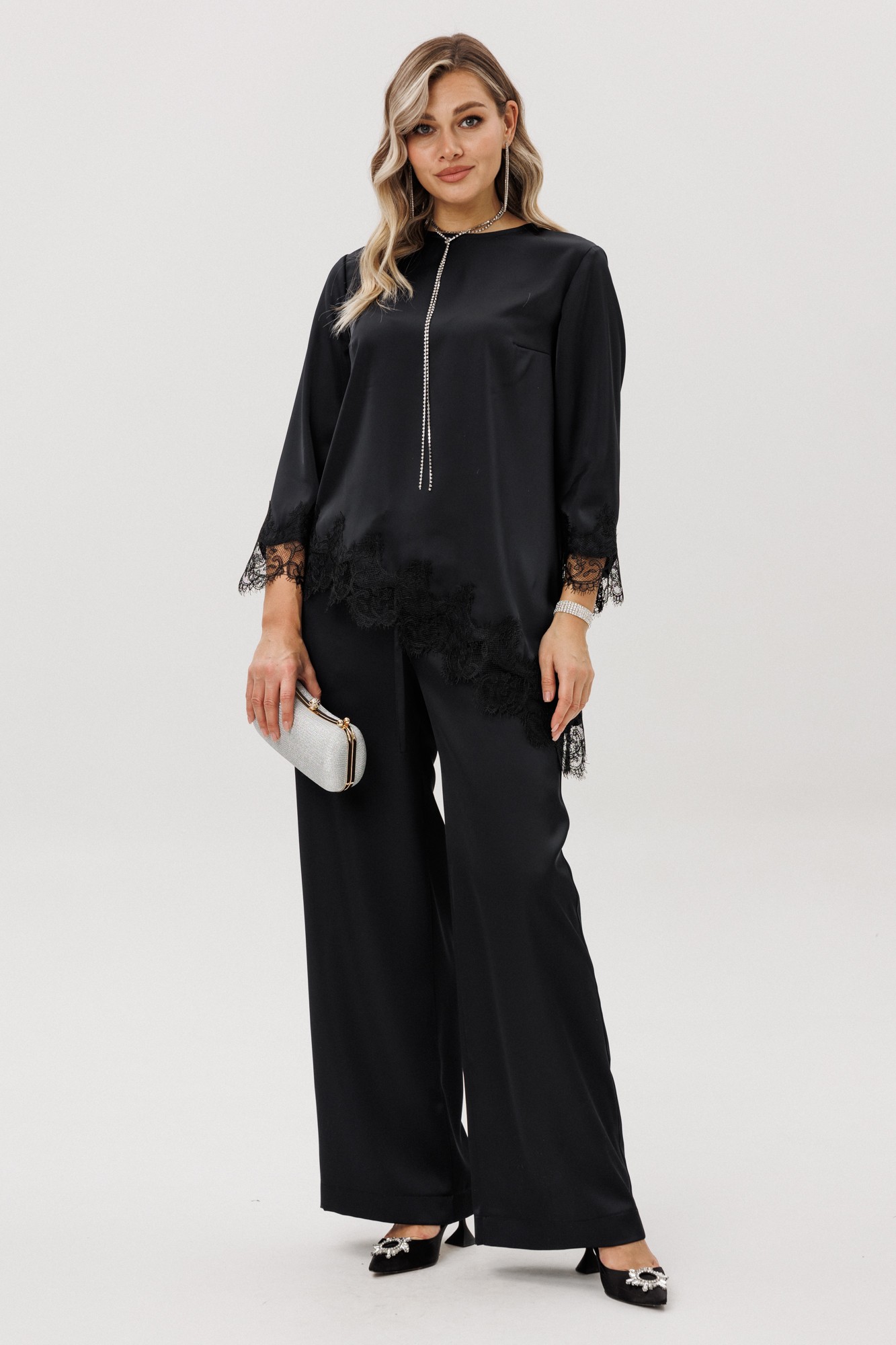 Костюм двухпредметный, состоит из блузы и брюк. Блуза прямого силуэта без воротника с втачными рукавами. Рукав 3/4.Линия низ ассиметричная. По низу блузы и рукавов декоративная отделка. Брюки прямого силуэта без застежки. В боковых швах карманы. Линия талии регулируется резинкой и шнуром.