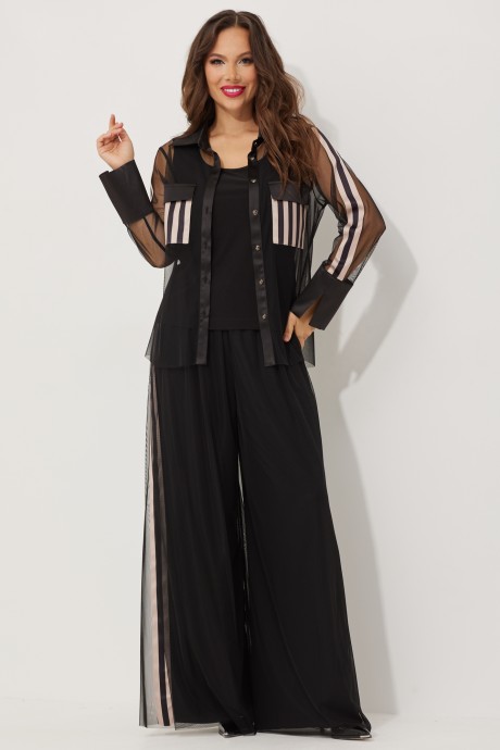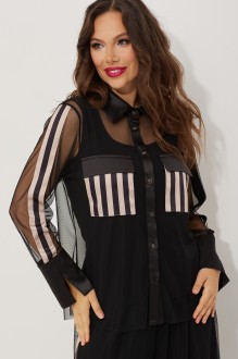 Стильный нарядный комплект из блузы, топа и брюк. Блуза прямого кроя с центральной застежкой на пришивные пуговицы. Выполнена из текстильной мелкой сетки. Дополнена отложным воротником на стойке, манжетами и планкой по застежке, выполненными из шелковистой поливискозной ткани с легким атласным блеском. Отделка карманов и рукавов выполнены из шелковистой ткани в черно-пудровую полоску. Топ свободного кроя с широкими бретелями. Брюки свободного кроя с притачным поясом , дополненным эластичной тесьмой. Выполнены из нижней черной струящейся ткани и наложенной на нее воздушной текстильной сетки. По боковому шву брюки дополнены отделкой из черно-пудровой полоски. Низ брюк по сетке с необработанным краем, что позволит с лёгкостью корректировать длину.