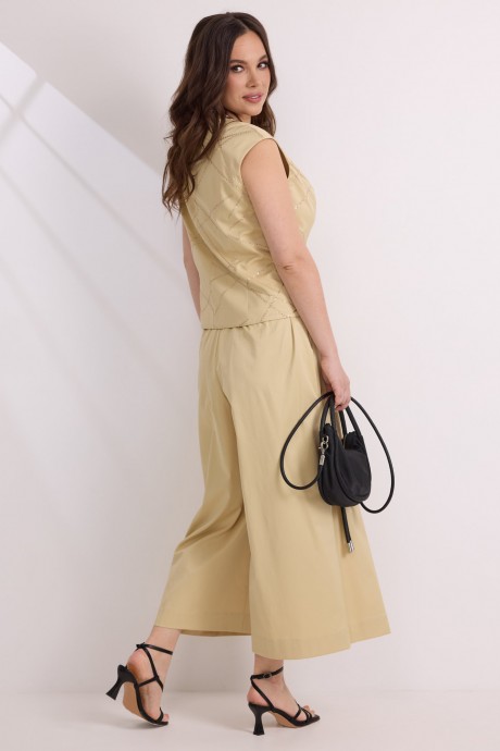 Стильный элегантный комплект из жилета и брюк. Жилет однобортный полуприлегающего силуэта, на подкладке, с центральной застежкой на пришивные пуговицы. Выполнен из комфортной, держащей форму ткани, дополненной линиями из пришивных пайеток. Брюки кюлоты свободного кроя с притачным поясом, дополненным эластичной тесьмой. Застежка гульфик на молнию и пуговицу. Выполнены брюки из комфортной, держащей форму ткани. Дополнены удобными боковыми карманами.