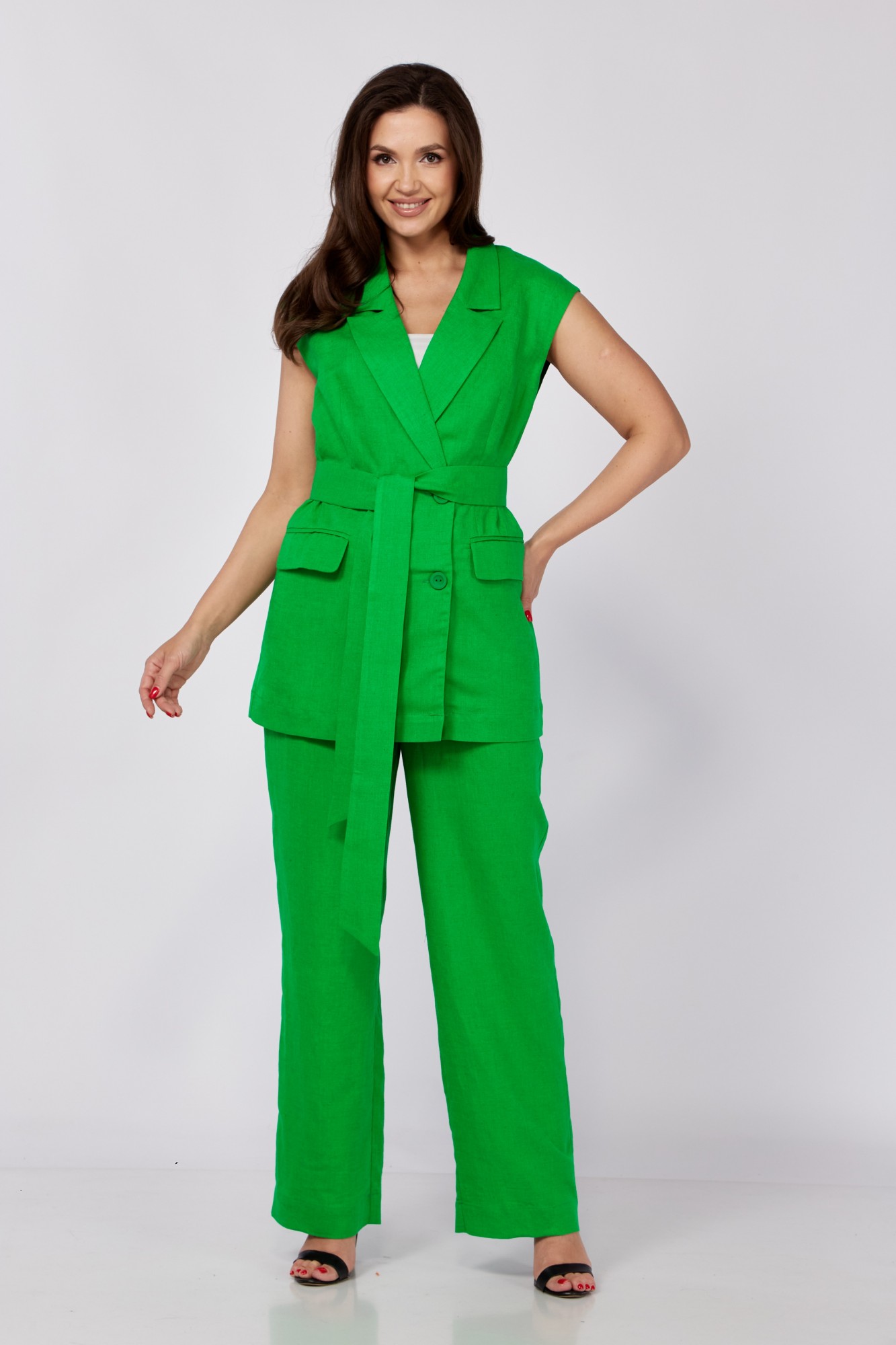 Костюм льняной 2-х предметный от MALI, состоящий из жилета и брюк. Жилет прямого силуэта без подкладки, на центральной двубортной застежке на петли и пуговицы. Перед с талиевыми вытачками и прорезными карманами "в рамку" с клапанами. Спинка со средним швом, внизу которого шлица. Воротник стояче-отложной с лацканами. Жилет удлиненный, в комплекте идет съемный пояс из основной ткани. Брюки прямые, Брюки прямые. С карманом с отрезным бочком. Пояс на резинке и декоративным гульфиком без кулисы.