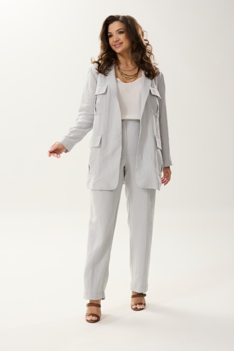 Комплект женский, состоящий из жакета и брюк. Жакет полуприлегающего силуэта, рукав длинный втачной, спинка со средним швом. По переду накладные карманы со складкой и клапаном. Пояс в комплекте. Брюки прямые на резинке по спинке, по переду рельефы, на задней половине вытачки. Застежка на молнию и пуговицы.