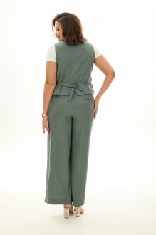Комплект 2-х предметный. Состоит из жилета и брюк. Жилет полуприлегающего силуэта без подкладки и застежкой на пуговицы. По переду прорезной карман, сзади — хлястик с застежкой на 2 пуговицы.. Брюки расширенные к низу с рельефами по переду. По бокам карманы с отрезным бочком. сзади карман-обманка. Пояс из двух частей: по переду — пояс-кокетка, сзади — резинка. Застежка на молнию и пуговицу.