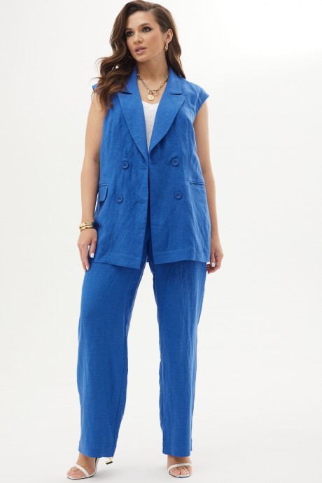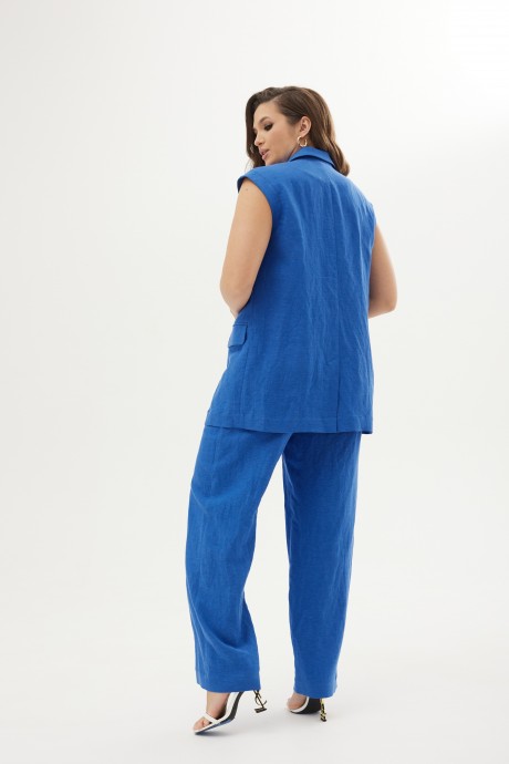 Костюм льняной 2-х предметный от MALI, состоящий из жилета и брюк. Жилет прямого силуэта без подкладки, на центральной двубортной застежке на петли и пуговицы. Перед с талиевыми вытачками и прорезными карманами "в рамку" с клапанами. Спинка со средним швом, внизу которого шлица. Воротник стояче-отложной с лацканами. Жилет удлиненный, в комплекте идет съемный пояс из основной ткани. Брюки прямые, Брюки прямые. С карманом с отрезным бочком. Пояс на резинке и декоративным гульфиком без кулисы.