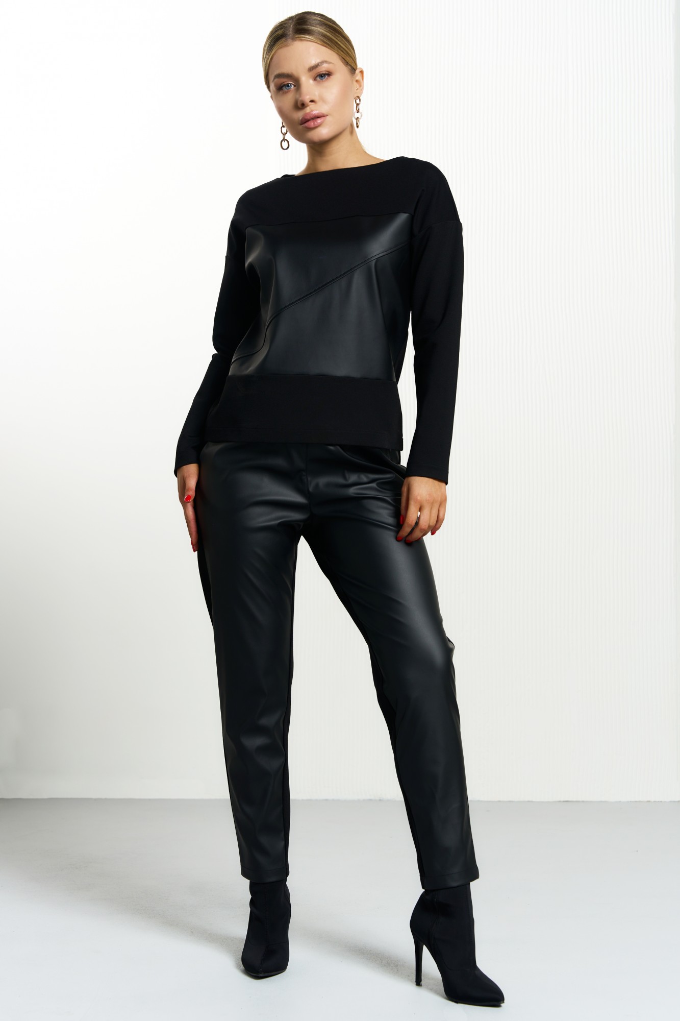 Костюм состоящий из комбинации тканей — трикотажа и эко-кожи. Джемпер полуприлегающего силуэта со спущенным плечом и втачным рукавом. Спинка прямая, цельная. Перед разрезной со вставками и подрезами. Горловина на обтачке. Низ изделия и рукава — на подгибке. Брюки спортивного кроя на резинке и отрезными боковыми карманами.