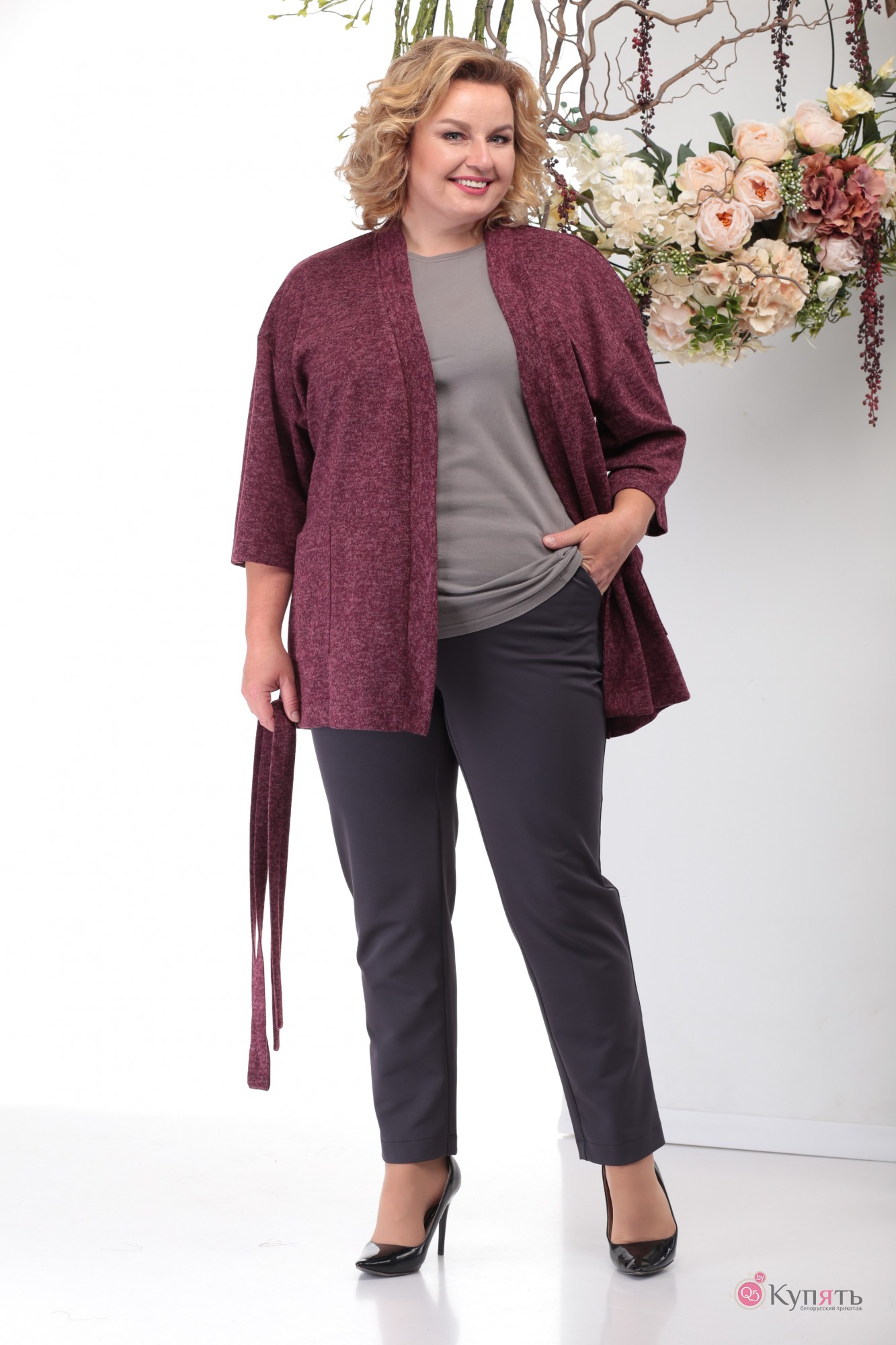 Прекрасный костюм двойка на каждый день, где оба изделия могут сочетаться с другими вещами Вашего гардероба. Брюки выполнены из плотной ткани с содержанием стрейча, садятся по фигуре, к низу заужены, спереди на молнии с гульфиком, высокая посадка, в обтачку пояса вставлена резинка, длина 7/8, от пояса к боковым швам косые карманы, длина по боковому шву 104 +-1 см., по внутреннему шву 75 +-1 см. Кардиган на запах, выполнен из мягкого меланжевого трикотажа, рукав 3/4, для функциональности и удобства по бокам карманы; носится как с поясом, который идет в комплекте, так и на распашку; длина от плечевого шва 83+-1см.