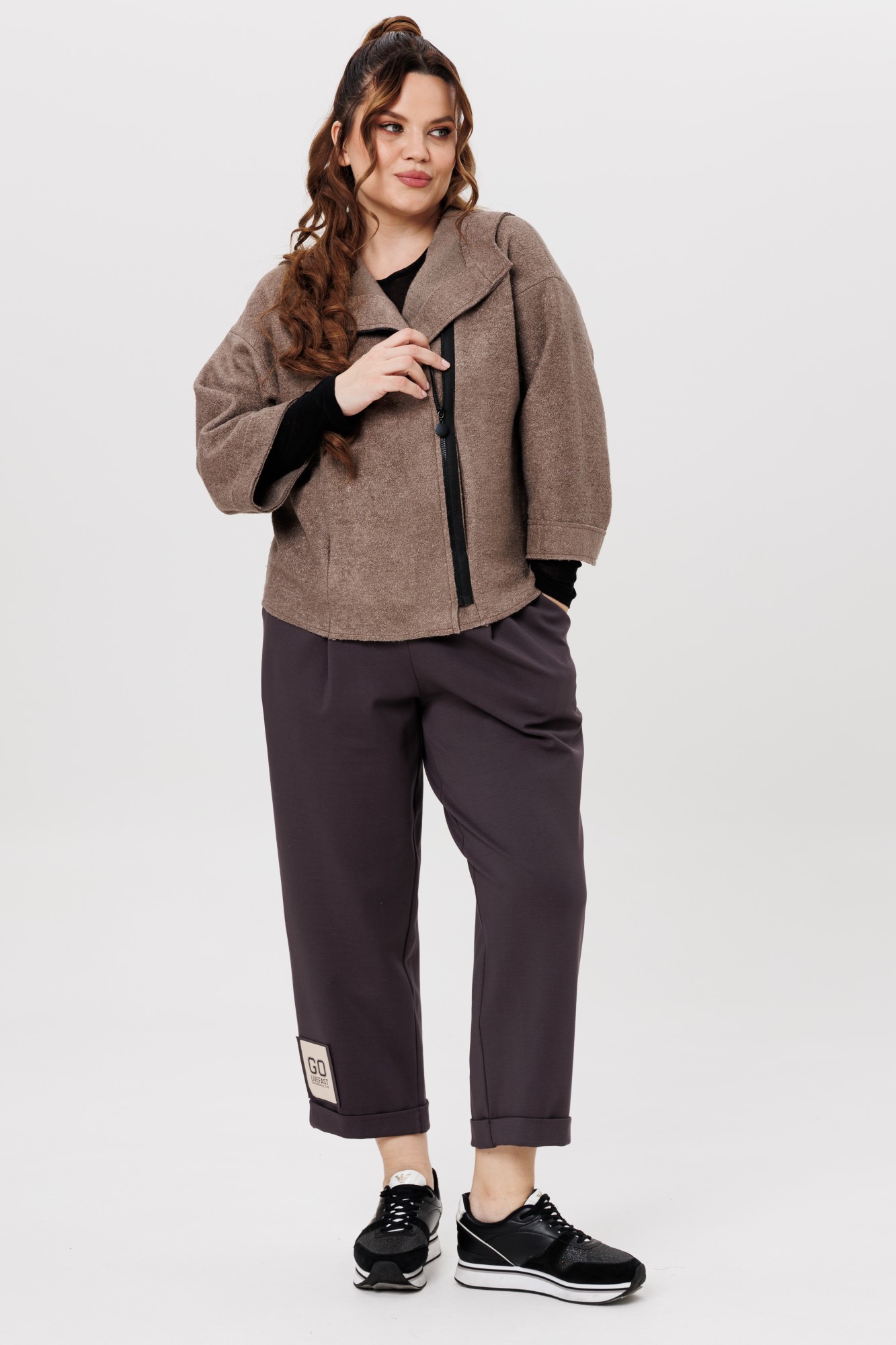 Повседневный брючный костюм из двух предметов — жакет и брюки. Жакет из буклированного однотона, брюки — однотонный вискозный трикотаж. Жакет укороченный с капюшоном и объемными рукавами, по переду застегивается на асимметричную застежку — молнию, имеются карманы. Спинка цельная. Края жакета, рукава, борта и капюшона с открытыми срезами и отделочной строчкой. Брюки-бананы свободного кроя, длина 7/8, пояс притачной на резинке, в боковых швах карманы. Низ брюк — цельнокроеная манжета с отворотом на лицо. Брюки украшены нашивкой. Оба изделия смело можно сочетать с другими вещами вашего гардероба.