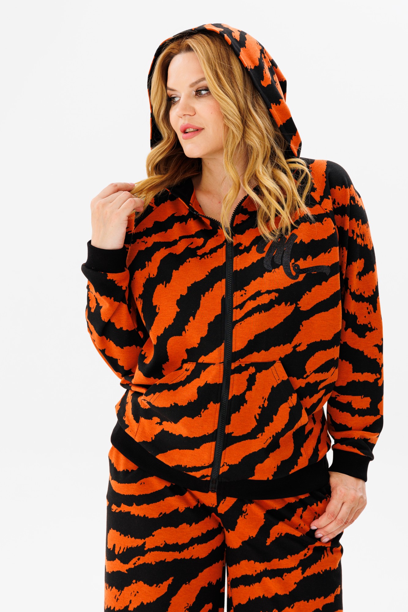 Костюм брючный женский повседневный спортивного типа из плотного вискозного трикотажа — это удобная и стильная одежда на каждый день. Джемпер-бомбер с капюшоном свободного кроя, рукав длинный реглан на манжете. Перед с центральной застежкой на тесьму-молнию и карманом кенгуру, спинка цельная, низ джемпера-бомбера с притачной планкой. По переду декор в виде термоаппликации. Брюки трубы длинные клеш, на притачном поясе с резинкой, по переду брюк имеются два кармана в боковых швах.