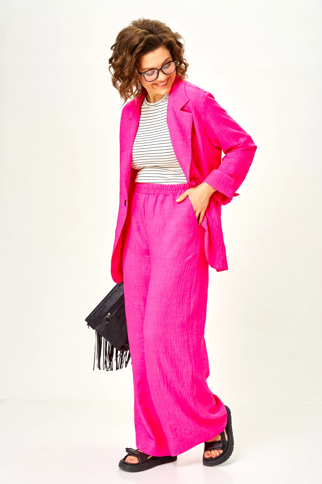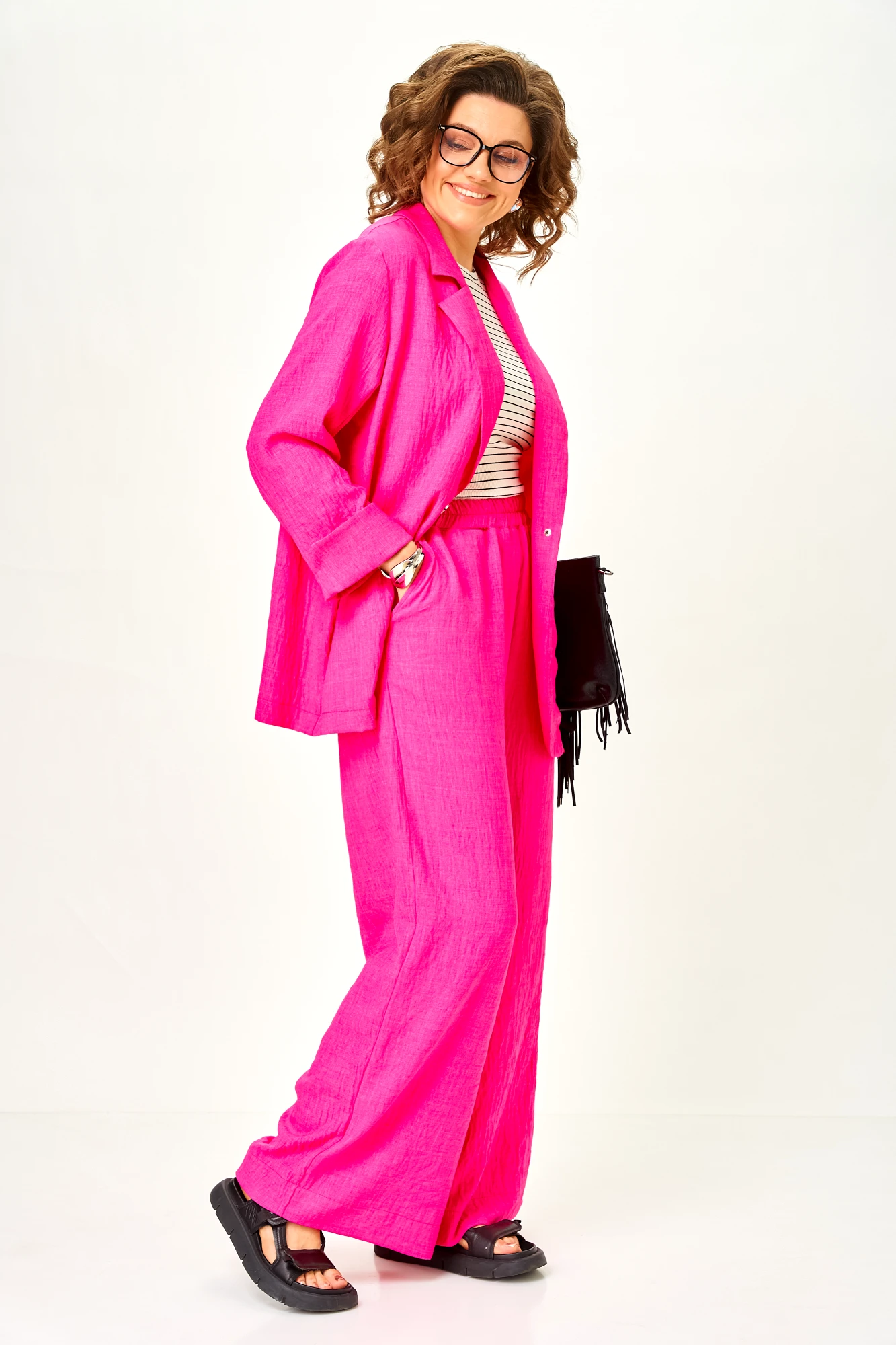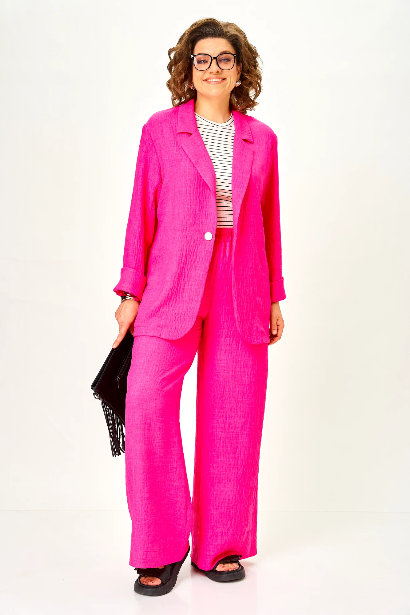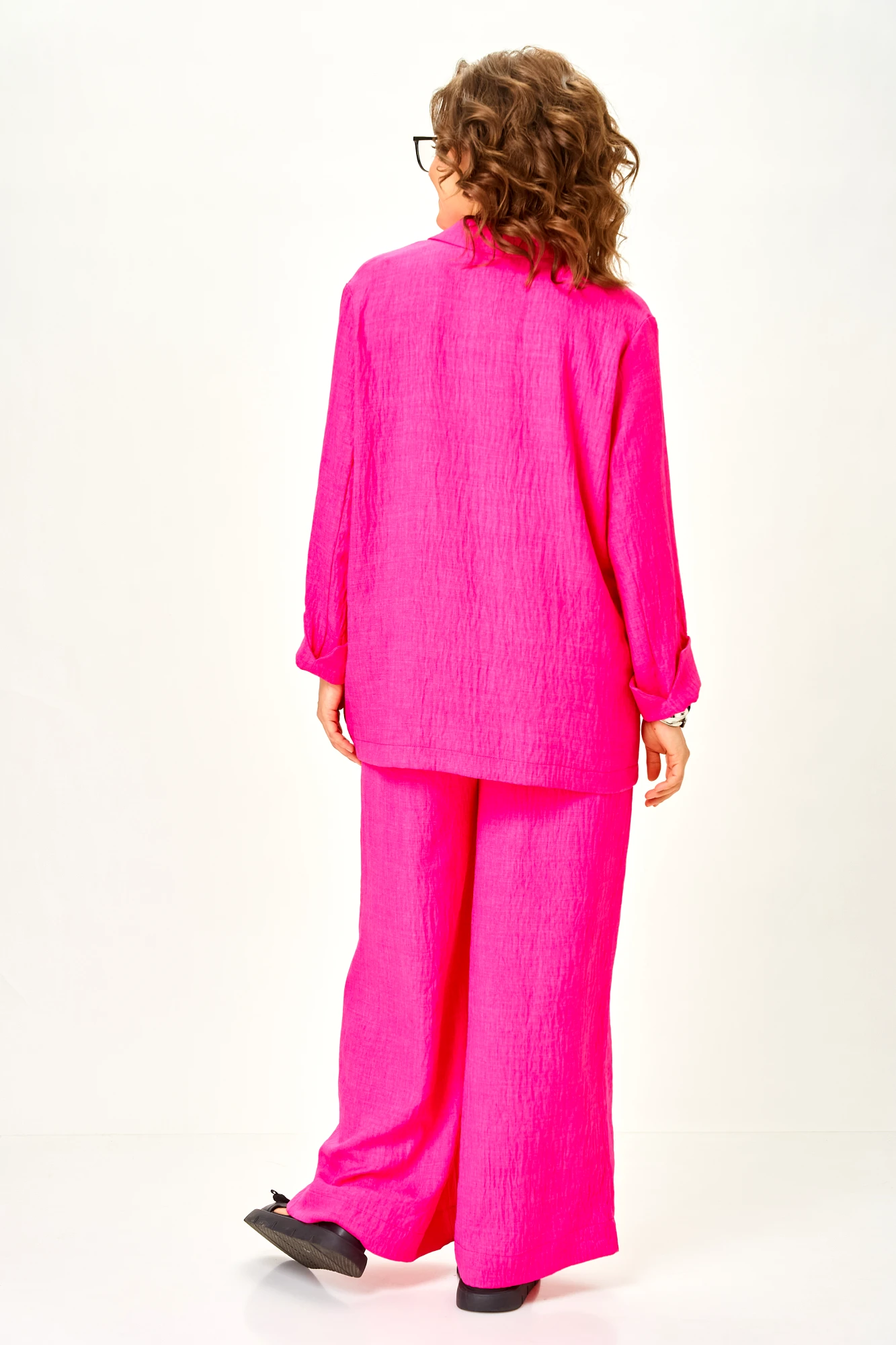Современный женственный костюм из легкой струящейся ткани. Насыщенный цвет фуксии выглядит дорого и легко вписывается в гардероб, позволяя создавать как повседневные, так и более нарядные образы.