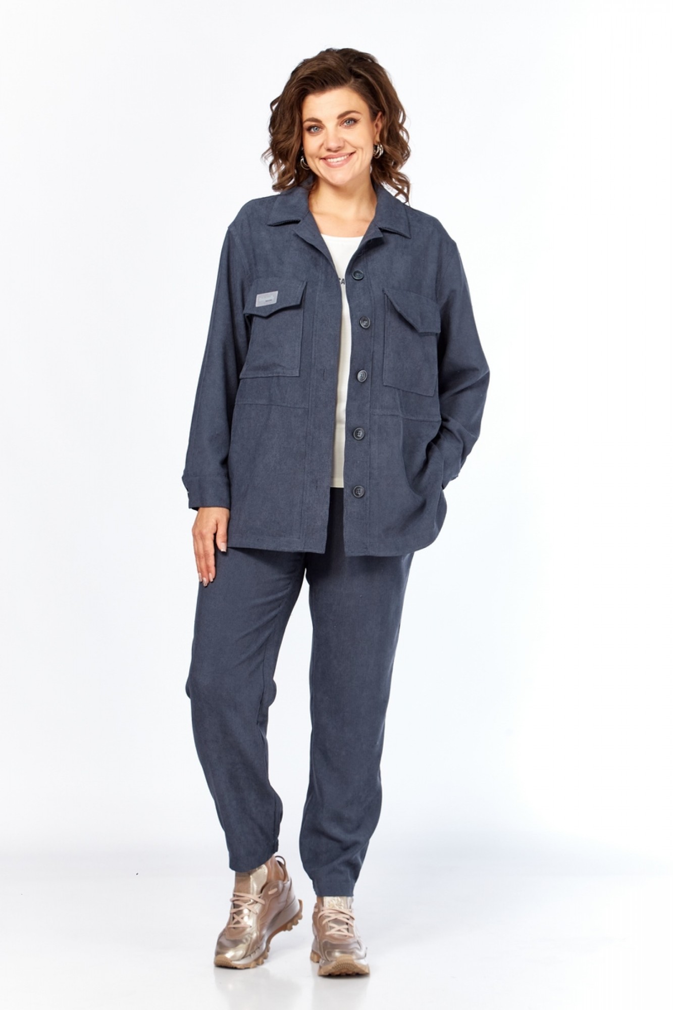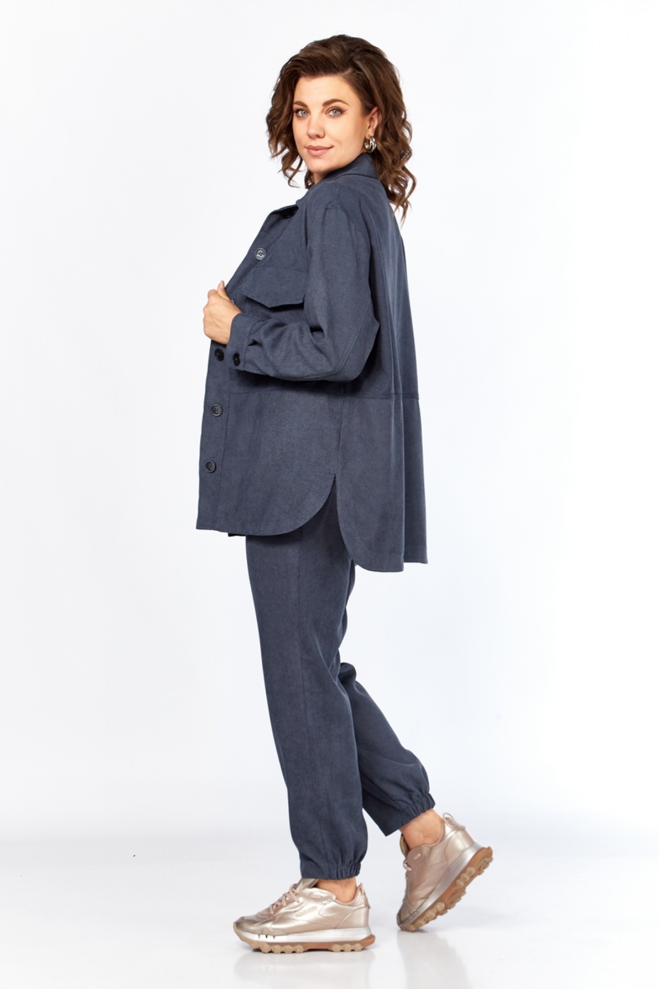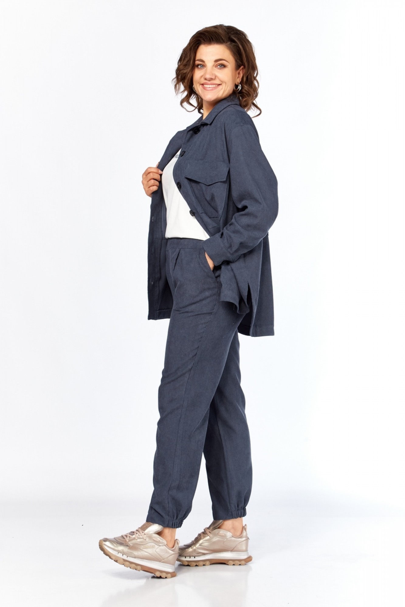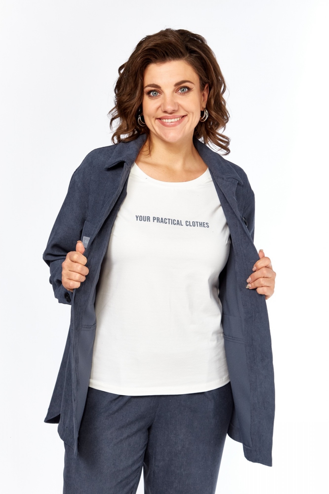 Комплект женский, состоящий из жакета, майки и брюк. Жакет свободного силуэта. Перед отрезной по линии талии, с накладными карманами и отделочной планкой, застёжка на петли-пуговицы. Рукав рубашечный, по низу с застёгивающимся манжетом на петли-пуговицы. Низ фигурный, обработан обтачкой. Майка прямого силуэта. Перед с вытачками и печатью. Рукав втачной, короткий. Горловина обработана бейкой. Брюки прямые. По передней части брюк-складки, идущие от кокетки, карманы. По задней части брюк-листочки, низ брюк-на резинке. Пояс на резинке.