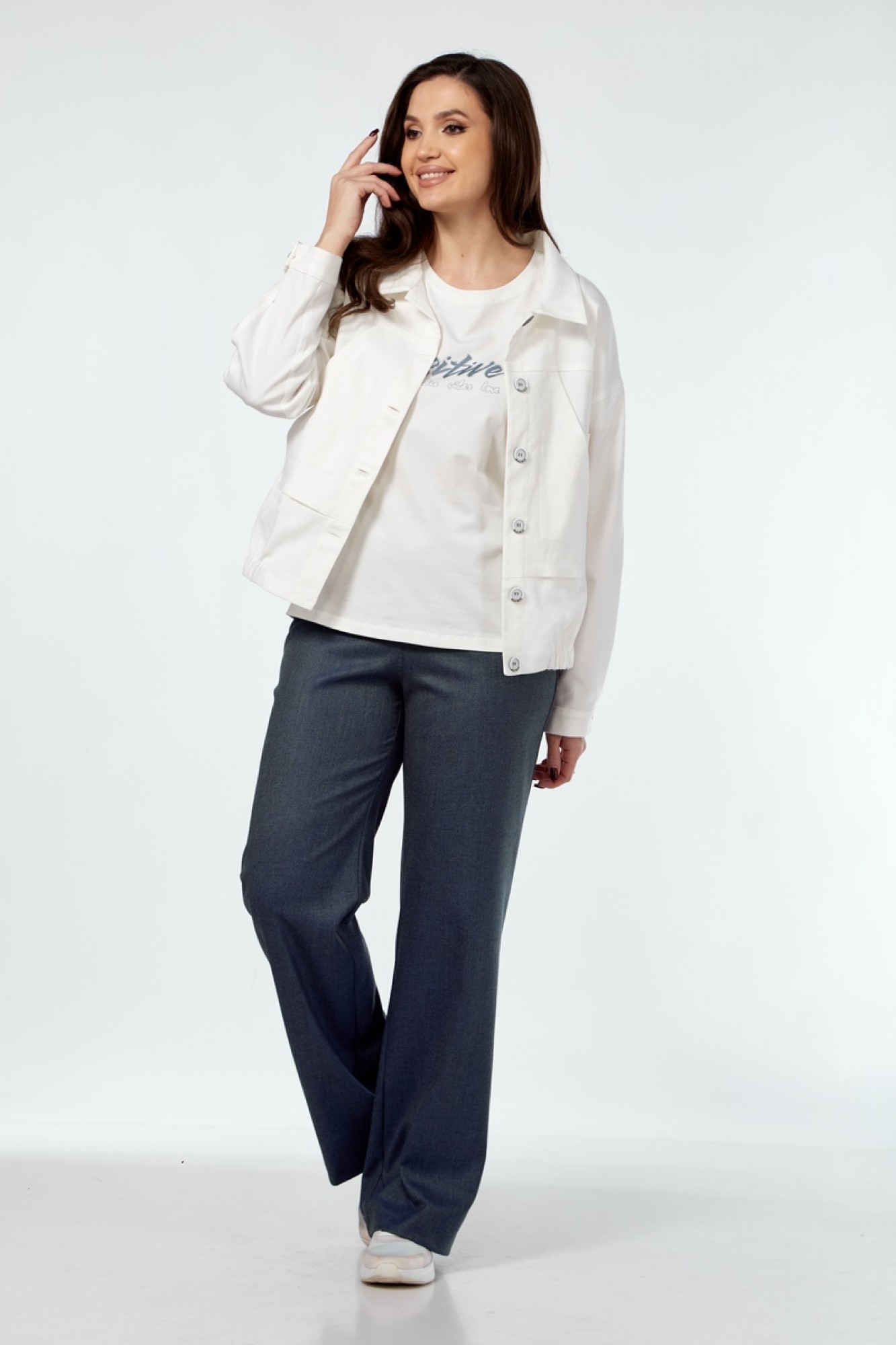 Комплект женский, состоящий из джинсовки, футболки и брюк. Джинсовка свободного силуэта, со спущенным рукавом, на манжете-с застёжкой на петлю-пуговицу. По переду накладные фигурные карманы. По спинке кокетка и декоративная застёжка с пуговицами. Джинсовка с застёжкой на петли-пуговицы, с фигурным низом, по переду-на резинке. Футболка свободного силуэта, рукав короткий, втачной, округлый вырез горловины. Брюки свободного силуэта, по талии на резинке, без застёжки. В боковых швах имитация кармана.