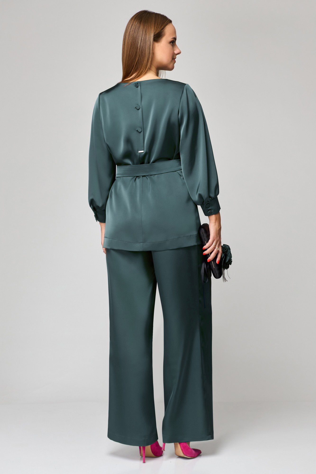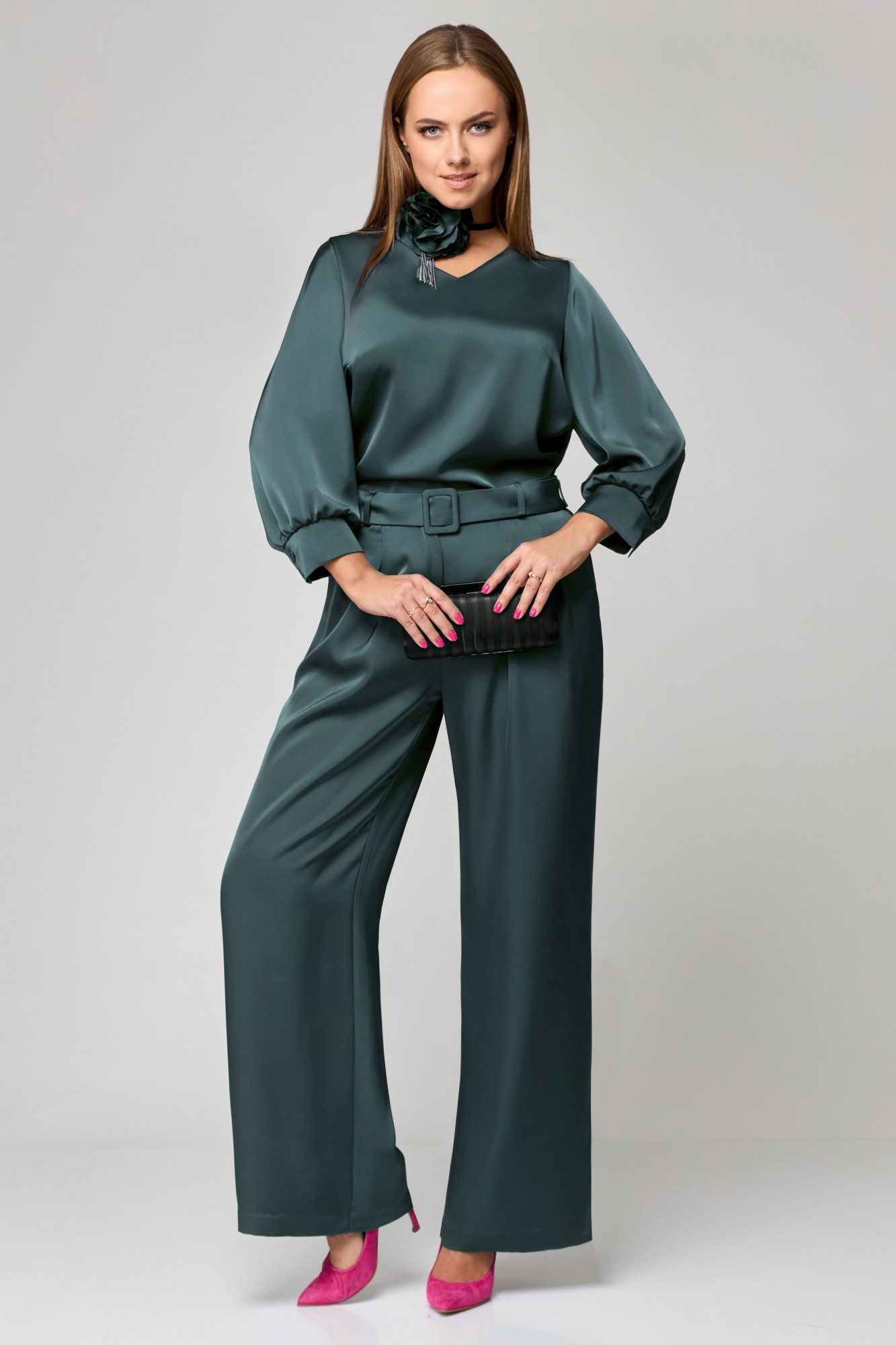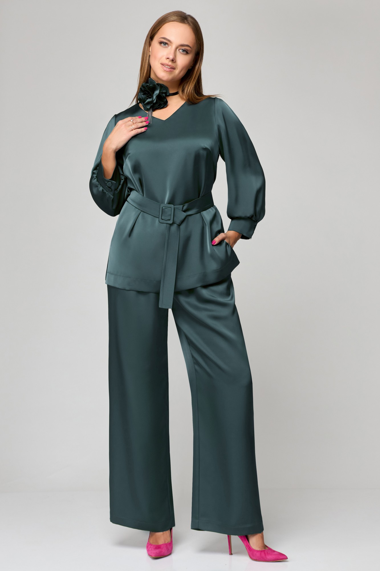 Комплект женский двухпредметный. Блузка - прямого силуэта с V-образным вырезом горловины. По спинке застежка на 3-петли и пуговицы. В боковых швах разрезы. Рукав втачной со складкой по низу с манжетой. Брюки классического покроя, прямые от бедра. В боковых швах карманы с отрезными бочками. Пояс отрезной со шлевками. Застежка на молнию и петлю с пуговицей. Изделие дополнено съемным поясом из основной ткани на пряжке. Украшение в комплект не входит.