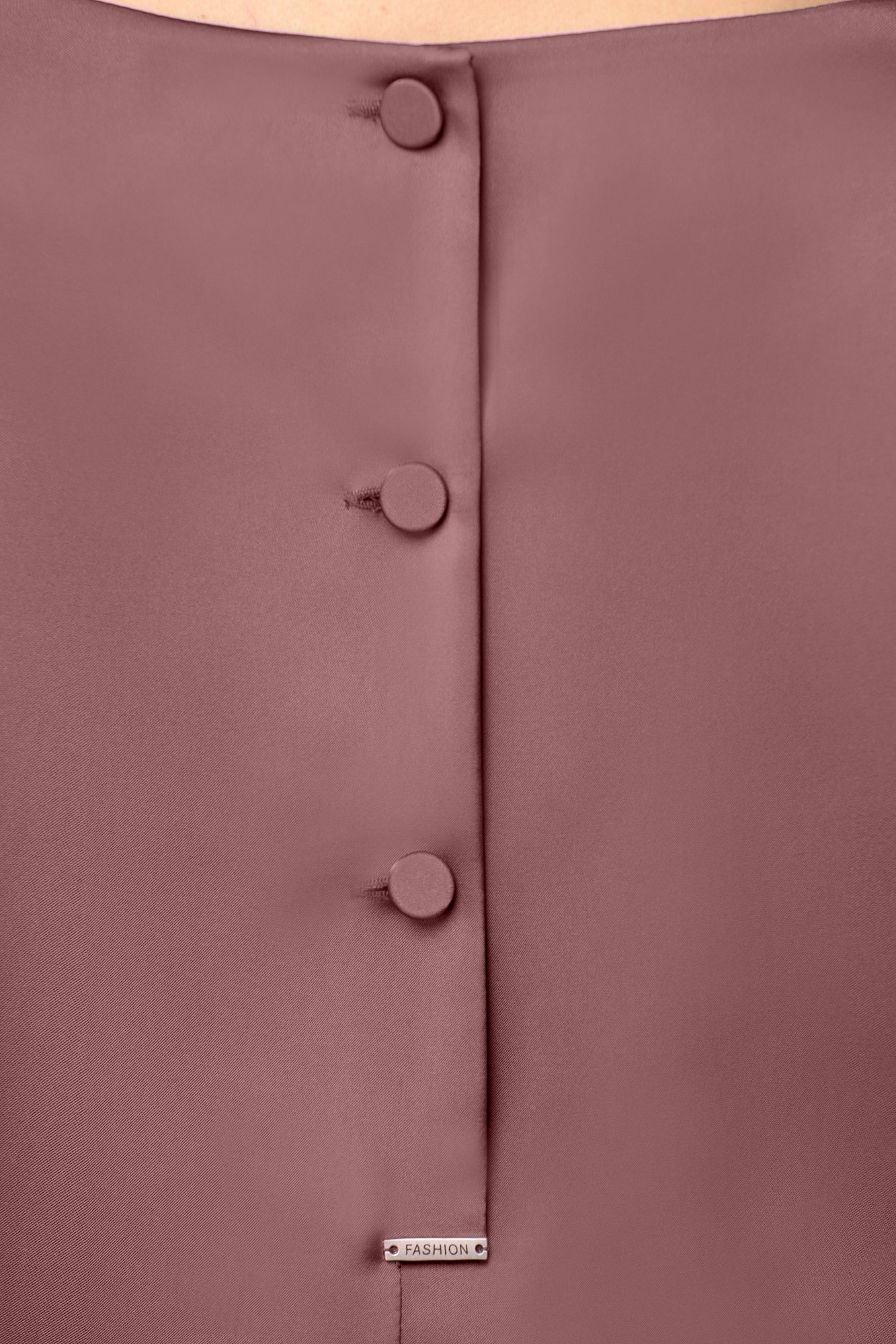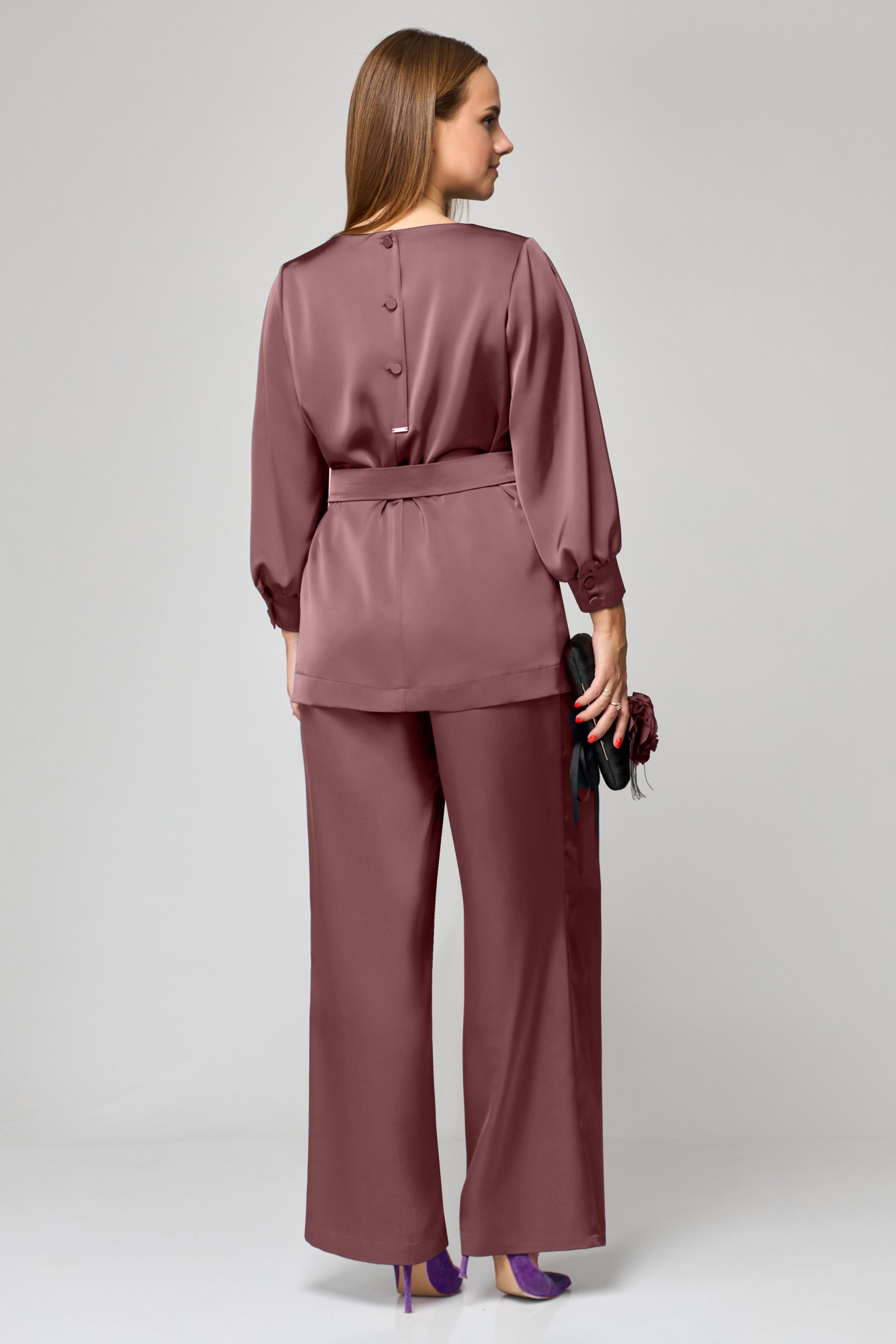 Комплект женский двухпредметный. Блузка - прямого силуэта с V-образным вырезом горловины. По спинке застежка на 3-петли и пуговицы. В боковых швах разрезы. Рукав втачной со складкой по низу с манжетой. Брюки классического покроя, прямые от бедра. В боковых швах карманы с отрезными бочками. Пояс отрезной со шлевками. Застежка на молнию и петлю с пуговицей. Изделие дополнено съемным поясом из основной ткани на пряжке. Украшение в комплект не входит.