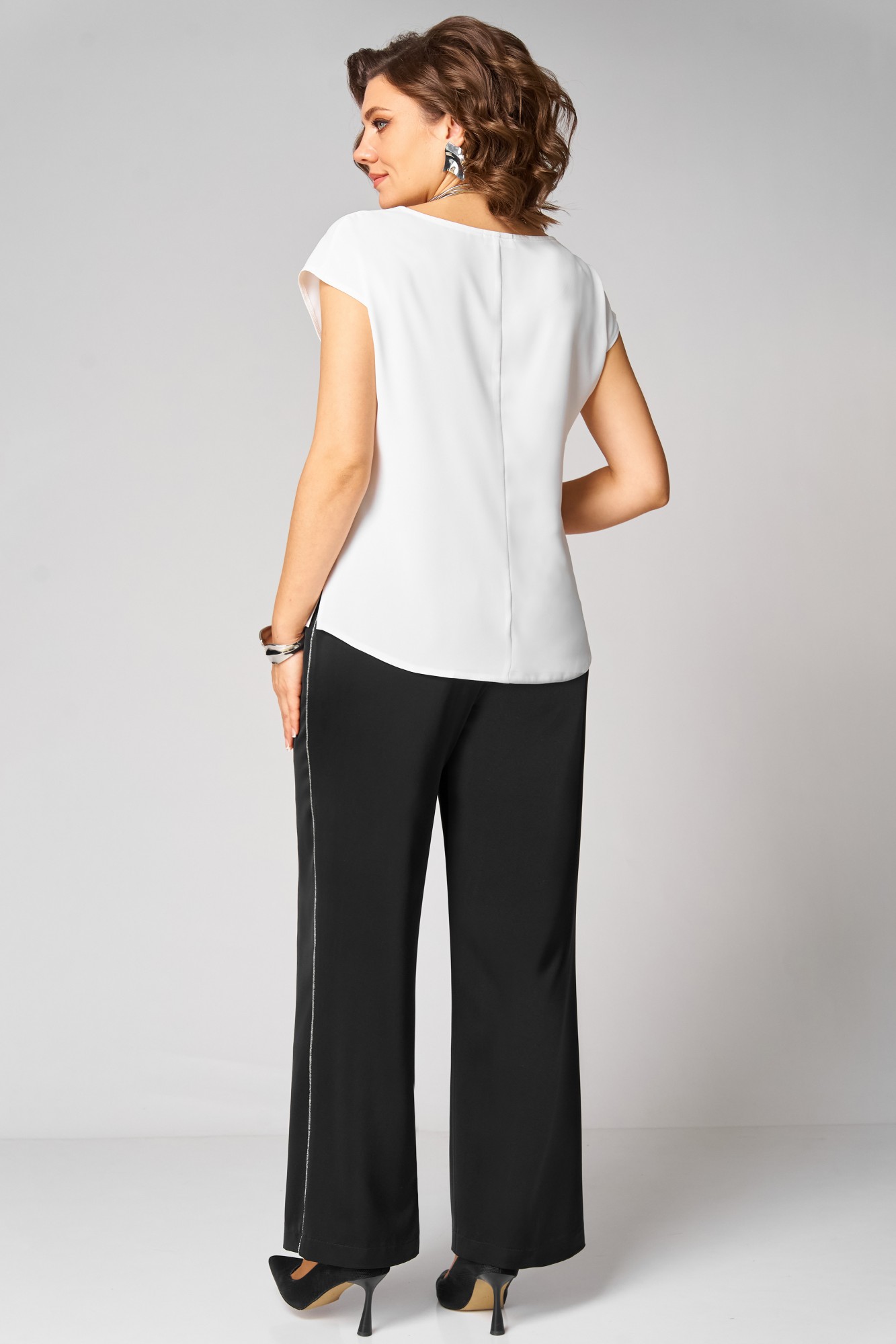 Элегантный женский комплект трехпредметный, состоящий из блузки, топа, брюк. Блузка прямого силуэта. Левая полочка выполнена из отделочной ткани в полоску. Рубашечный воротник. По правой планке настрочен декоративный серебристый кант. Спущенная линия плеча. Спинка цельнокроеная. Рукав одношовный по пройме и по низу рукава прострочен кант. Низ блузки фигурный с разрезами по бокам. Застежка по планке на 7 пуговиц и петель. Длина изделия по боковому шву (без пояса) -102см. Топ с округлым вырезом горловины и спущенной линией плеча. Длина рукава от горловины-18см, длина по спинке-61см. Брюки прямого силуэта на притачном поясе с эластичной резинкой, с боковыми наклонными карманами на передних половинках брюк. По боковым швам настрочен кант.