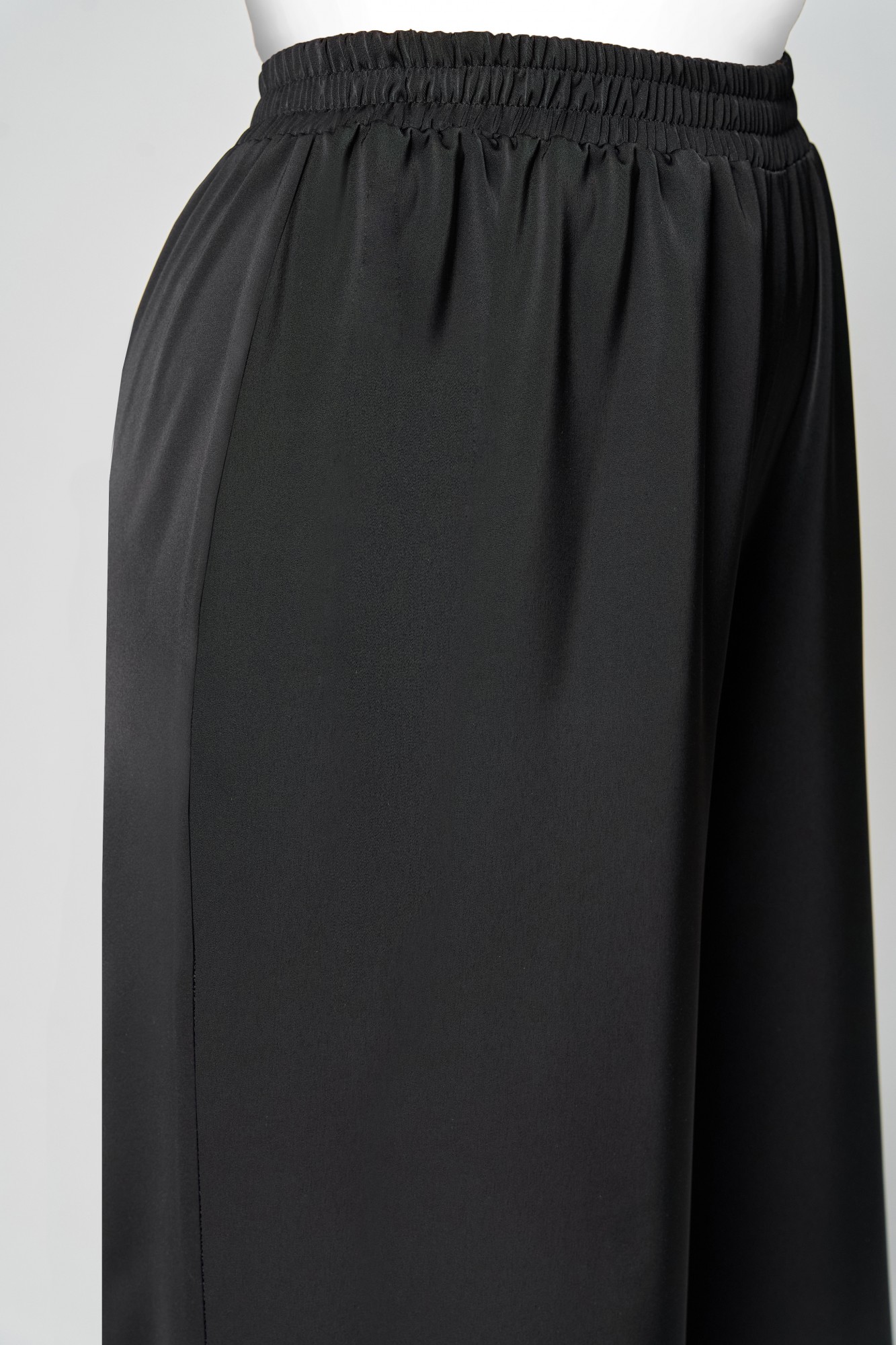 Комплект женский, двухпредметный состоящий из: туники и брюки. Туника прямого силуэта, со спущенной линией плеча. Округлый вырез горловины, обработан бейкой черного цвета. По переду с правой стороны отрезной рельеф, обработан бейкой черного цвета и вставка из пайеток. По переду имеется небольшой разрез. Спинка со средним швом. Рукав одношовный, центр рукава и по низу обработан бейка черного цвета. Брюки прямые, пояс на эластичной резнике, по боковому шву лампас из пайеток.