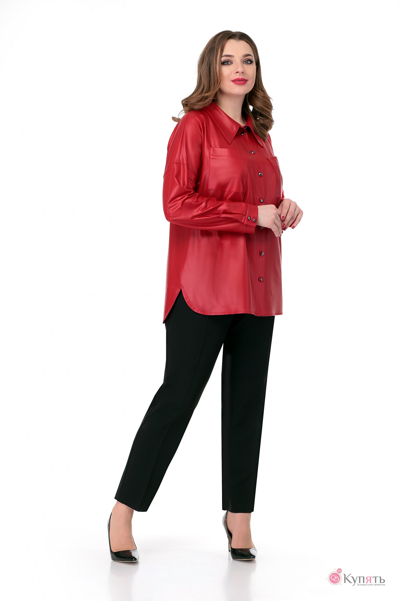 Блуза из трикотажного полотна с покрытием имитирующим кожу.Воротник отложной на стойке.Спинка на кокетке. Длина по спинке-74см. Застежка на петли пуговицы.Рукав на основе цельнокроенного с манжетой и застежкой на две петли пуговицы.Длина рукава-59см.Брюки на поясе,по бокам резинка. Длина брюк-101см