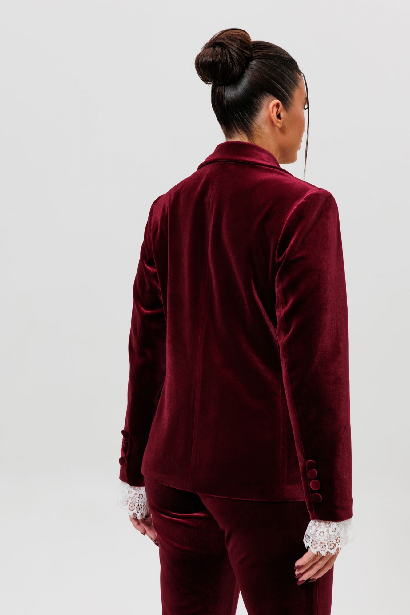 Встретьте Новый год в безупречном образе с этим роскошным бордовым бархатным костюмом. Модель состоит из полуприлегающего жакета на подкладке и эффектных брюк, которые плавно расклешены к низу, создавая женственный и динамичный силуэт. Жакет с отложным воротником и декоративными пуговицами на рукавах подчеркивает стройность фигуры. Его можно носить отдельно с джинсами или юбками, делая образ универсальным. Брюки с притачным поясом удобно сидят по фигуре. Этот праздничный костюм бордового цвета — идеальный выбор для главной ночи года, который подарит вам уверенность и комфорт.