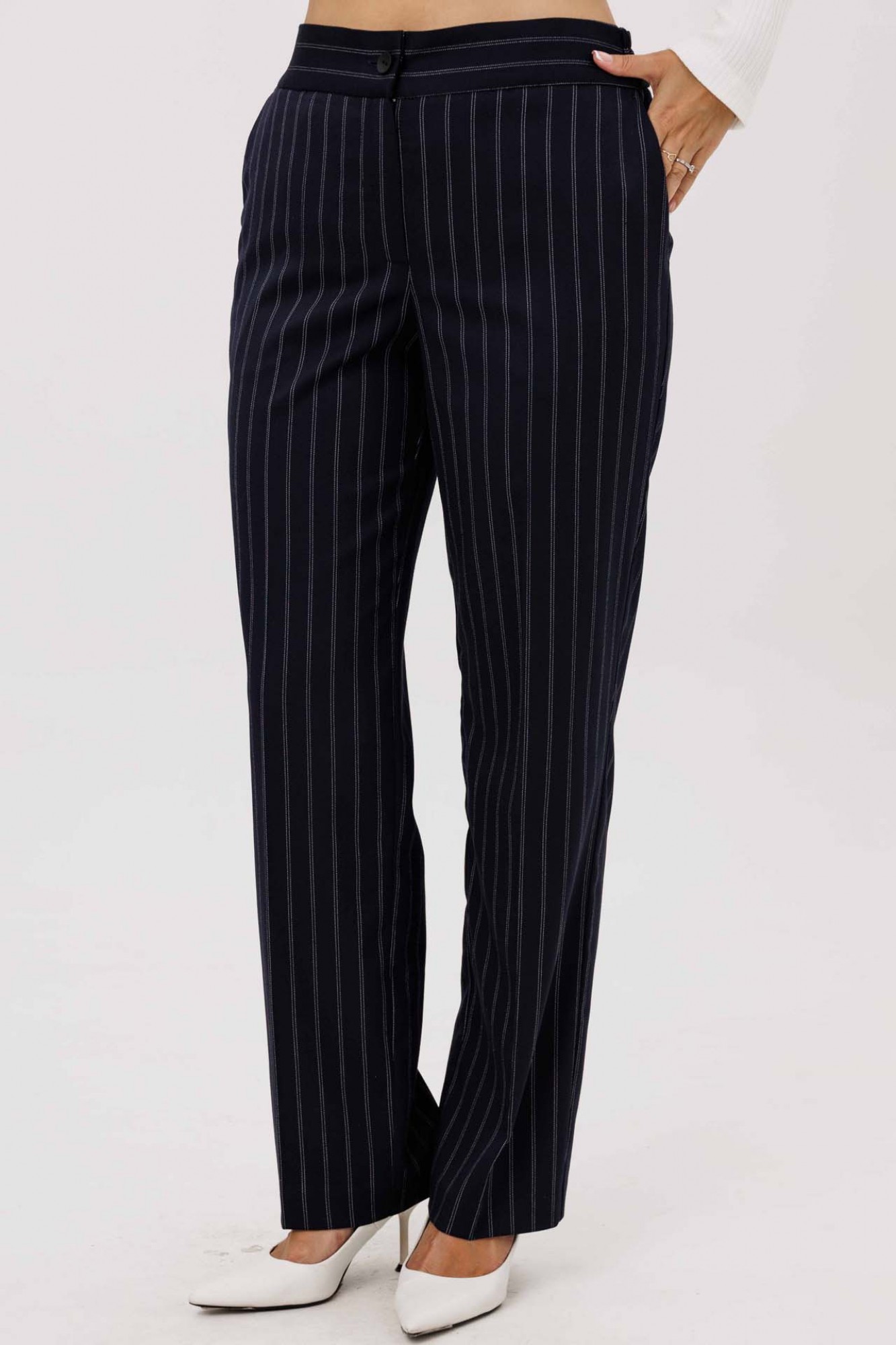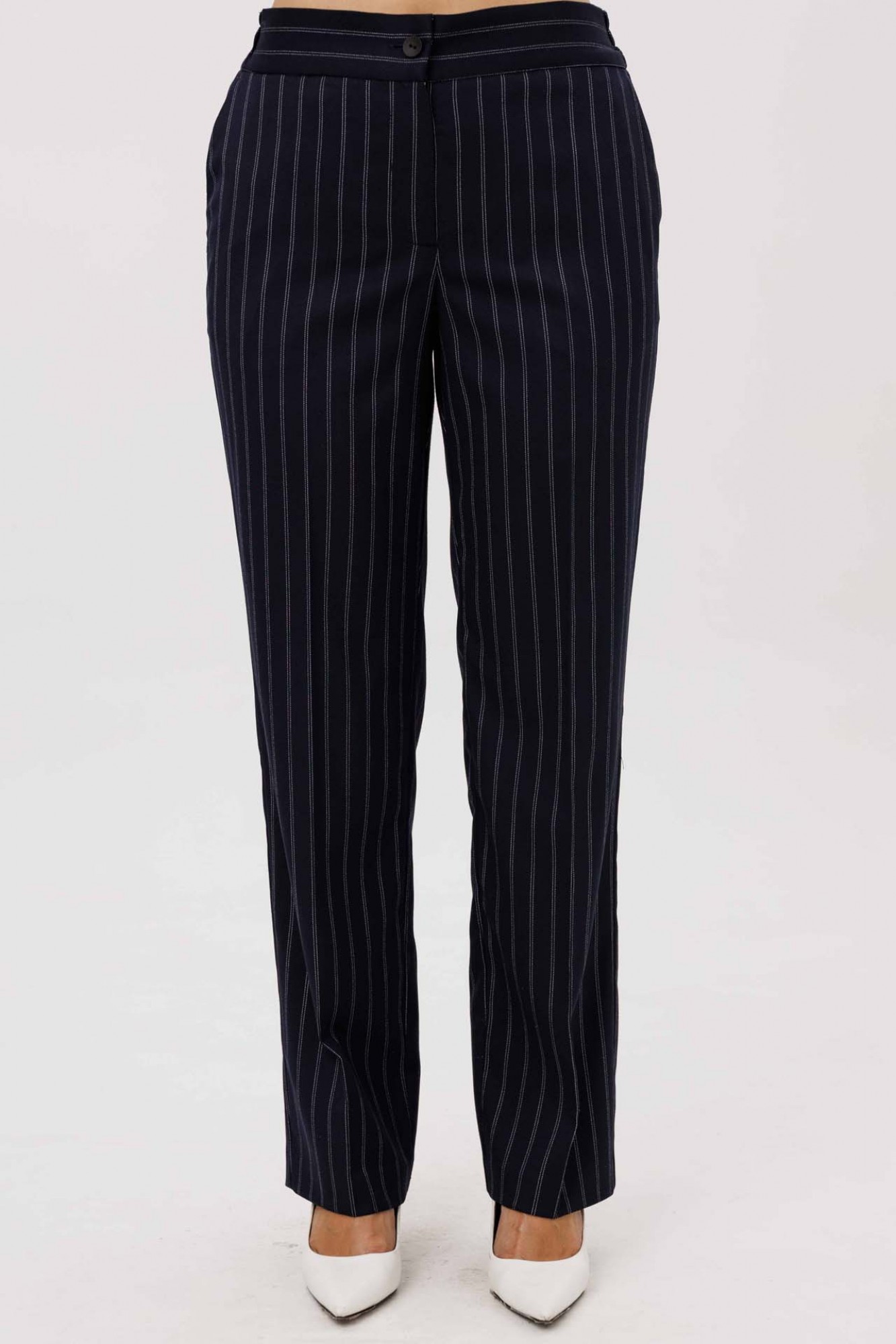Комплект женский, состоящий из жилета, брюк и джемпера. Жилет полуприлегающего силуэта, без подкладки. Плечо спущенное. Вырез V - образный, с воротником стойкой. По переду имитация карманов с клапаном. Центральная застежка на пришивные кнопки. Спинка со средним швом и вытачками. Джемпер без вытачек. Рукава втачные, одношовные, длинные. Ткань в рубчик. Прямой крой. Брюки прямого силуэта, слегка зауженные к низу. Пояс частично на резинке (по бокам), с шлевками для ремня. Застежка на гульфик с молнией и пуговицей. По бокам карманы с косым входом. Материал костюма костюмный, средней плотности, с гладкой фактурой. Без подкладки. Дополняет модель широкий пояс.