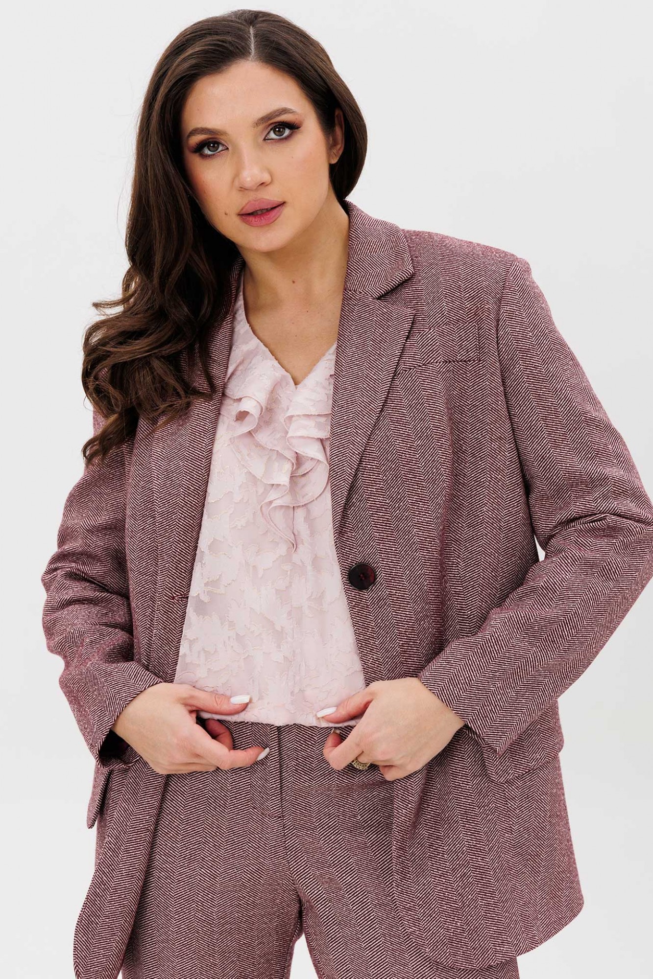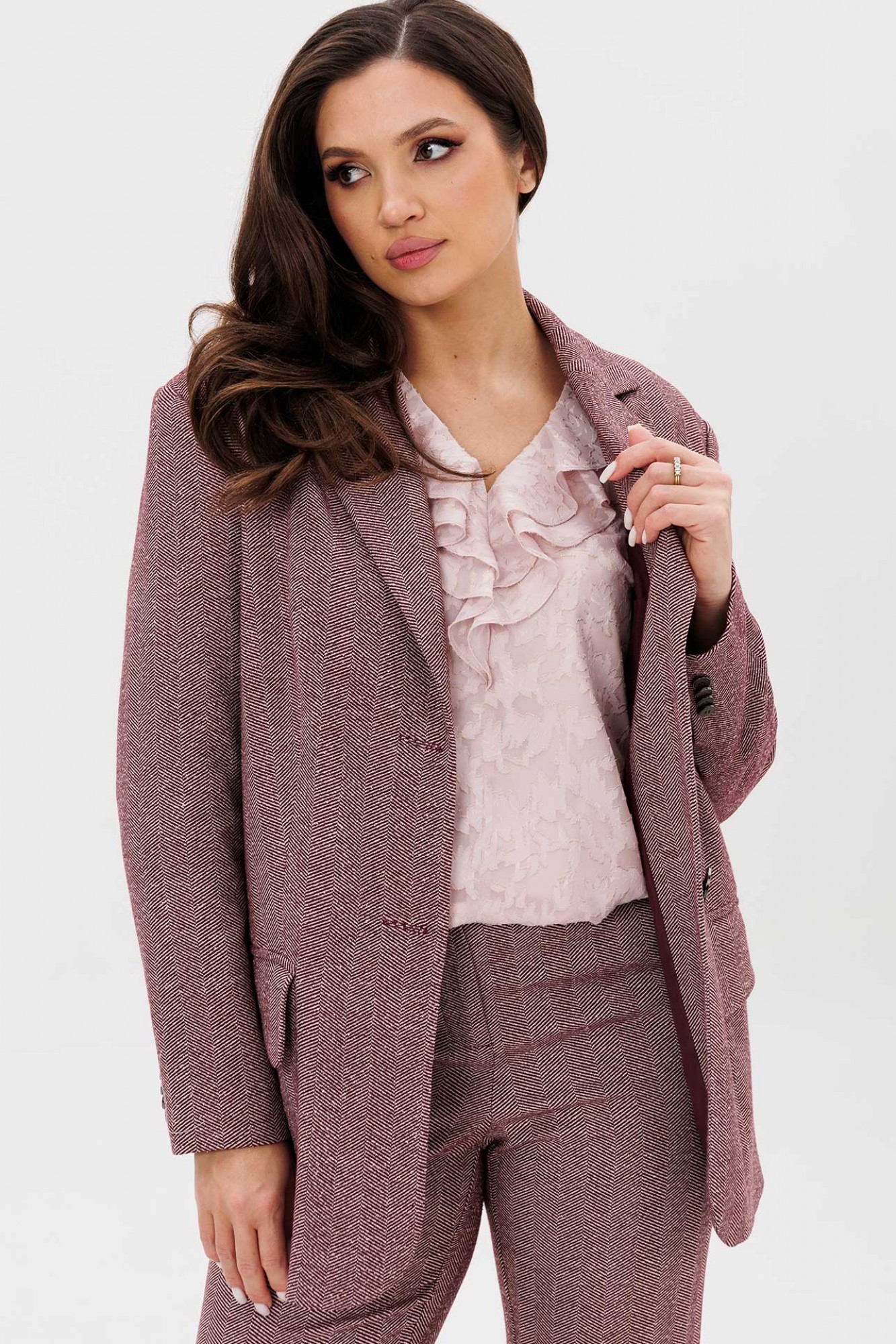 Костюм женский, состоящий из жакета и брюк. Жакет прямого силуэта, на подкладке. Воротник стоячий отложной, с лацканами. Рукав втачной, с имитацией шлицы по низу. Борта закругленные. На левом борту жакета обработана листочка. Карманы прорезные, в рамку с фигурным клапаном. Спинка со средним швом, заканчивающимся шлицей. Брюки полуприлегающего силуэта, расширенные от колена. Пояс притачной с широкими шлевками. Застежка в среднем шве переда на молнию и два крючка. Брюки с  боковыми карманами.