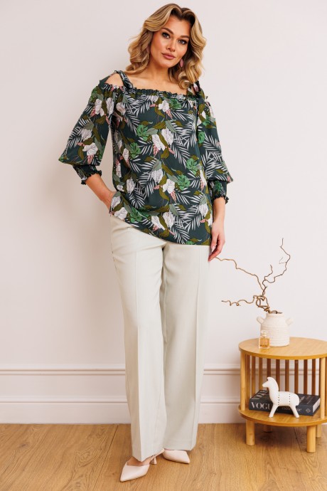 Комплект женский, состоящий из блузы и брюк. Блуза удлиненная, в боковых швах с разрезами. По верхнему краю блузы кулиска с резинкой. Рукав расширенный, на широкой манжете. Для удобства в носке мы дополнили блузу бретелями, которые можно завязать в форме банта. Брюки прямые со стрелками и карманами, спереди на притачном поясе, застежка на тесьму-молнию.