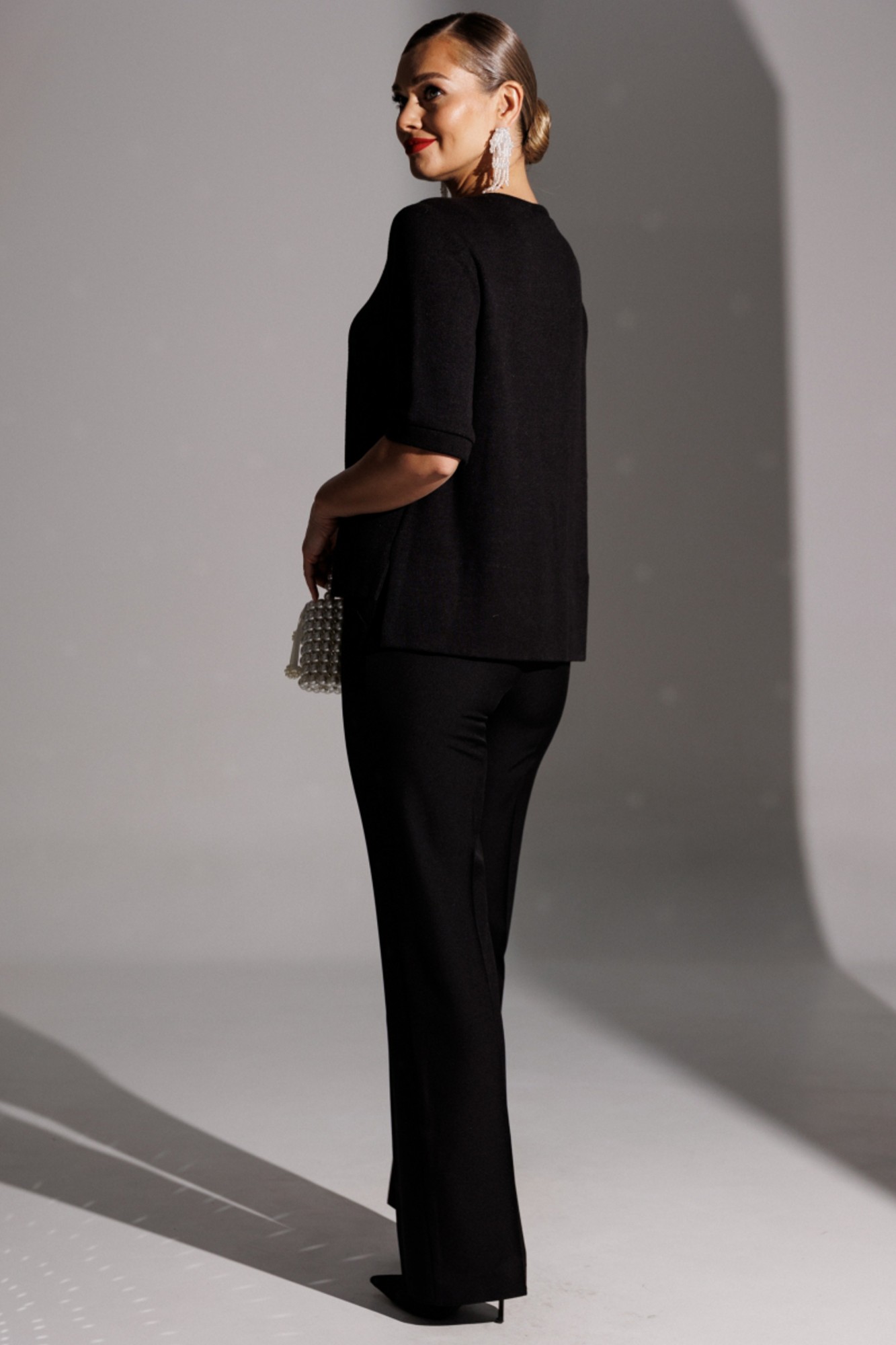 Создать нарядный образ с брюками возможно вместе с нашей новинкой! Комплект состоит из блузы и брюк. Блуза выполнена из тонкого, струящегося трикотажа, имеющего в составе ангору. Блуза полуприлегающего силуэта, по низу с перепадом длины. Перед декорирован акцентным дизайнерским цветком из органзы. Рукав втачной с манжетой. Брюки классические, прямого силуэта, с заутюженными стрелками, боковыми карманами шлевками для ремня.