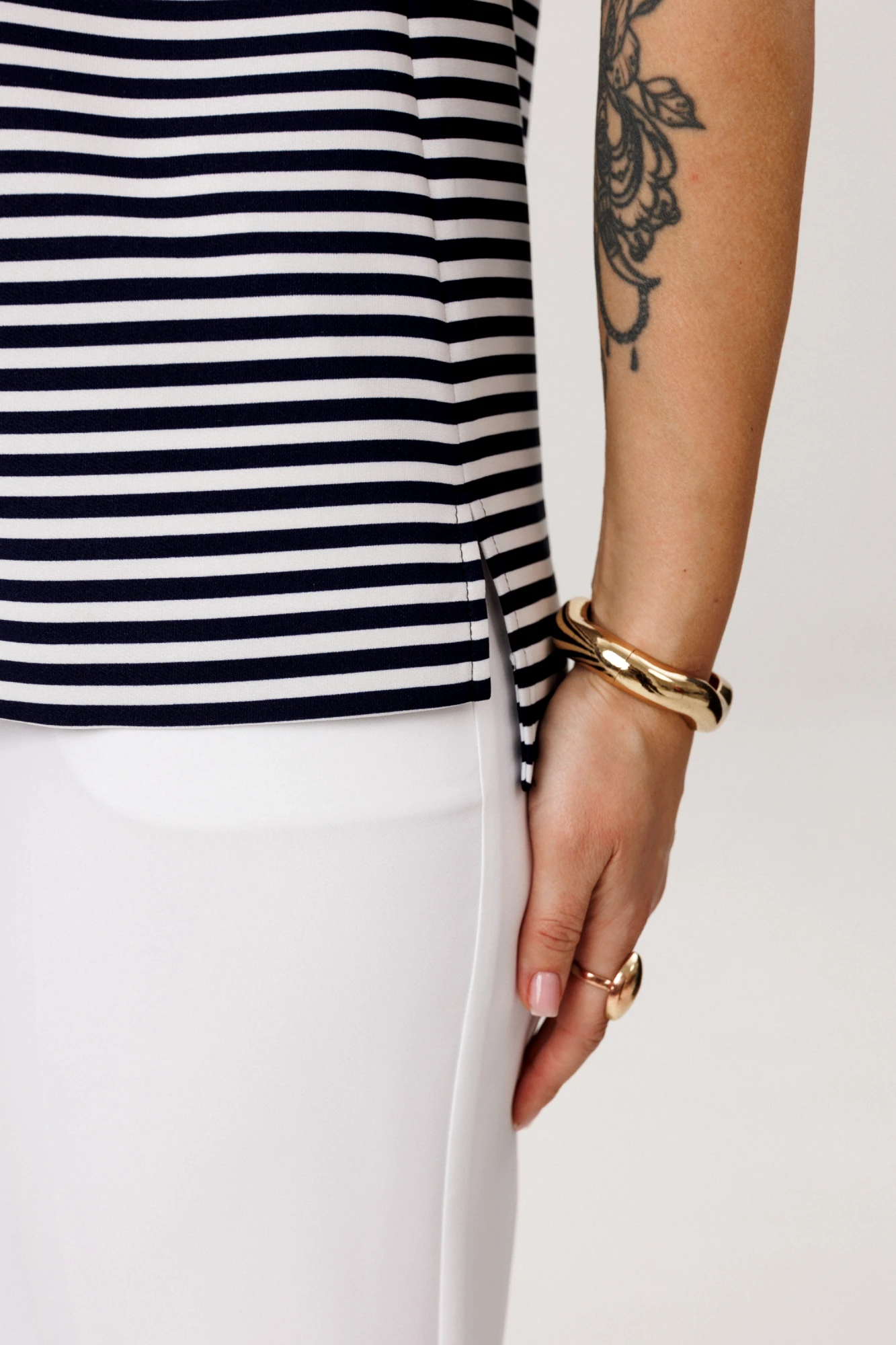 Брюки: ПЭ 96%, спандекс 4% Жакет: ПЭ 65%, вискоза 33%, спандекс 2% Топ: ПЭ 95%, эластан 5%