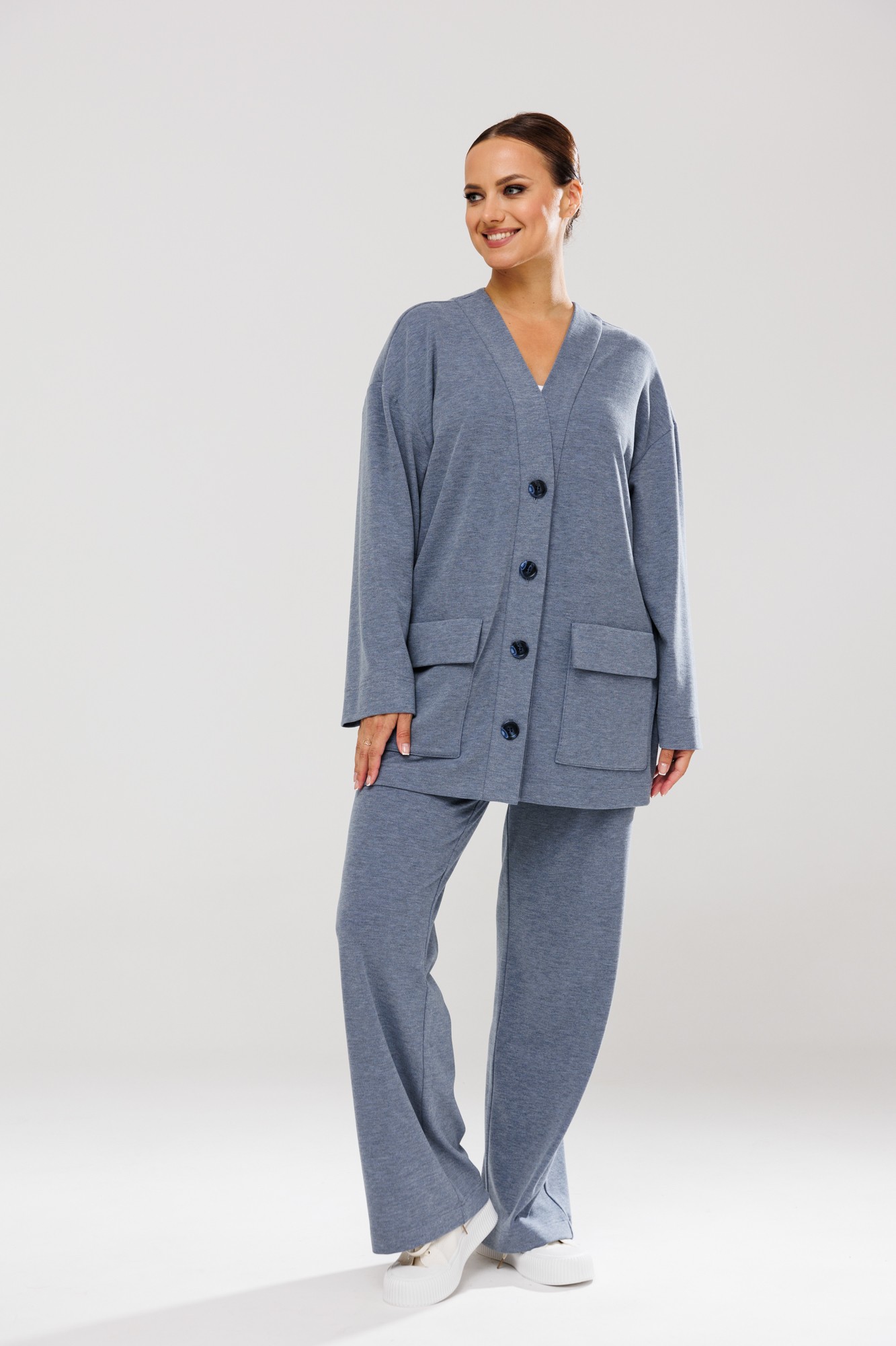 Стильный женский костюм, состоящий из джемпера и брюк. Выполнен из трикотажного полотна (тянется). Кардиган свободного кроя с центральной застежкой - планкой на пришивные пуговицы. Рукав слегка спущен. По переду накладные карманы с клапаном.