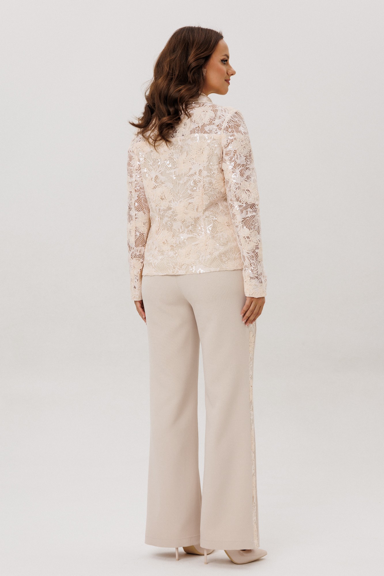 Нарядный женский костюм, состоящий из жакета и брюк, выполненный из костюмной ткани (тянется) и из гипюра с вышивкой и пайетками (не тянется).