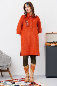 Костюм двухпредметный: состоит из блузы и брюк. Блуза свободного кроя с округлым вырезом горловины. Центральная застёжка на петли и пуговицы. Рукав втачной одношовный спущенный с притачной манжетой на петлю и пуговицу. Спинка с отрезной кокеткой, нижняя часть спинки декорирована плиссированным шифоном. Низ изделия фигурный. Боковые швы с разрезами. Брюки свободного кроя, верхний срез представлен широкой резинкой, с карманами.