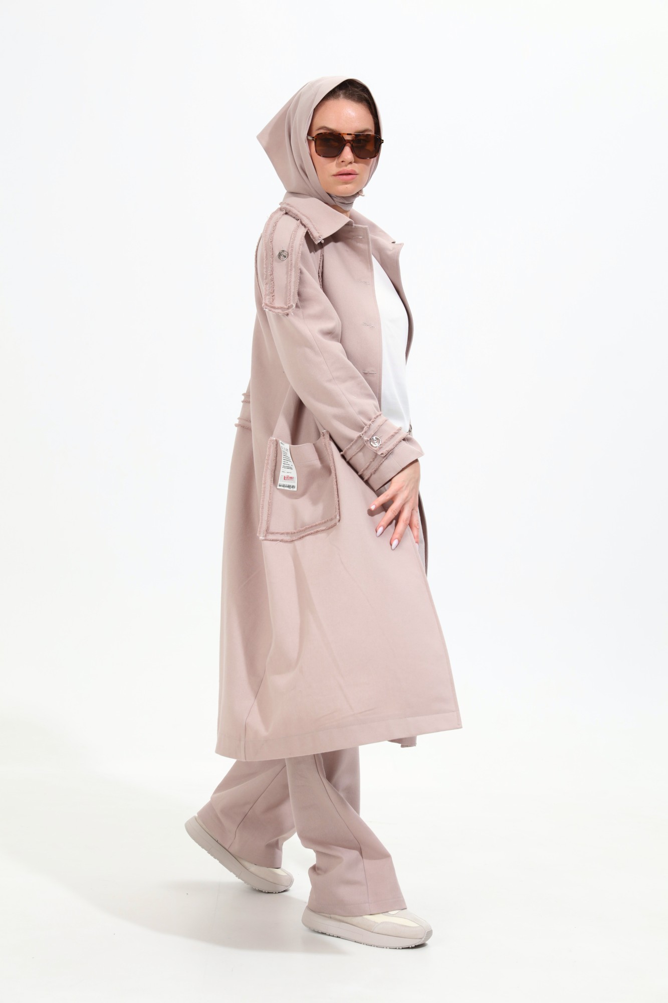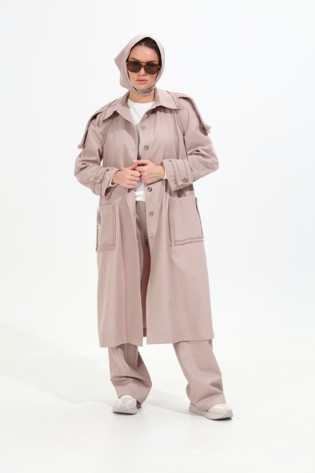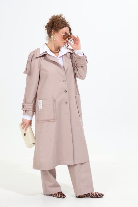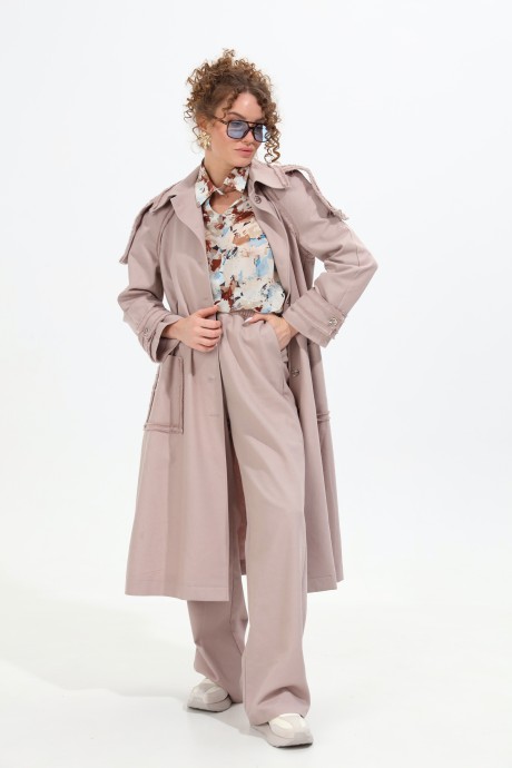 Костюм трёхпредметный: состоит из кардигана, брюк и платка. Кардиган оверсайз, немного расклешенного силуэта, без подкладки. Перед с центральной бортовой застежкой на пуговицы и петли. На детали передней части накладной карман. Спинка со средним швом и расположенным в области талии хлястиком. Рукав покроя реглан. Воротник стояче-отложной. Пришивная декоративная нашивка на кармане по переду. Прямые брюки с двойным поясом из отделочной контрастной ткани. Изделие по линии талии на резинке с имитацией гульфика. Карманы с отрезным бочком. В комплект входит платок.