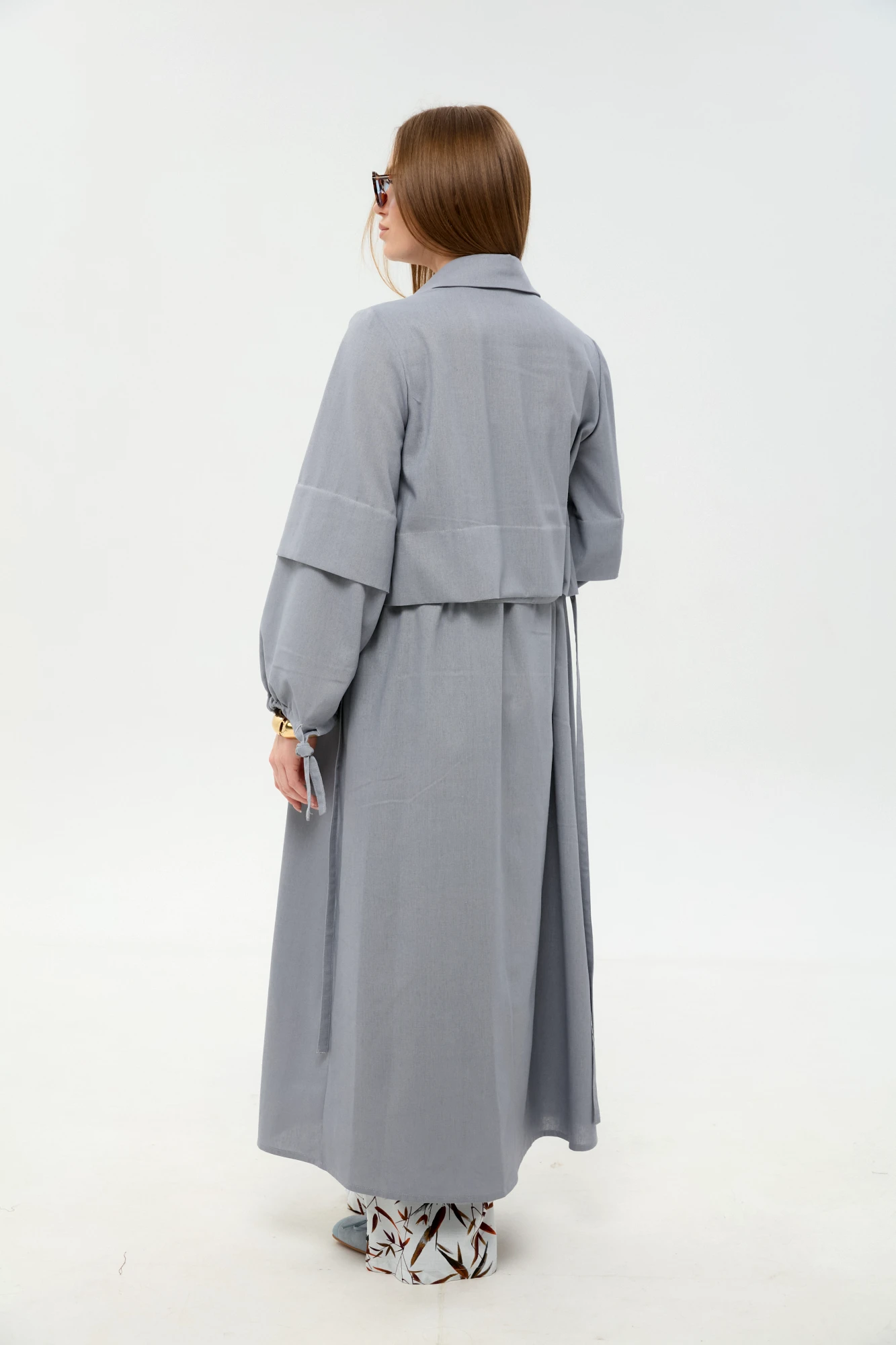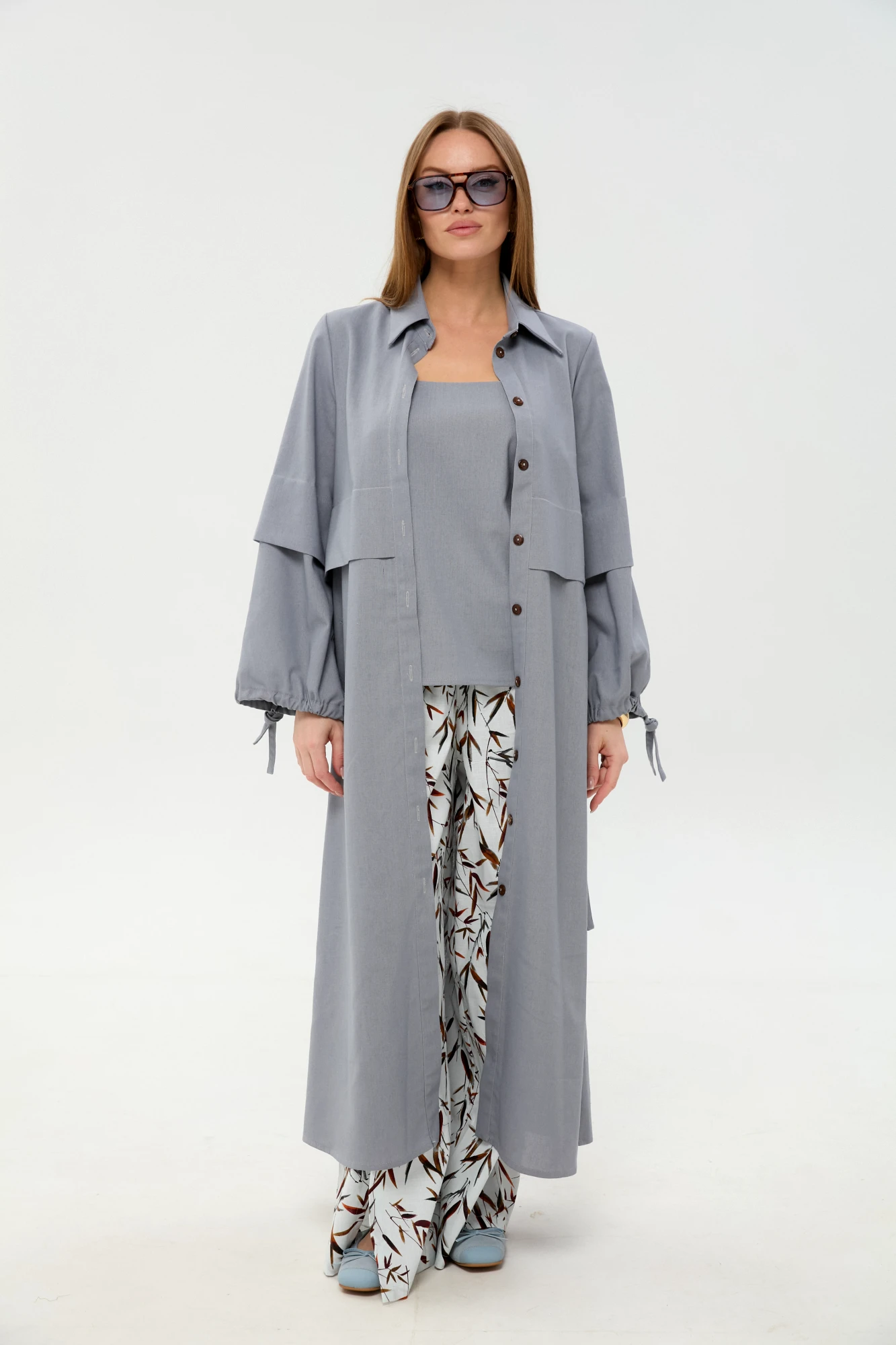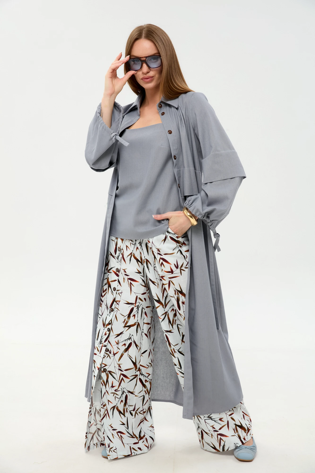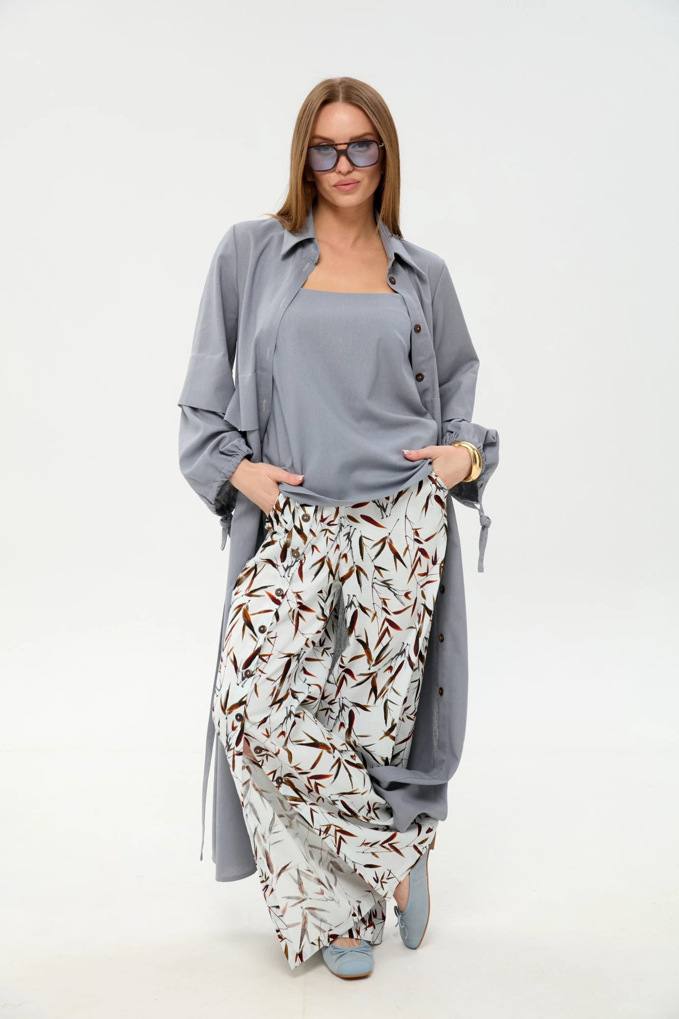 Брючный костюм NikVa н976 тройка -15 серый и листья мультиколор