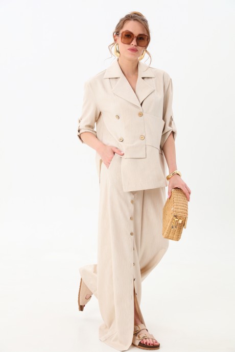 Костюм двухпредметный: состоит из жакета и брюк. Жакет прямого силуэта с имитацией центральной застёжки на пуговицы. Рукав втачной одношовный, длиной три четверти, застегивающийся на пату. Воротник пиджачного типа . Линия низа фигурная, симметричная . По левому переду расположена декоративная деталь. Брюки свободного кроя, верхний срез представлен широкой резинкой, с карманами. По центру правой брючины расположена планка с функционирующими петлями и пуговицами.