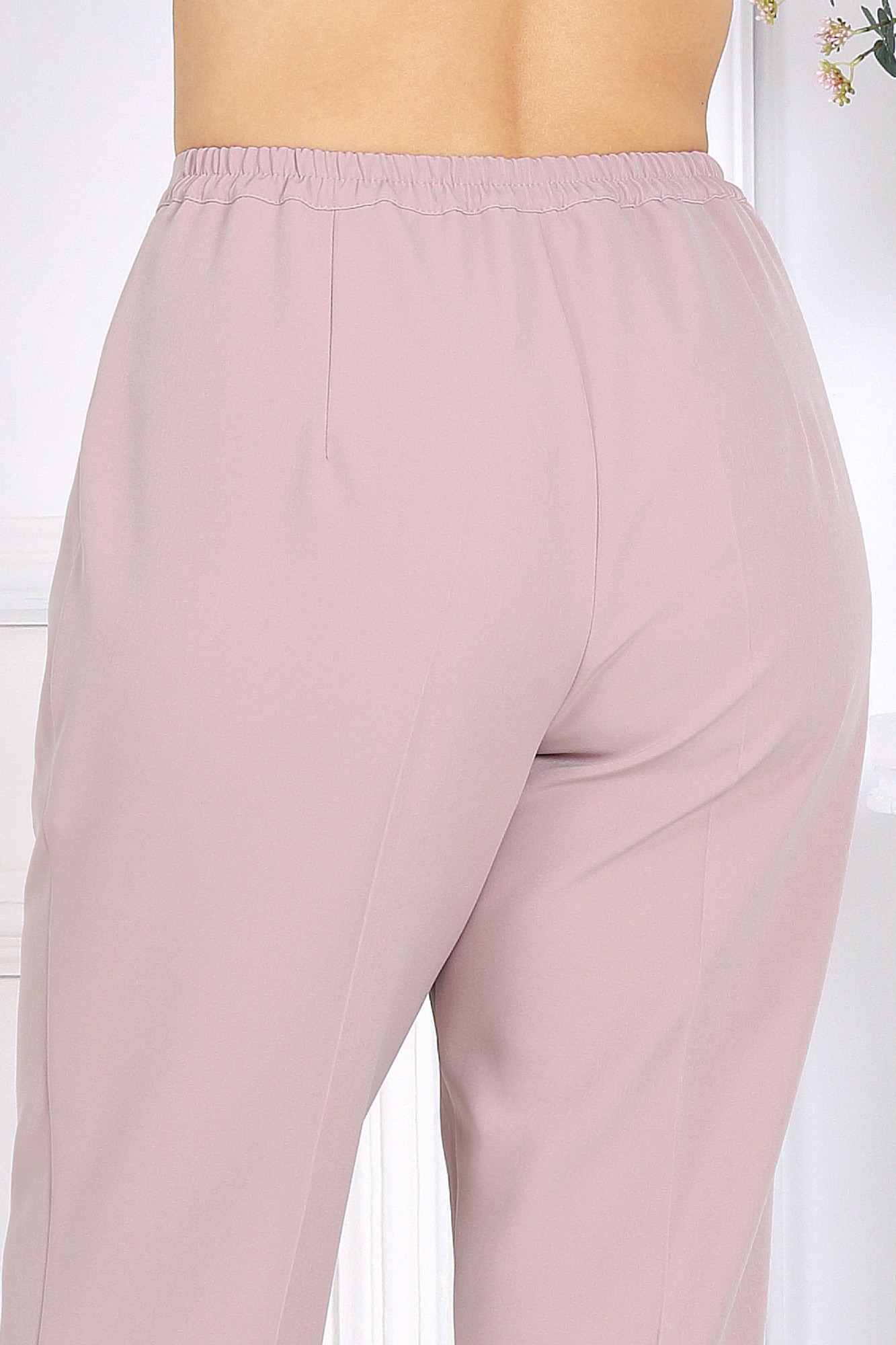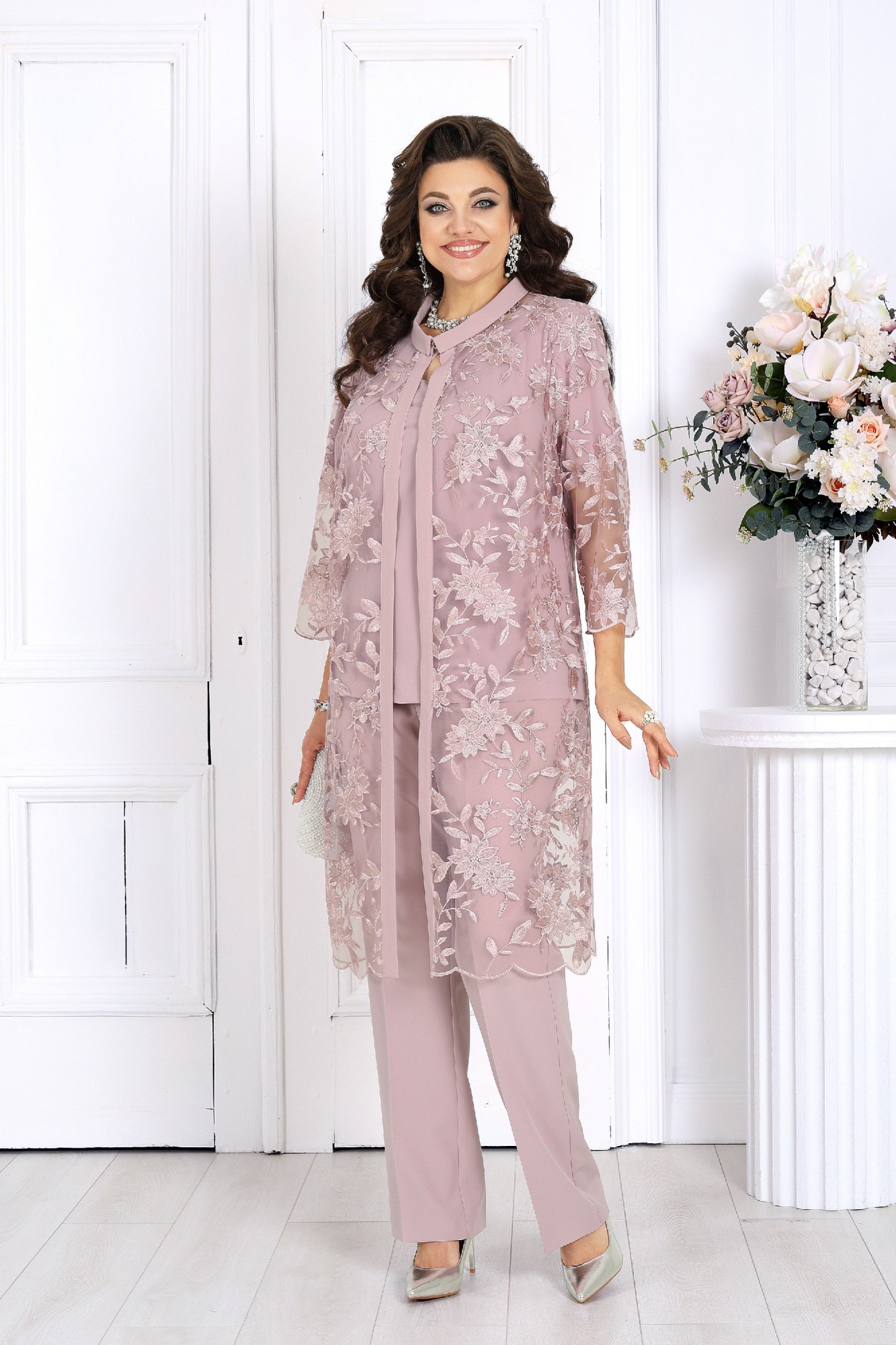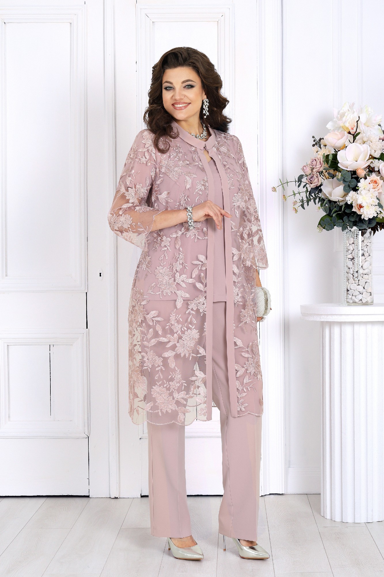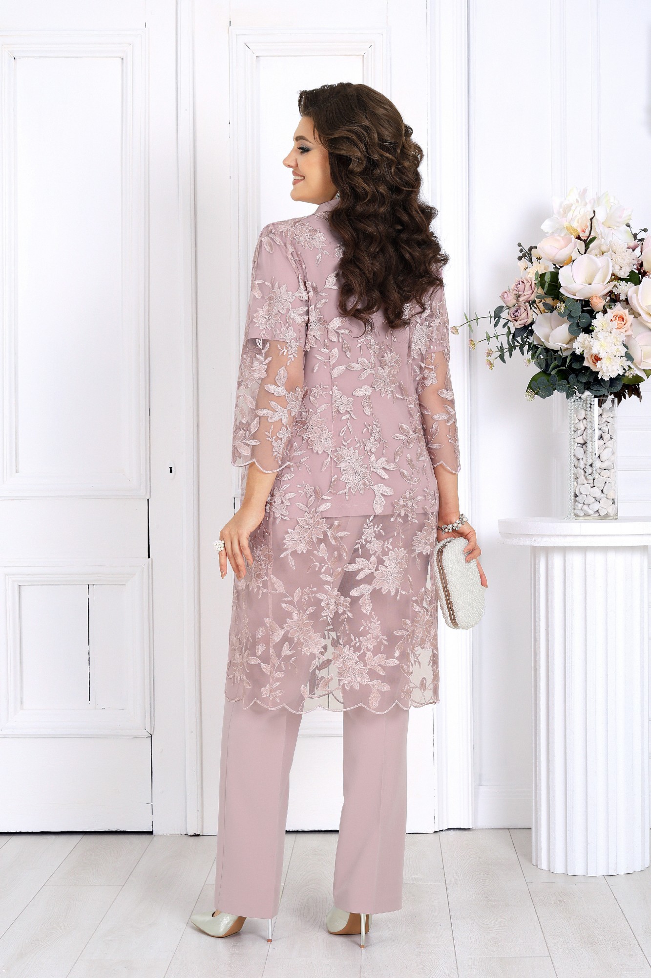 Представляем вашему вниманию изысканный вечерний брючный костюм, созданный для женщин с великолепными формами. Кардиган этого костюма играет ключевую роль в создании правильного силуэта для женщин больших размеров. Мягкие линии и длина кардигана подчеркивают достоинства фигуры, при этом даря ощущение уверенности и гармонии. Эта длина визуально вытягивает силуэт, создавая стройный и изящный образ. Этот вечерний брючный костюм станет прекрасным воплощением вашего стиля и изысканности в праздничных событиях. Комплект брючный 3-х предметный, состоящий из кардигана, выполненного из гипюра, джемпера, выполненного из трикотажного полотна «масло» и брюк, выполненных из костюмно-плательной ткани. Кардиган, полуприлегающего силуэта, длиной по середине спинки 107 см от шва втачивания воротника. Перед с нагрудными вытачками, выходящими из пройм. Борта переда обработаны притачными планками из костюмно-плательной ткани. Спинка с таллиевыми вытачками. Низа переда, спинки оформлены фестонами. Горловина спинки и переда округлая, по переду углубленная, с воротником-стойкой. Концы воротника прямоугольной формы. Кардиган с застежкой на декоративный крючок на уровне воротника. Воротник выполнен из костюмно-плательной ткани. Рукава втачные, одношовные. Длина рукавов 51 см. Низа рукавов оформлены фестонами. Джемпер полуприлегающего силуэта, длиной по середине спинки 66 см. Боковые части переда с рельефами от горловины до низа, и центральной частью переда, переходящей в прямоугольный вырез горловины. Горловина переда и спинки округлая, углубленная, окантованная. Спинка с таллиевыми вытачками. Рукава втачные, одношовные, длиной 21 см. Брюки классические, с посадкой на талии, на притачном поясе, с застёжкой на тесьму-«молния», расположенную в среднем шве передних половинок, и 1 петлю и 1 пуговицу на поясе. Передние и задние половинки брюк с таллиевыми вытачками, идущими от пояса вниз, с заутюженными стрелками, с боковыми наклонными карманами на передних половинках. Для лучшего прилегания брюк в области талии в поясе со стороны спинки вставлена резинка.