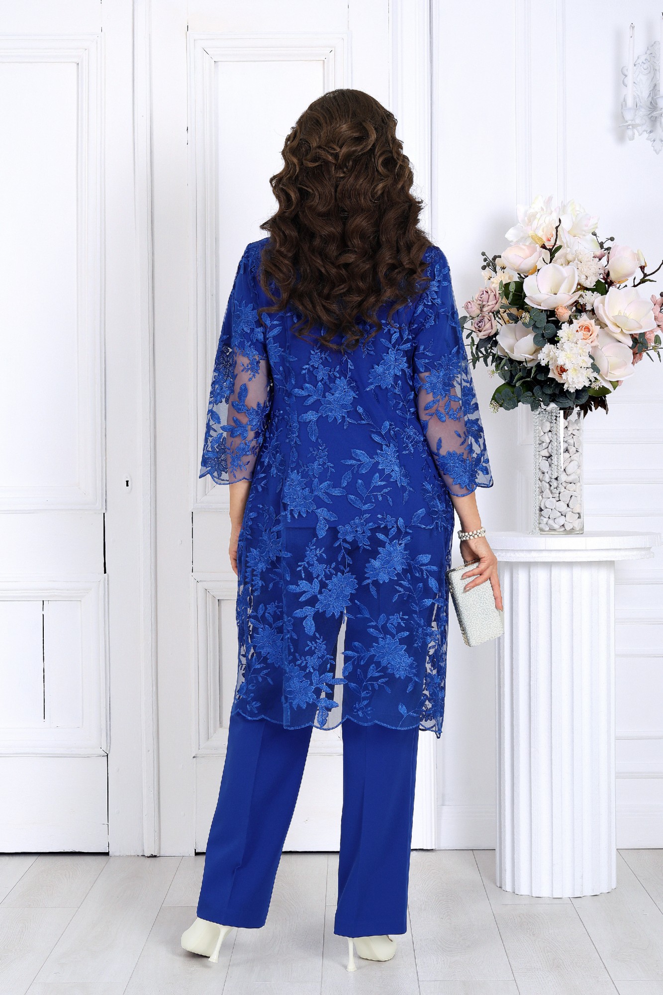 Представляем вашему вниманию изысканный вечерний брючный костюм, созданный для женщин с великолепными формами. Кардиган этого костюма играет ключевую роль в создании правильного силуэта для женщин больших размеров. Мягкие линии и длина кардигана подчеркивают достоинства фигуры, при этом даря ощущение уверенности и гармонии. Эта длина визуально вытягивает силуэт, создавая стройный и изящный образ. Этот вечерний брючный костюм станет прекрасным воплощением вашего стиля и изысканности в праздничных событиях. Комплект брючный 3-х предметный, состоящий из кардигана, выполненного из гипюра, джемпера, выполненного из трикотажного полотна «масло» и брюк, выполненных из костюмно-плательной ткани. Кардиган, полуприлегающего силуэта, длиной по середине спинки 107 см от шва втачивания воротника. Перед с нагрудными вытачками, выходящими из пройм. Борта переда обработаны притачными планками из костюмно-плательной ткани. Спинка с таллиевыми вытачками. Низа переда, спинки оформлены фестонами. Горловина спинки и переда округлая, по переду углубленная, с воротником-стойкой. Концы воротника прямоугольной формы. Кардиган с застежкой на декоративный крючок на уровне воротника. Воротник выполнен из костюмно-плательной ткани. Рукава втачные, одношовные. Длина рукавов 51 см. Низа рукавов оформлены фестонами. Джемпер полуприлегающего силуэта, длиной по середине спинки 66 см. Боковые части переда с рельефами от горловины до низа, и центральной частью переда, переходящей в прямоугольный вырез горловины. Горловина переда и спинки округлая, углубленная, окантованная. Спинка с таллиевыми вытачками. Рукава втачные, одношовные, длиной 21 см. Брюки классические, с посадкой на талии, на притачном поясе, с застёжкой на тесьму-«молния», расположенную в среднем шве передних половинок, и 1 петлю и 1 пуговицу на поясе. Передние и задние половинки брюк с таллиевыми вытачками, идущими от пояса вниз, с заутюженными стрелками, с боковыми наклонными карманами на передних половинках. Для лучшего прилегания брюк в области талии в поясе со стороны спинки вставлена резинка.