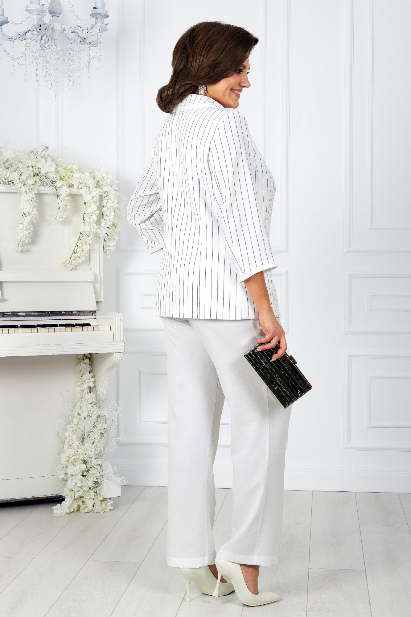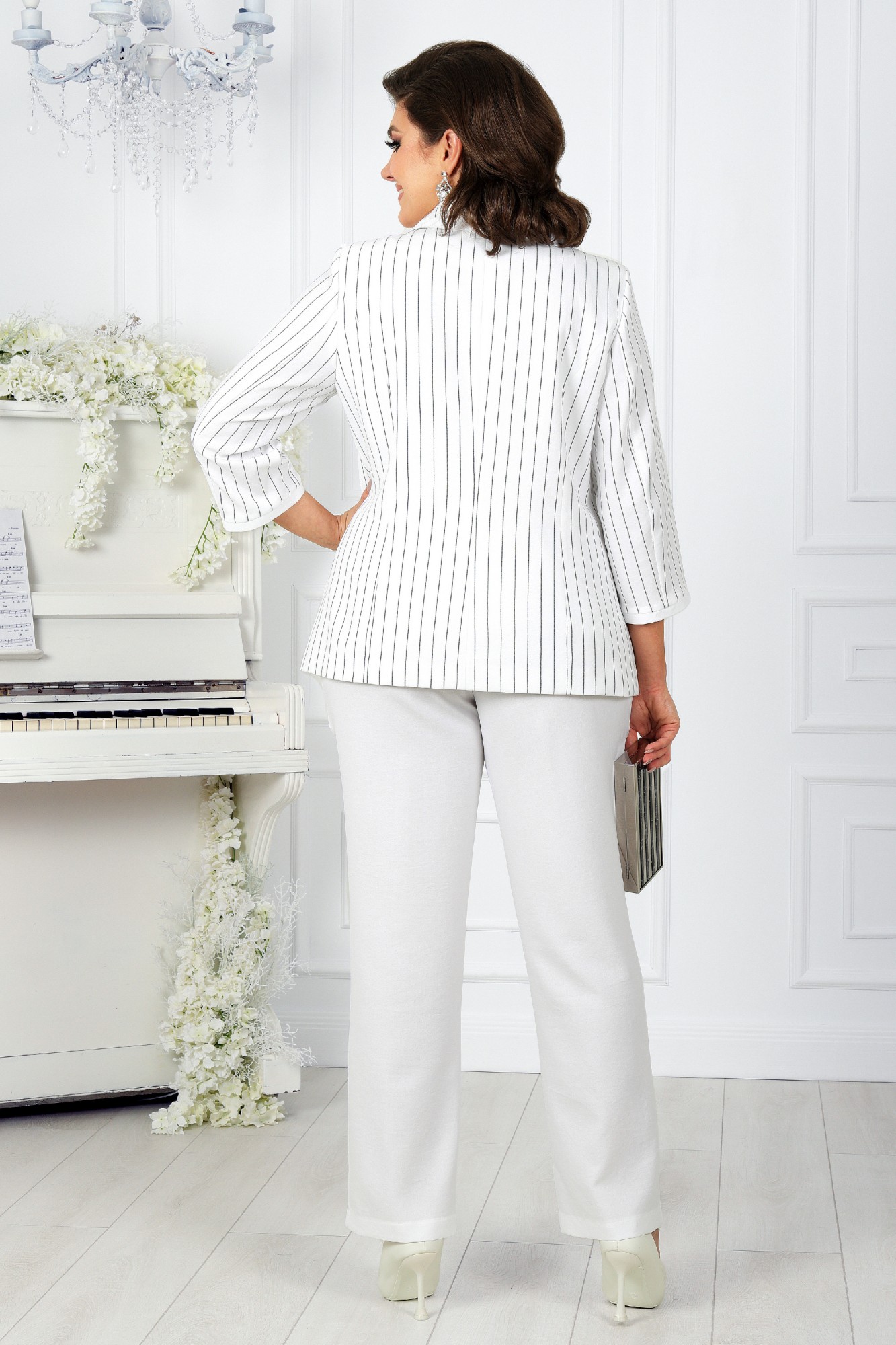 Комплект брючный, 2-х предметный, состоящий из жакета, выполненного из ткани полоска лен вишер, и брюк из однотонного льна вишер.
