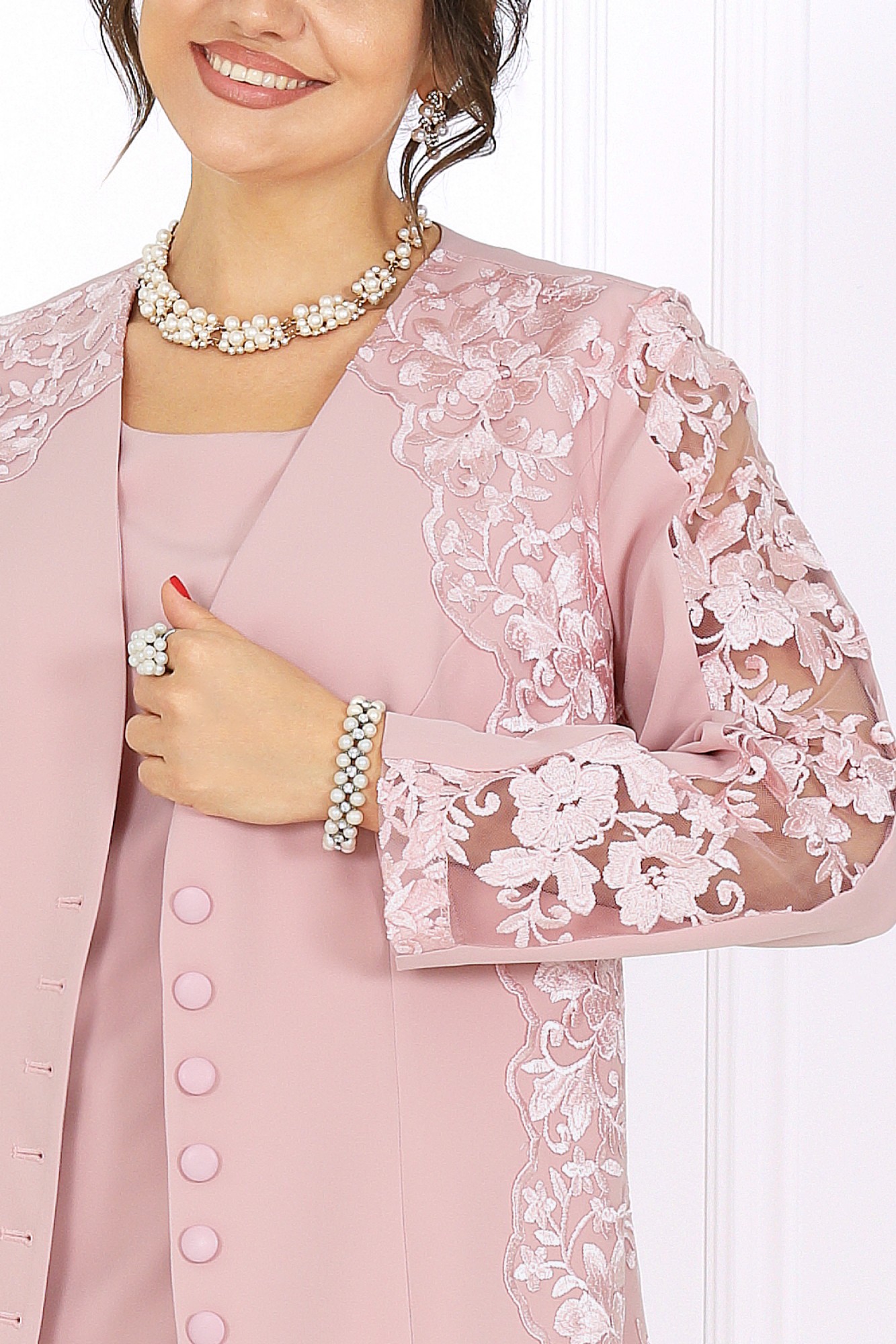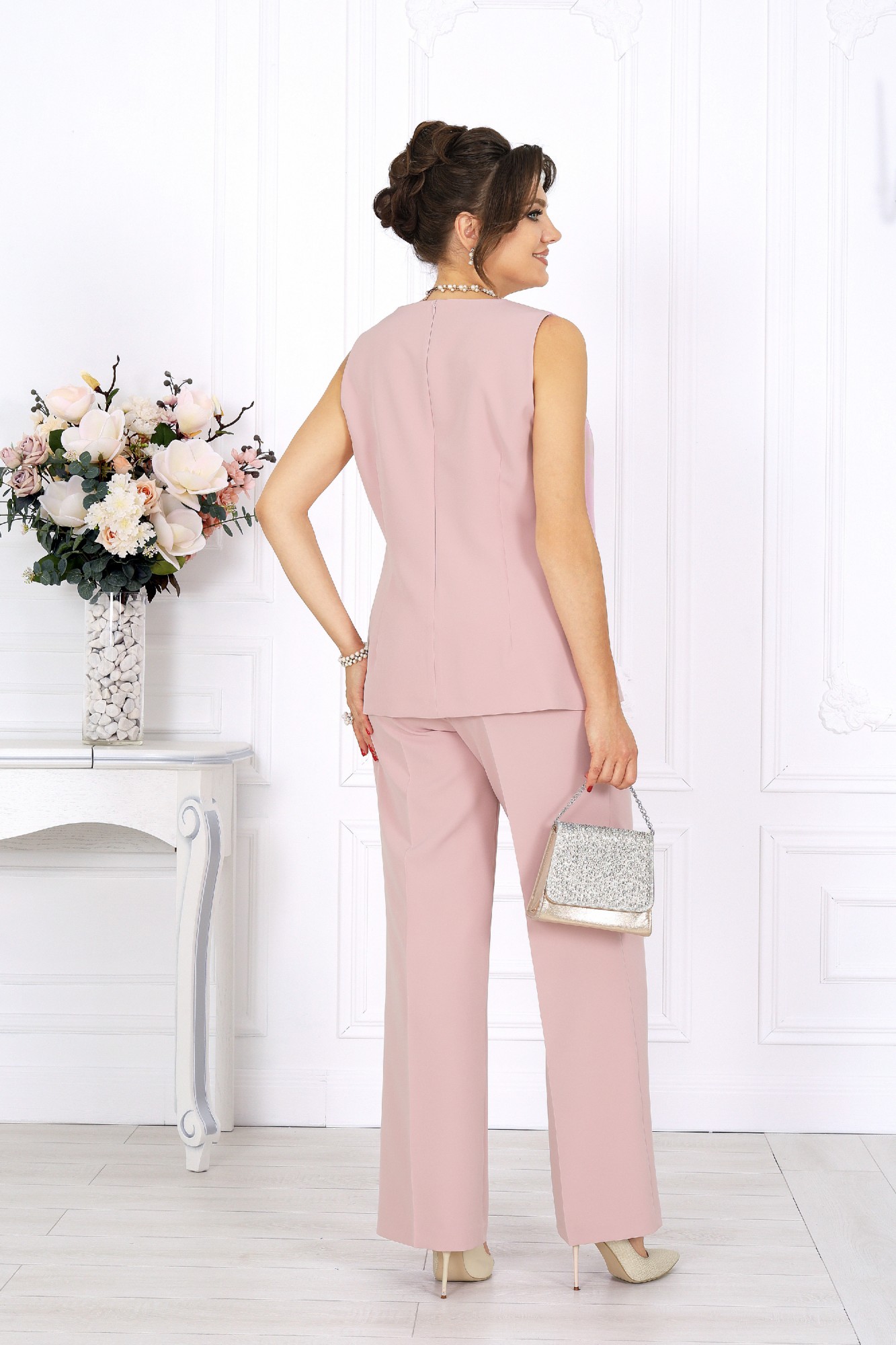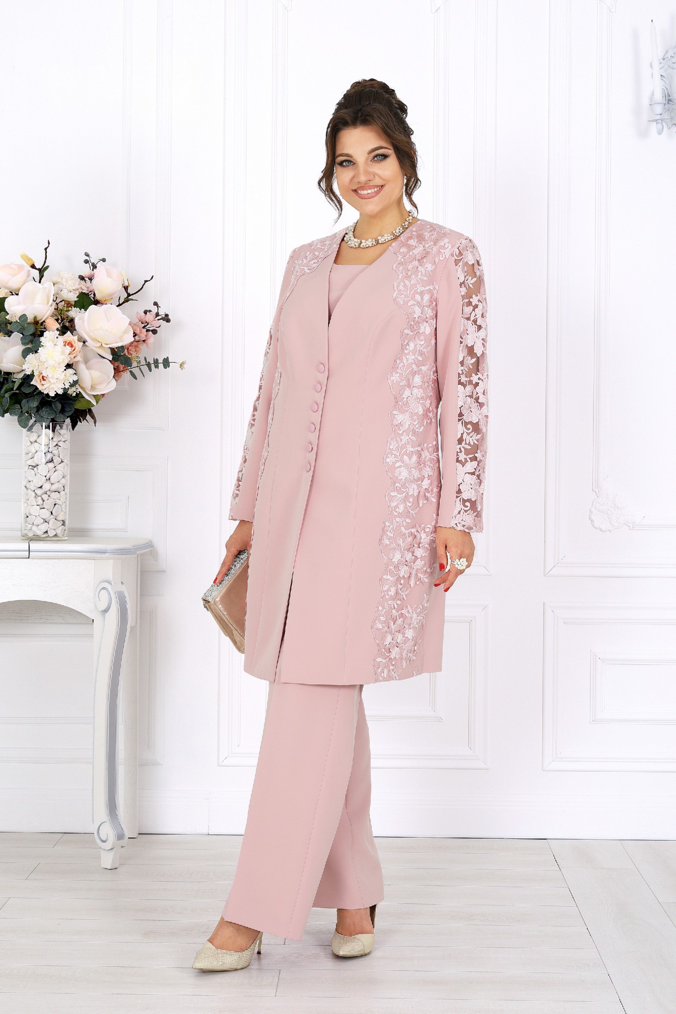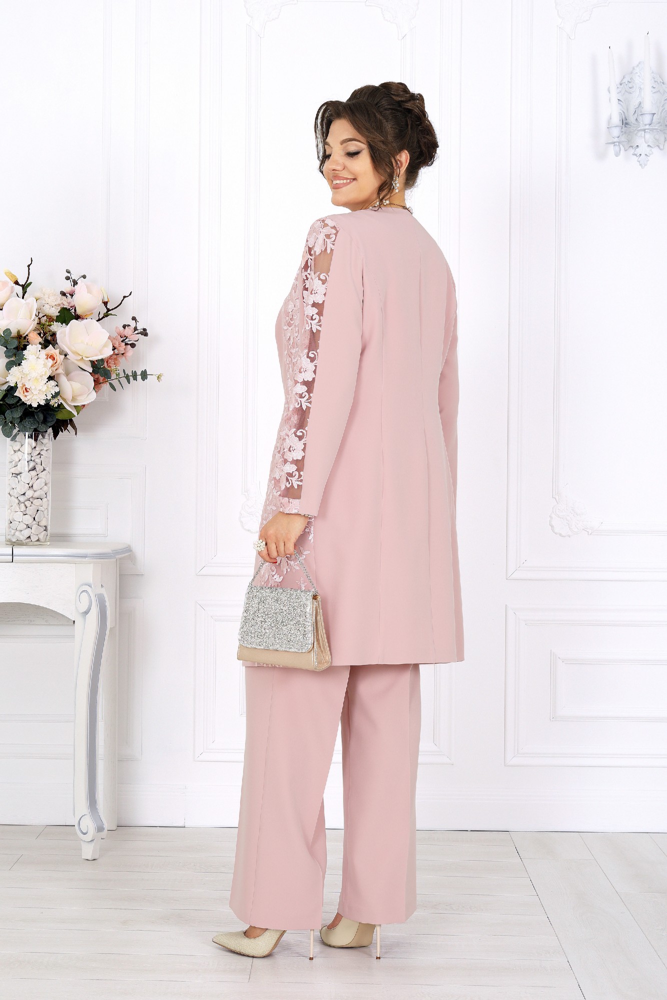 Этот костюм-тройка универсален и вне времени: он одинаково уместен на торжестве, в офисе или на важной встрече. В нём вы будете выглядеть элегантно и уверенно, будь то вечер в театре, семейное событие или праздник, где хочется блистать, сохранив безупречный вкус. Мягкий полуприлегающий силуэт формирует идеальные пропорции, а продуманные линии визуально вытягивают фигуру, создавая ощущение лёгкости и стройности. Выбирая этот наряд, вы выбираете гармонию — между комфортом и красотой, строгостью и женственностью, классикой и современностью. Это не просто костюм — это отражение вашего внутреннего достоинства и стиля. Комплект брючный 3-х предметный, состоящий из кардигана, блузки и брюк. Кардиган полуприлегающего силуэта, выполнен из костюмно-плательной ткани и гипюра. Модель без воротника и плечевых накладок. Перед на подкладке, с рельефными швами, направленными от проймы до низа, и центральной застежкой на 6 прорезных петель и 6 пуговиц. В области горловины, плеча и боковой части переда настрочены декоративные элементы из гипюра с фестонами по краю. Спинка со средним швом и рельефами, направленными от проймы до низа. Горловина округлая по спинке, спереди V-образная, углубленная. Рукав длинный, втачной, со вставкой из гипюра в верхней части. Блузка полуприлегающего силуэта, выполнена из костюмно-плательной ткани. Модель без подкладки, воротника, рукавов и плечевых накладок. Перед с нагрудными вытачками. Спинка с таллиевыми вытачками и средним швом, в верхней части которого обработана застежка на потайную тесьму-«молнию» (50 см). Горловина округлая, углубленная спереди. Брюки классические, длинные, с посадкой на талии, выполнены из костюмно- плательной ткани. Модель со стрелками. Передние и задние половинки брюк с таллиевыми вытачками, направленными от пояса вниз. Спереди обработаны наклонные боковые карманы и центральная застёжка на тесьму-«молнию». Притачной пояс застегивается на 1 петлю и 1 пуговицу; для лучшего прилегания по линии талии в притачном поясе предусмотрена эластичная лента, вставленная по спинке.