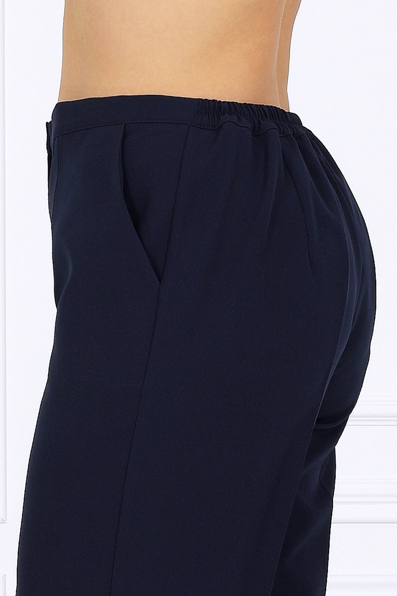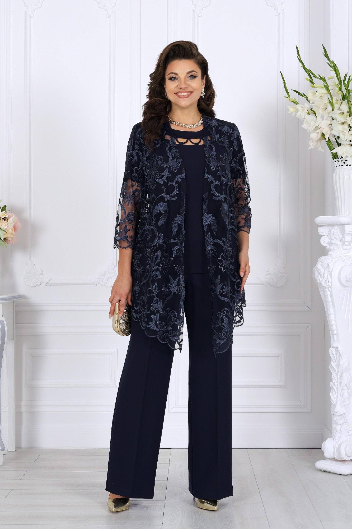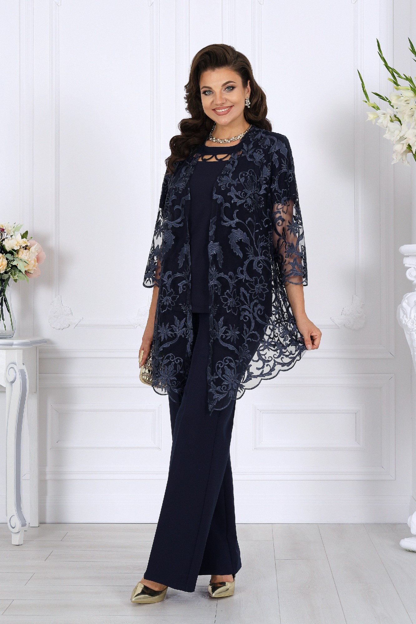 Праздничный брючный костюм-тройка для полных женщин — элегантный выбор для особых случаев и стильных деловых образов. Комплект состоит из трёх предметов: изысканного кардигана из гипюра, мягкой трикотажной блузки и классических брюк со стрелками. Такой ансамбль выглядит нарядно, подчеркивает женственность и формирует правильный силуэт даже для фигур plus size. Такой универсальный костюм тройка подходит для праздничных мероприятий, свадеб, юбилеев, корпоративов, а также для делового офиса или официальных. встреч. Он помогает создать безупречный, продуманный образ, скрыть небольшие несовершенства и подчеркнуть достоинства фигуры. Комплект брючный 3-х предметный, состоящий из кардигана, блузки и брюк. Кардиган прямого силуэта, выполнен из гипюра. Модель без застежки, без подкладки и плечевых накладок. Низ кардигана удлинен спереди. Рукав трехчетвертной. Низ изделия и низ рукава оформлены фестонами. Длина кардигана – 74 см; длина рукава – 48 см. Блузка полуприлегающего силуэта, выполнена из трикотажного полотна «масло». Модель без плечевых накладок. Фигурный вырез переда с декоративным элементом в виде узора, выложенного шнуром из основной ткани. Горловина округлой формы, с отрезной бейкой по переду. Рукав короткий, втачной. Длина блузки – 63 см; длина рукава – 22 см. Брюки классические, длинные, с посадкой на талии, выполнены из костюмно- плательной ткани. Модель со стрелками. Передние и задние половинки брюк с таллиевыми вытачками, направленными от пояса вниз. Спереди обработаны наклонные боковые карманы и центральная застёжка на тесьму-«молнию». Притачной пояс застегивается на 1 петлю и 1 пуговицу; для лучшего прилегания по линии талии в притачном поясе предусмотрена эластичная лента, вставленная по спинке. Длина брюк по боковому (с поясом) – 107 см (50-52 р-р), 108 см 954-58 р-р).