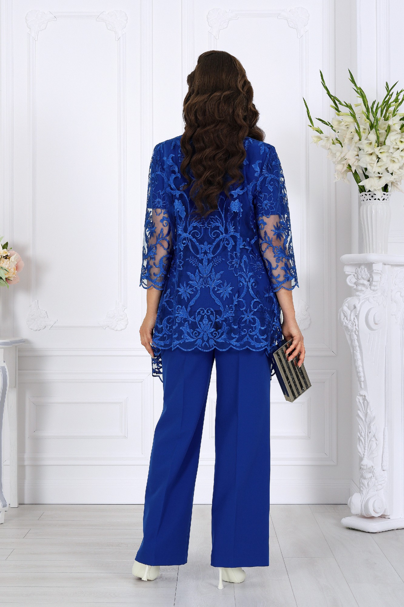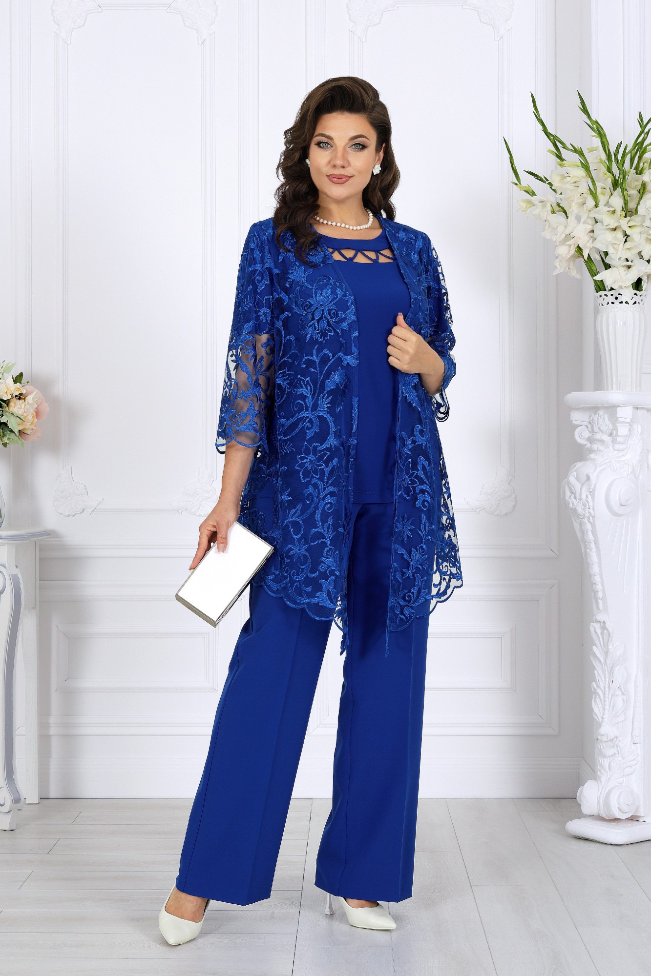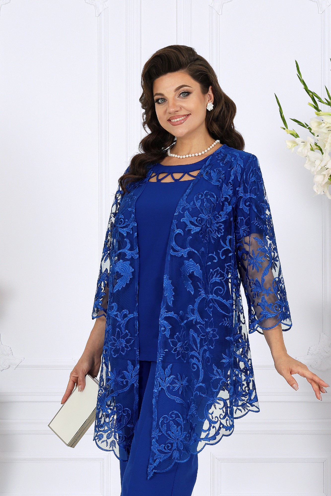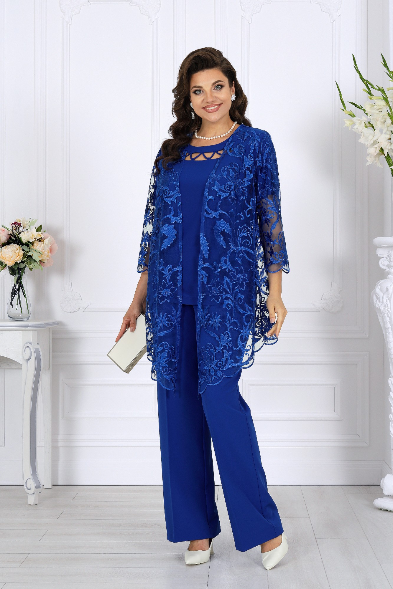 Праздничный брючный костюм-тройка для полных женщин — элегантный выбор для особых случаев и стильных деловых образов. Комплект состоит из трёх предметов: изысканного кардигана из гипюра, мягкой трикотажной блузки и классических брюк со стрелками. Такой ансамбль выглядит нарядно, подчеркивает женственность и формирует правильный силуэт даже для фигур plus size. Такой универсальный костюм тройка подходит для праздничных мероприятий, свадеб, юбилеев, корпоративов, а также для делового офиса или официальных. встреч. Он помогает создать безупречный, продуманный образ, скрыть небольшие несовершенства и подчеркнуть достоинства фигуры. Комплект брючный 3-х предметный, состоящий из кардигана, блузки и брюк. Кардиган прямого силуэта, выполнен из гипюра. Модель без застежки, без подкладки и плечевых накладок. Низ кардигана удлинен спереди. Рукав трехчетвертной. Низ изделия и низ рукава оформлены фестонами. Длина кардигана – 74 см; длина рукава – 48 см. Блузка полуприлегающего силуэта, выполнена из трикотажного полотна «масло». Модель без плечевых накладок. Фигурный вырез переда с декоративным элементом в виде узора, выложенного шнуром из основной ткани. Горловина округлой формы, с отрезной бейкой по переду. Рукав короткий, втачной. Длина блузки – 63 см; длина рукава – 22 см. Брюки классические, длинные, с посадкой на талии, выполнены из костюмно- плательной ткани. Модель со стрелками. Передние и задние половинки брюк с таллиевыми вытачками, направленными от пояса вниз. Спереди обработаны наклонные боковые карманы и центральная застёжка на тесьму-«молнию». Притачной пояс застегивается на 1 петлю и 1 пуговицу; для лучшего прилегания по линии талии в притачном поясе предусмотрена эластичная лента, вставленная по спинке. Длина брюк по боковому (с поясом) – 107 см (50-52 р-р), 108 см 954-58 р-р).