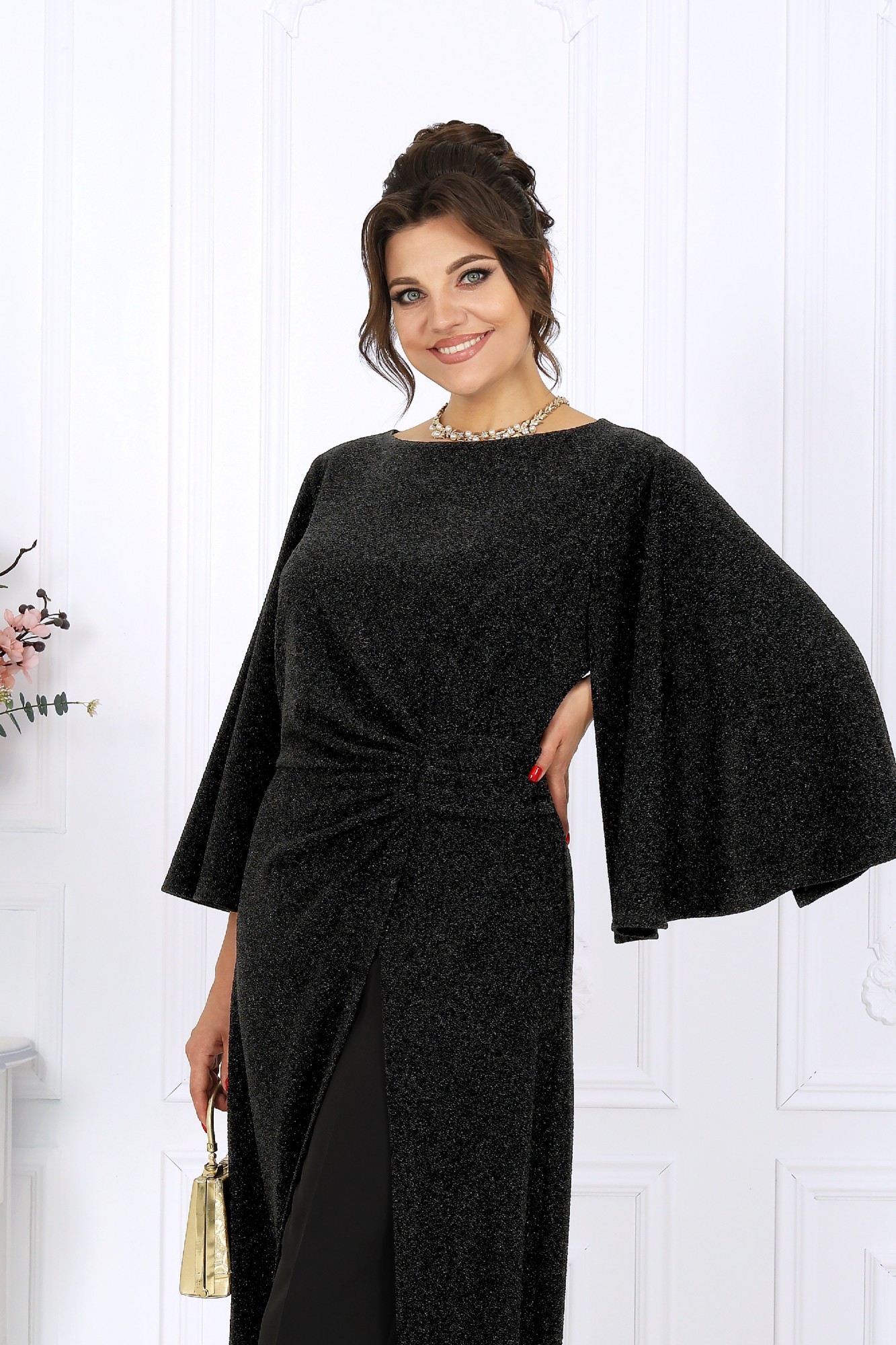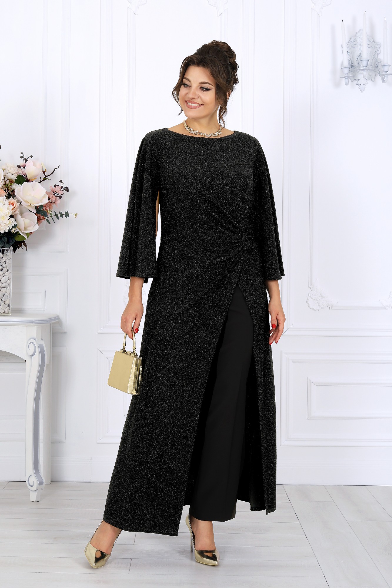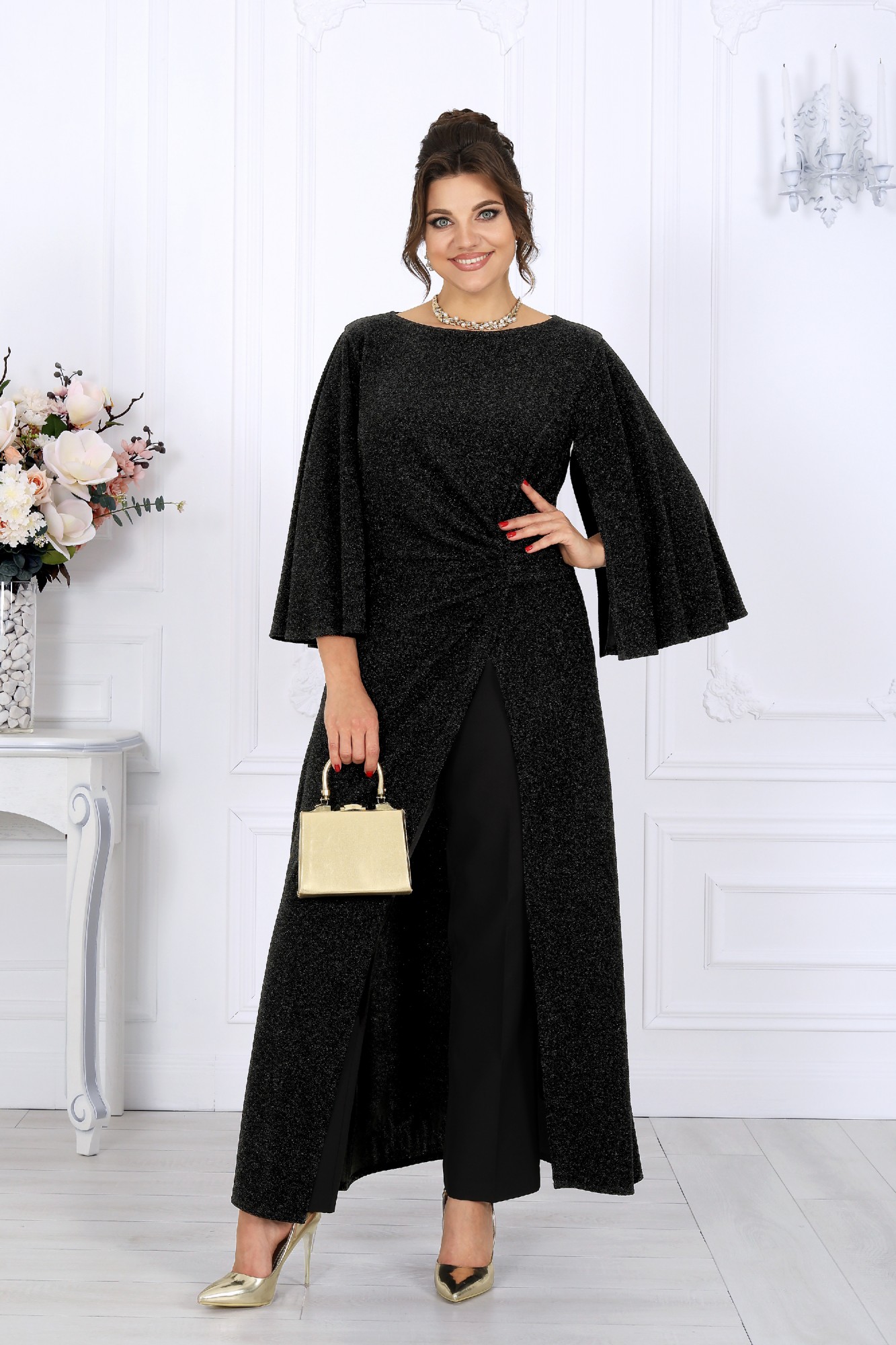 Этот элегантный костюм-двойка создан для женщин, которые ценят комфорт и изысканность в равной мере. Он словно приглашает сиять — мягкий блеск люрекса переливается в свете вечерних огней, создавая атмосферу праздника даже в обычный день. Туника свободно струится по фигуре, легко скрывая всё лишнее и подчеркивая достоинства. Драпировка по линии талии формирует красивый силуэт «песочных часов», а асимметричный запах добавляет образу динамики и утончённости. Эффектные рукава придают наряду торжественность, сохраняя при этом абсолютную лёгкость движений. Каждая деталь продумана до мелочей — от мягкой подкладки, обеспечивающей комфорт, до аккуратной потайной застёжки, сохраняющей чистоту линий. Этот наряд универсален: он уместен на праздничном приёме, корпоративе или ужине в ресторане, а также станет идеальным выбором для торжественных семейных событий. В нём комфортно, уверенно и красиво — именно так выглядит настоящая женственность в современном прочтении. Комплект брючный 2-х предметный, состоящий из туники и брюк. Туника полуприлегающего силуэта с расширением к низу, выполнена из трикотажного полотна с фактурной лицевой стороной «люрекс». Модель отрезная по линии талии; верхняя часть переда и спинки (лиф) на трикотажной подкладке. Лиф переда с одним рельефным швом, направленным от левой проймы; нижняя часть переда состоит из двух деталей, скрепленных на запах. По линии талии, вдоль рельефа, перед задрапирован сборкой и односторонними складками. На спинке обработаны таллиевые вытачки и средний шов с застежкой на потайную тесьму-«молнию» (50 см). Вырез горловины спинки и переда формы «лодочка». Рукав без шва, с отлетными краями; крепится к пройме только в верхней части. Брюки классические, длинные, с посадкой на талии, выполнены из костюмно- плательной ткани. Модель со стрелками. Передние и задние половинки брюк с таллиевыми вытачками, направленными от пояса вниз. Спереди обработаны наклонные боковые карманы и центральная застёжка на тесьму-«молнию». Притачной пояс застегивается на 1 петлю и 1 пуговицу; для лучшего прилегания по линии талии в притачном поясе предусмотрена эластичная лента, вставленная по спинке.