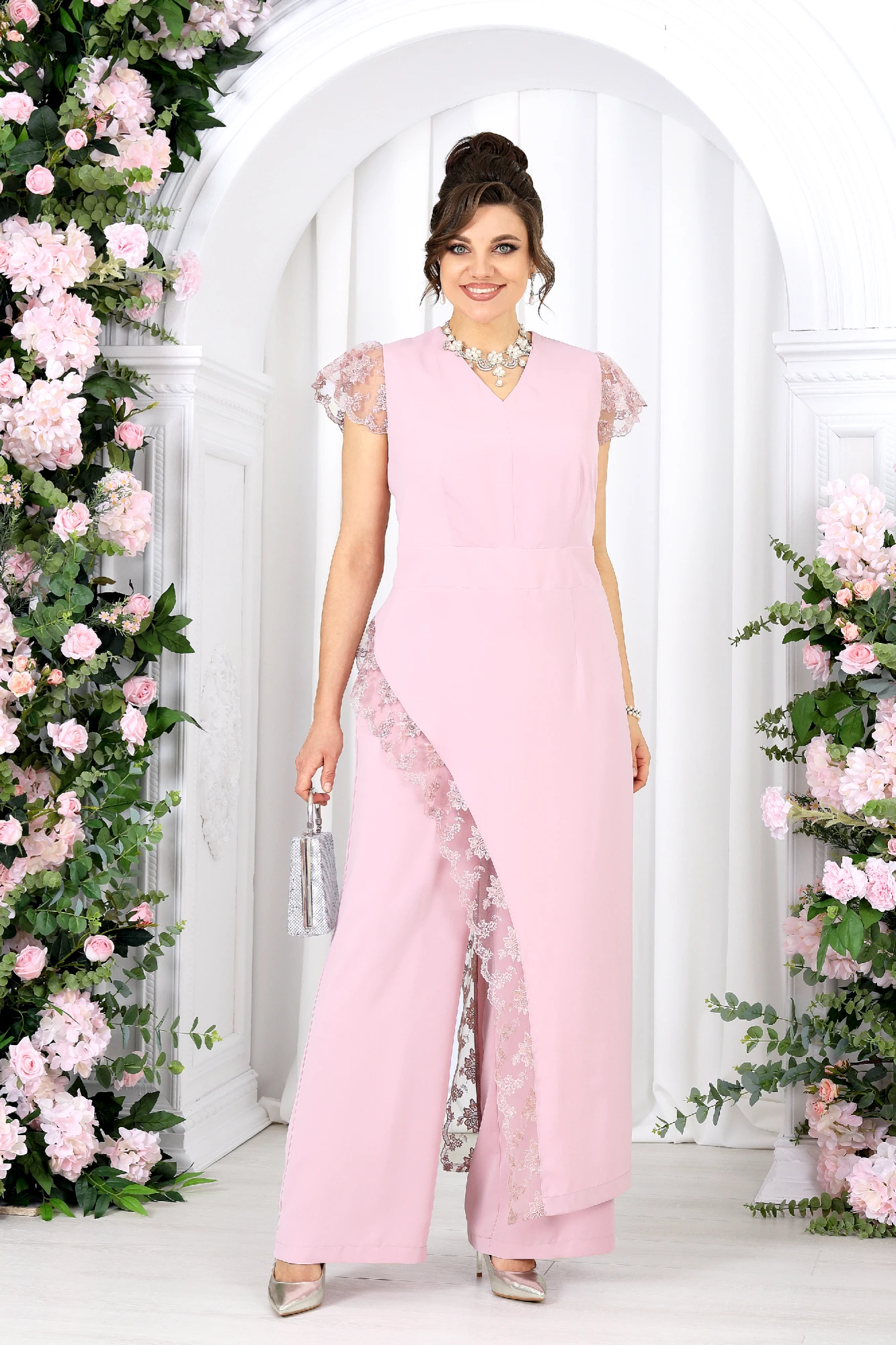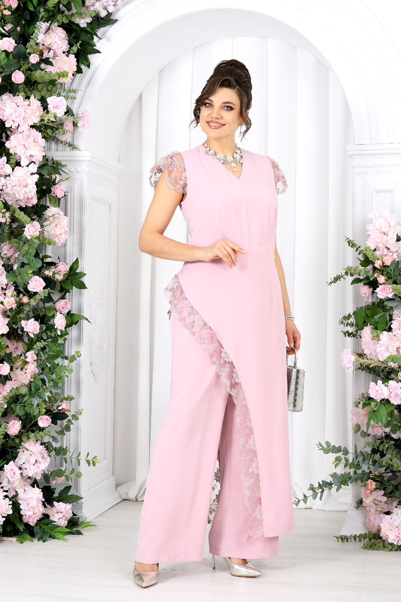 Брючный костюм с туникой — эффектное решение для особых случаев. Этот костюм создан для моментов, когда хочется выглядеть нарядно и чувствовать себя уверенно. Легкая асимметрия, утончённое кружево и мягкие линии силуэта создают гармоничный, женственный образ с характером. Туника плавно струится по фигуре, подчеркивая талию и скрывая нюансы, а декоративное кружево добавляет глубины и изящества. Каждый шаг в этом образе — про уверенность, легкость и внутренний комфорт. Брюки дополняют комплект, создавая вытянутый, стройный силуэт и делая образ завершенным и сбалансированным. Костюмно-плательная ткань держит форму, при этом остается комфортной и приятной к телу. Она красиво драпируется, не утяжеляет силуэт и сохраняет аккуратный вид в течение всего дня или вечера. Комплект брючный 2-х предметный, состоящий из туники и брюк. Туника полуприлегающего силуэта, выполнена из костюмно-плательной ткани. Модель без подкладки, в левом боковом потайная молния. По спинке горловина округлой формы, а по переду V – образная, обработана обтачкой. Туника отрезная по линии талии. Лиф туники и нижняя часть соединены по талии притачным поясом. На полочке и спинке обработаны таллиевые вытачки. Боковые швы блузы ассиметричны, правый боковой фигурной формы и в качестве отделки по краю среза использовано кружево. Рукава «крылышки» из кружева. Длина туники (спинка) – 138 см (50-58 р-р). Брюки, длинные, с посадкой на талии, выполнены из костюмно-плательной ткани. Модель без стрелок. Передние и задние половинки брюк с таллиевыми вытачками, направленными от пояса вниз. Спереди обработаны наклонные боковые карманы и центральная застёжка на тесьму-«молнию». Притачной пояс застегивается на 1 петлю и 1 пуговицу; для лучшего прилегания по линии талии в притачном поясе предусмотрена эластичная лента, вставленная по спинке. Длина брюк по боковому (с поясом) –107 см (50-52 р-р), 108 см (54-58 р-р).