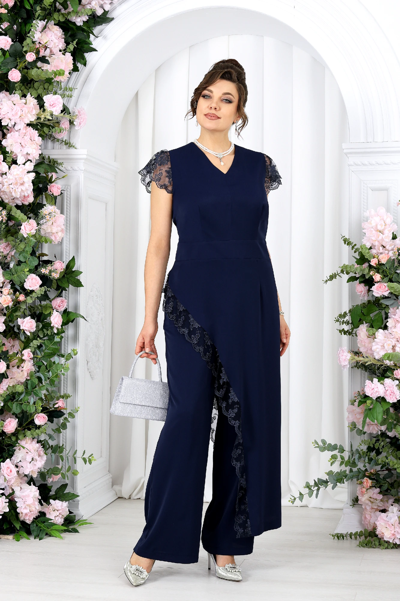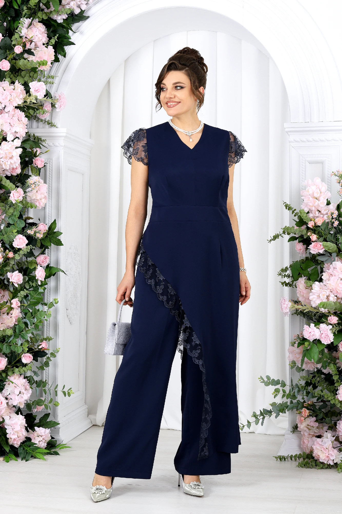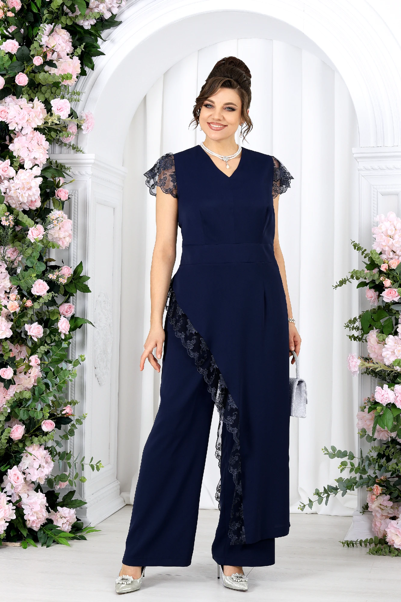Брючный костюм с туникой — эффектное решение для особых случаев. Этот костюм создан для моментов, когда хочется выглядеть нарядно и чувствовать себя уверенно. Легкая асимметрия, утончённое кружево и мягкие линии силуэта создают гармоничный, женственный образ с характером. Туника плавно струится по фигуре, подчеркивая талию и скрывая нюансы, а декоративное кружево добавляет глубины и изящества. Каждый шаг в этом образе — про уверенность, легкость и внутренний комфорт. Брюки дополняют комплект, создавая вытянутый, стройный силуэт и делая образ завершенным и сбалансированным. Костюмно-плательная ткань держит форму, при этом остается комфортной и приятной к телу. Она красиво драпируется, не утяжеляет силуэт и сохраняет аккуратный вид в течение всего дня или вечера. Комплект брючный 2-х предметный, состоящий из туники и брюк. Туника полуприлегающего силуэта, выполнена из костюмно-плательной ткани. Модель без подкладки, в левом боковом потайная молния. По спинке горловина округлой формы, а по переду V – образная, обработана обтачкой. Туника отрезная по линии талии. Лиф туники и нижняя часть соединены по талии притачным поясом. На полочке и спинке обработаны таллиевые вытачки. Боковые швы блузы ассиметричны, правый боковой фигурной формы и в качестве отделки по краю среза использовано кружево. Рукава «крылышки» из кружева. Длина туники (спинка) – 138 см (50-58 р-р). Брюки, длинные, с посадкой на талии, выполнены из костюмно-плательной ткани. Модель без стрелок. Передние и задние половинки брюк с таллиевыми вытачками, направленными от пояса вниз. Спереди обработаны наклонные боковые карманы и центральная застёжка на тесьму-«молнию». Притачной пояс застегивается на 1 петлю и 1 пуговицу; для лучшего прилегания по линии талии в притачном поясе предусмотрена эластичная лента, вставленная по спинке. Длина брюк по боковому (с поясом) –107 см (50-52 р-р), 108 см (54-58 р-р).