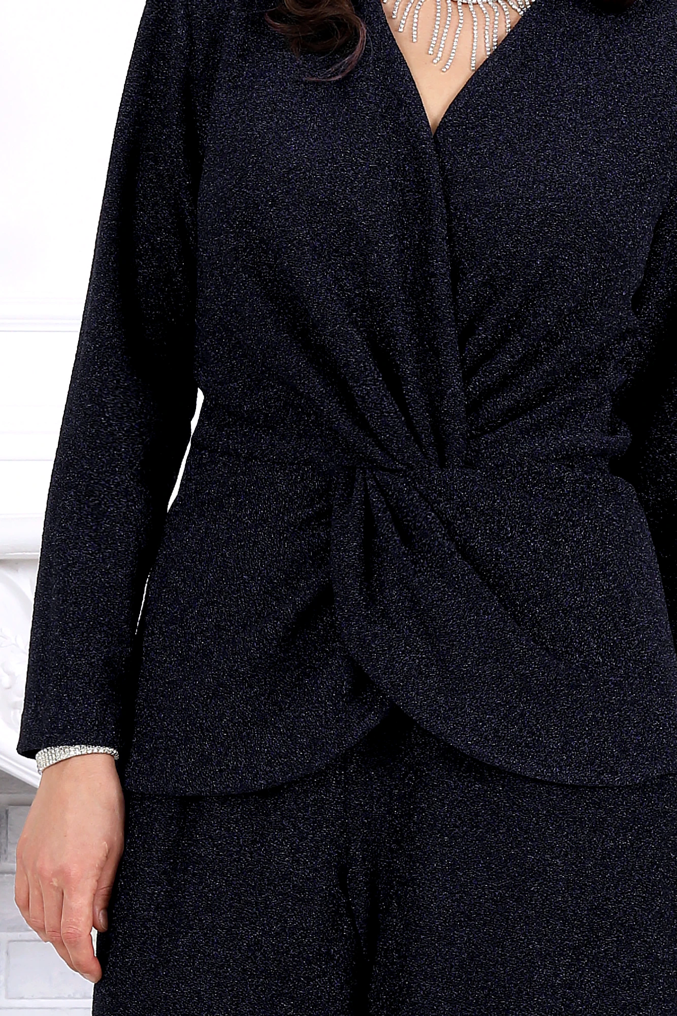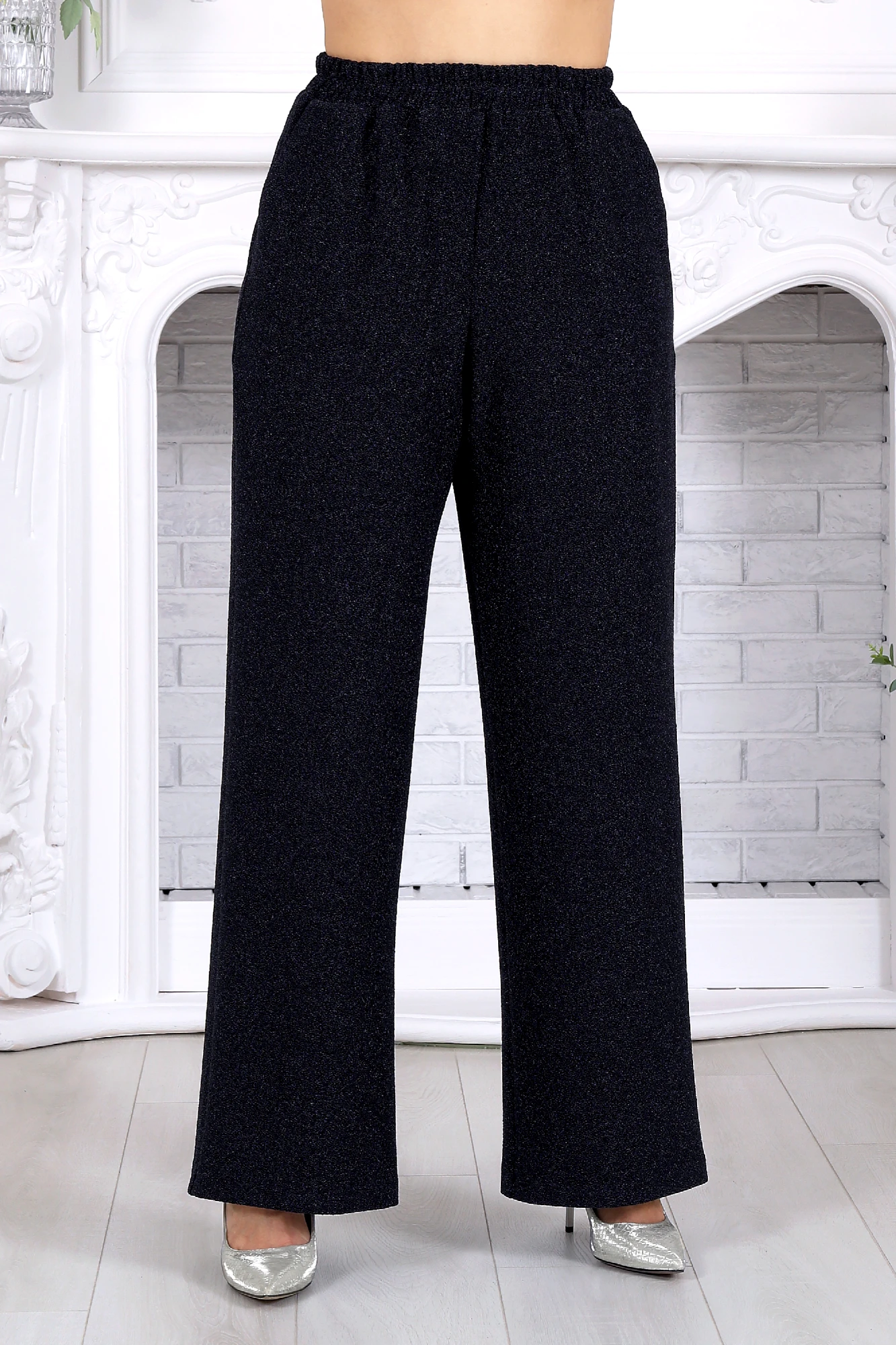 Нарядный брючный костюм — когда комфорт встречается с эффектом. Этот костюм словно создан для моментов, когда хочется выглядеть особенно — уверенно, элегантно и чуть сияюще. Лаконичный силуэт, мягкий блеск люрекса и продуманная посадка делают образ выразительным без перегрузки. Блузка с имитацией запаха и изящной драпировкой «перекрут» деликатно подчеркивает талию, создавая красивую, женственную линию. V-образный вырез вытягивает силуэт, а мягкий трикотаж бережно повторяет движения, не сковывая и не утяжеляя образ. Брюки продолжают эту идею — свободные, струящиеся, с удобной посадкой на талии и эластичным поясом, они дарят ощущение легкости и уверенности на протяжении всего дня. Комплект брючный 2-х предметный, состоящий из блузки и брюк. Блузка полуприлегающего силуэта, выполнена из трикотажного полотна с фактурной лицевой стороной «люрекс». Модель на трикотажной подкладке, с длинным втачным рукавом и плечевыми накладками. Спинка с талиевыми вытачками и средним швом. Перед блузы с имитацией «запаха», отрезной по линии талии, по центру декорирован драпировкой «перекрут». Внизу полочки округлой формы. Горловина округлая по спине, V – образная спереди. Длина блузки – 64 см (50-58 р-р); длина рукава – 59 см (50-58 р-р). Брюки длинные, с посадкой на талии, выполнены из трикотажного полотна с фактурной лицевой стороной «люрекс». Модель без стрелок, без застежки. Спереди обработаны наклонные боковые карманы. Для лучшего прилегания по линии талии в притачном поясе предусмотрена широкая эластичная лента, вставленная по всей длине. Длина брюк по боковому (с поясом) –107 см (50-52 р-р), 108 см (54-58 р-р).